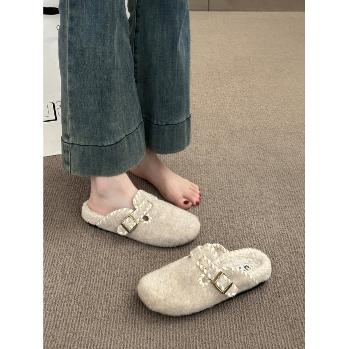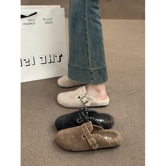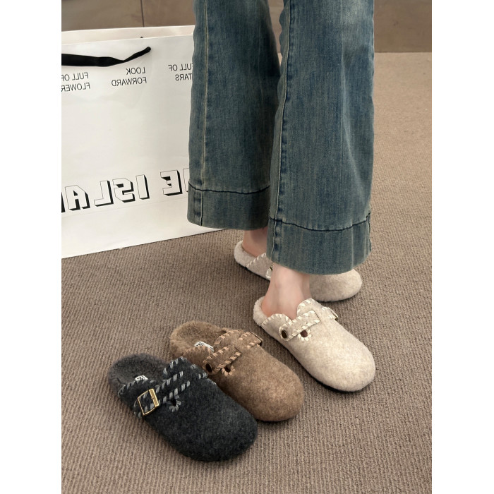 毛呢加絨勃肯鞋包頭半拖鞋女外穿2025秋冬新款一腳蹬厚底毛氈棉拖