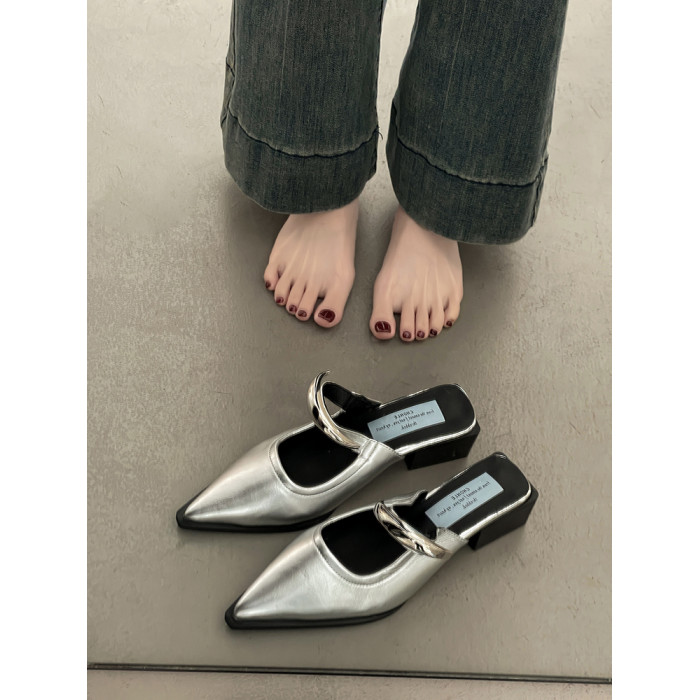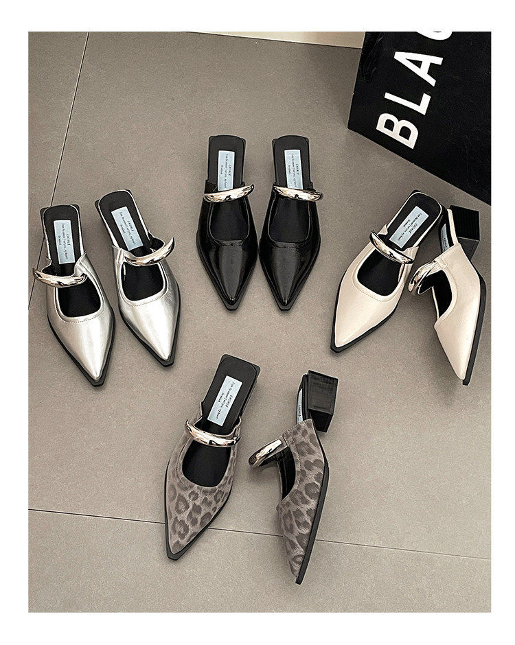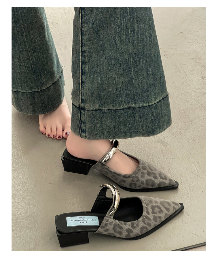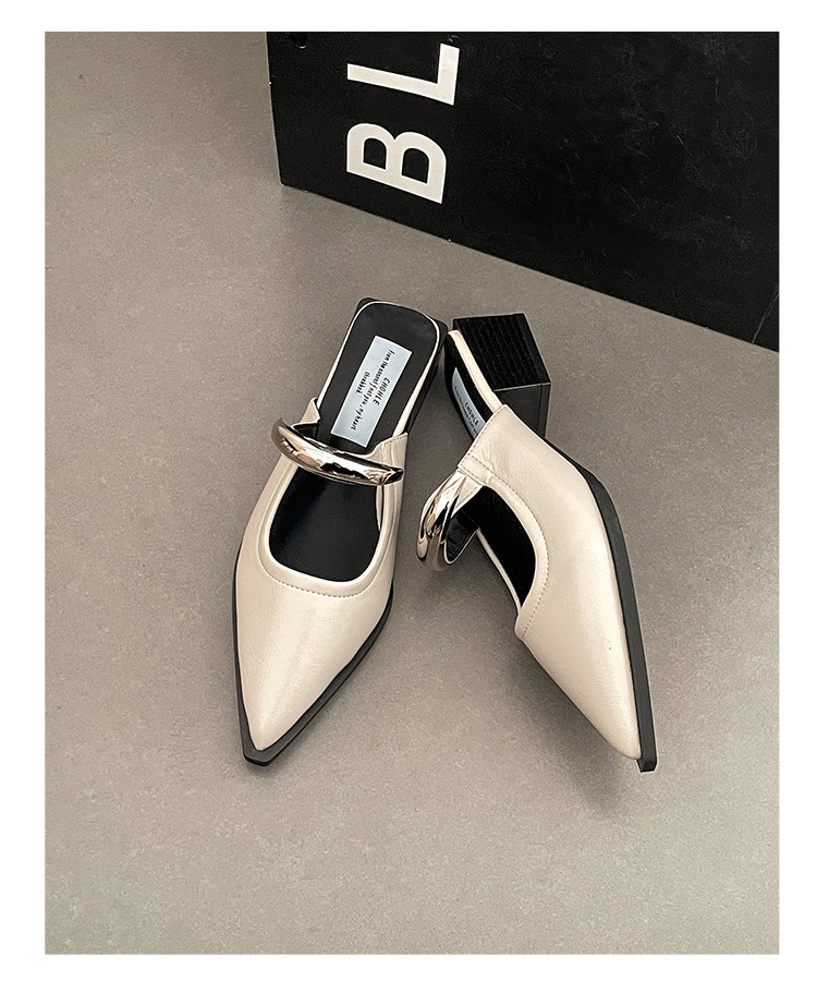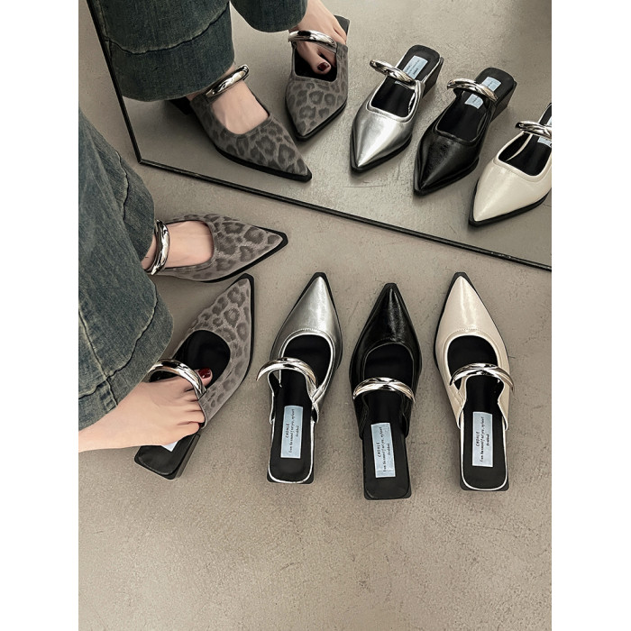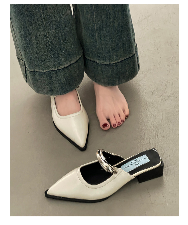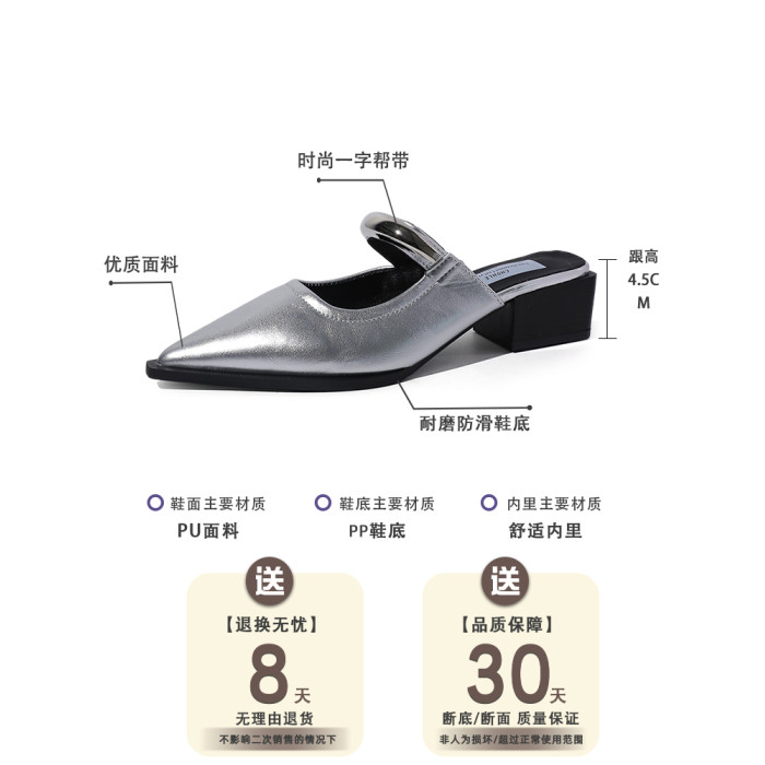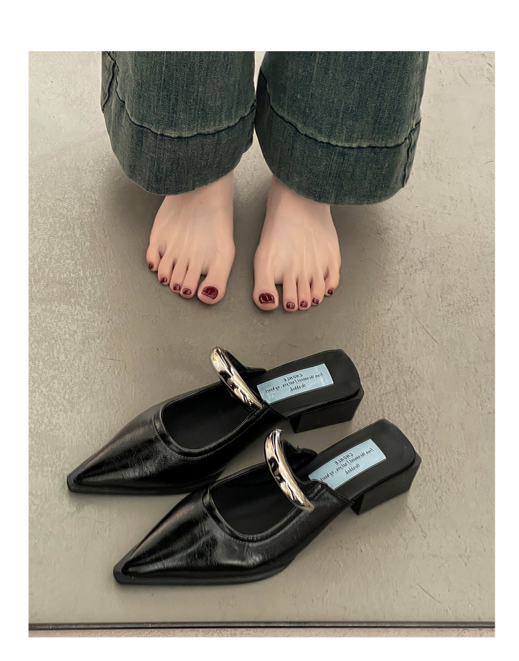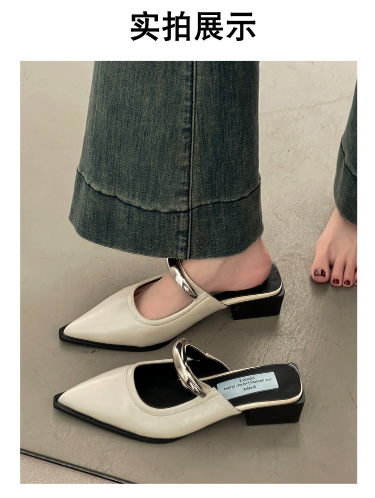 復古舒適尖頭金屬釦包頭半拖女2025春新款一腳蹬坡跟外穿穆勒涼拖