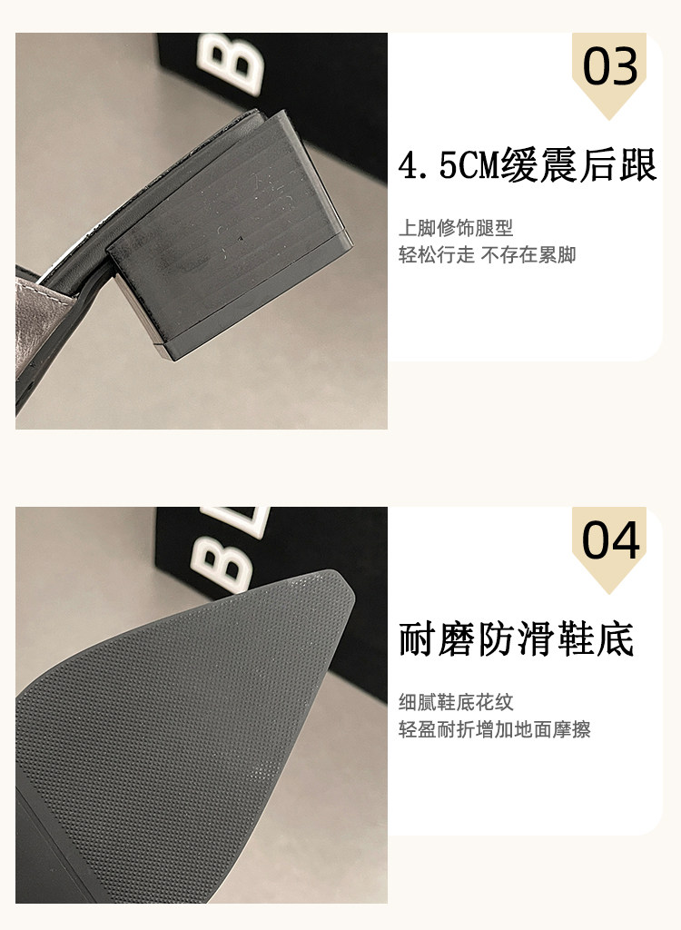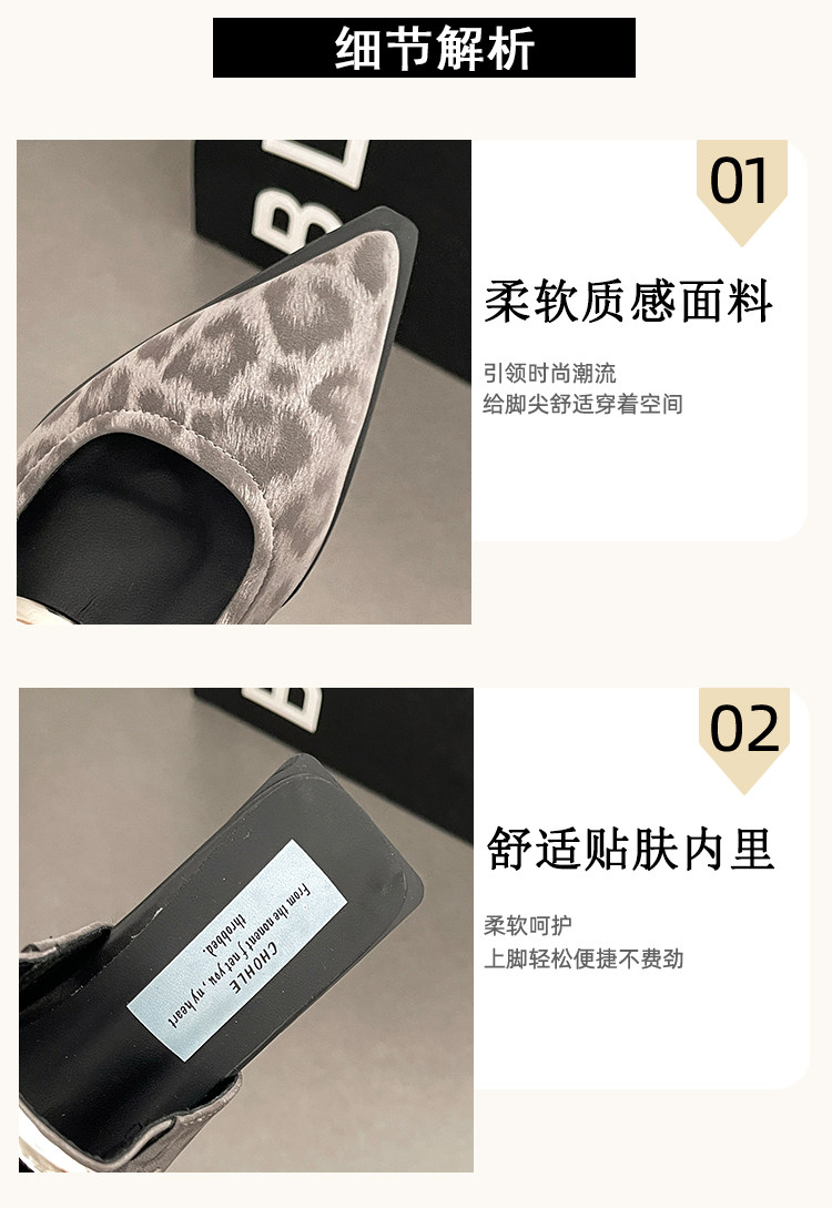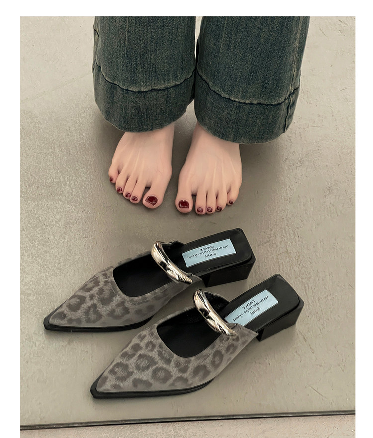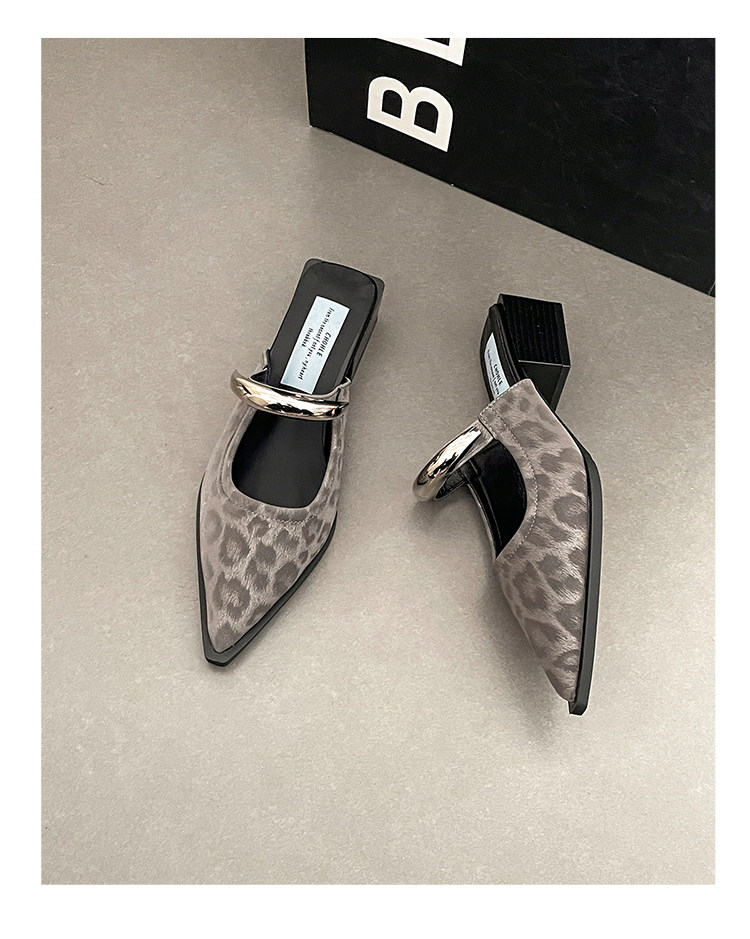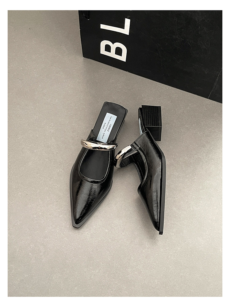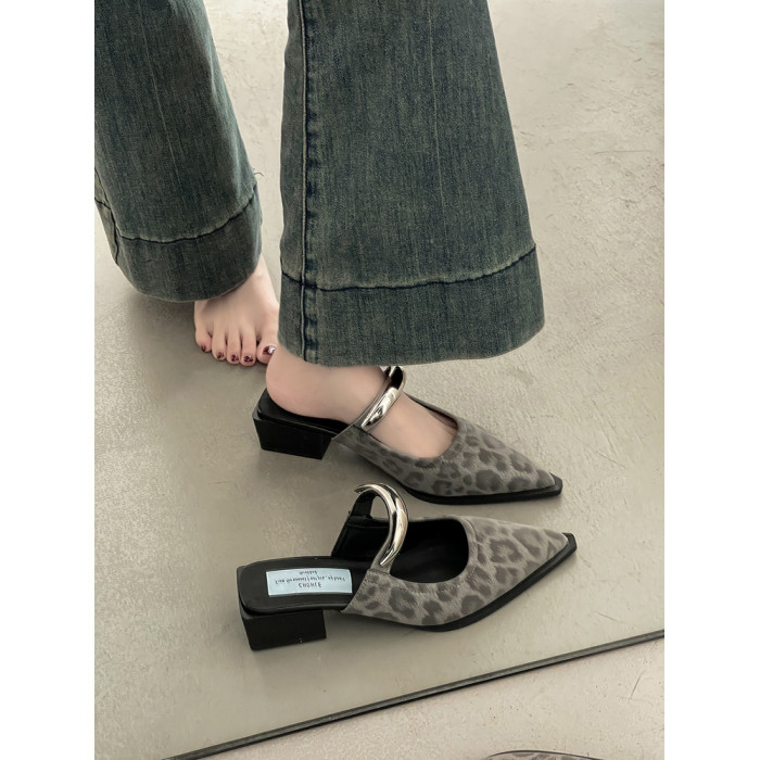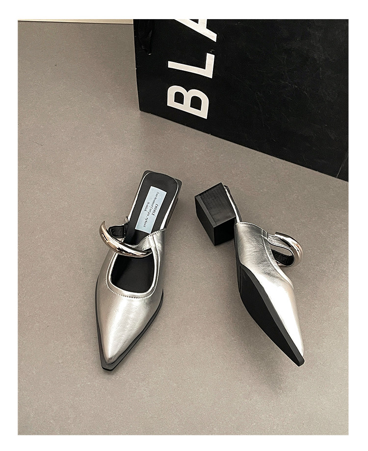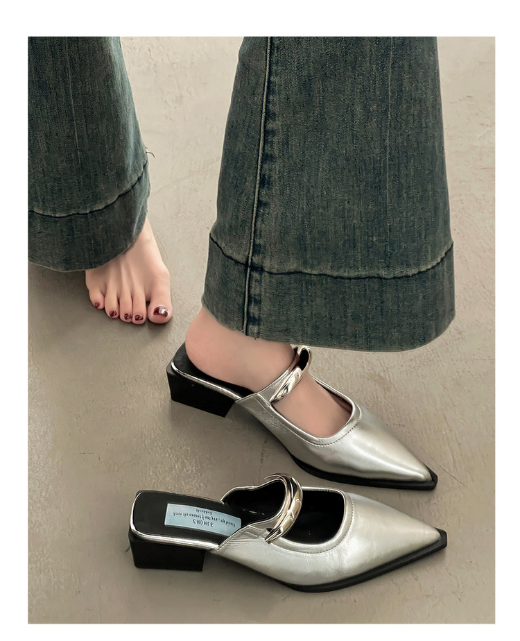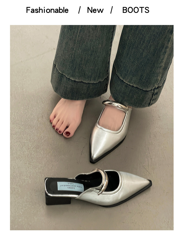 復古舒適尖頭金屬釦包頭半拖女2025春新款一腳蹬坡跟外穿穆勒涼拖