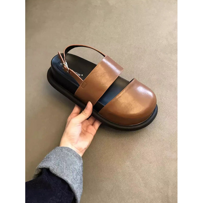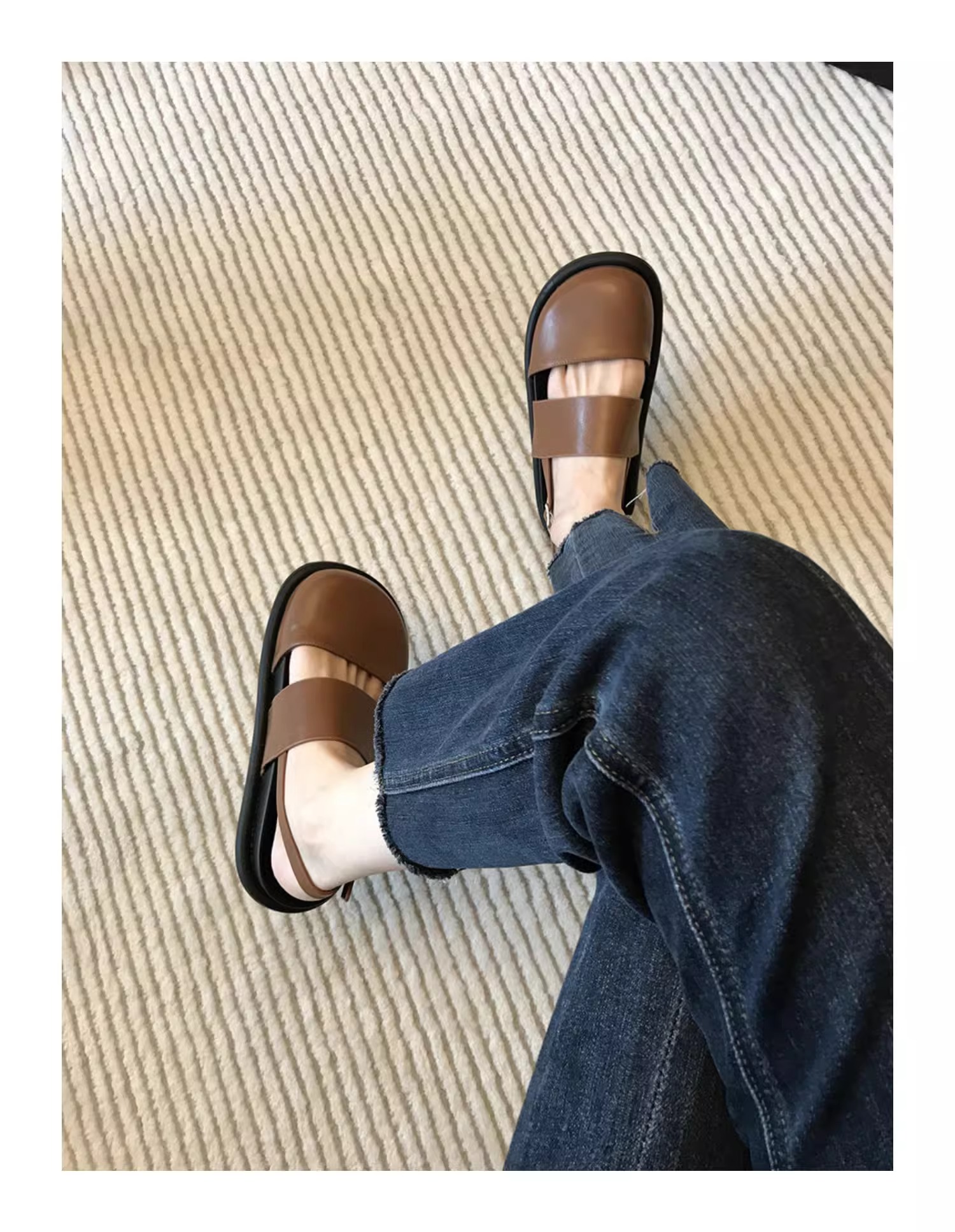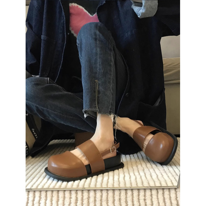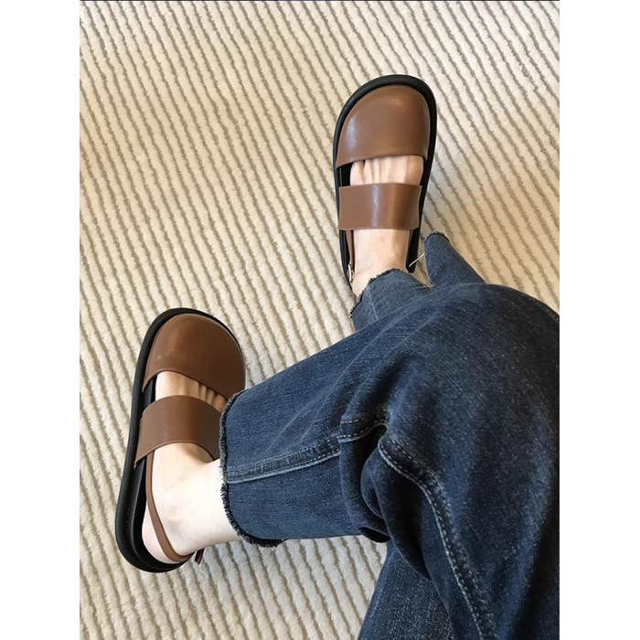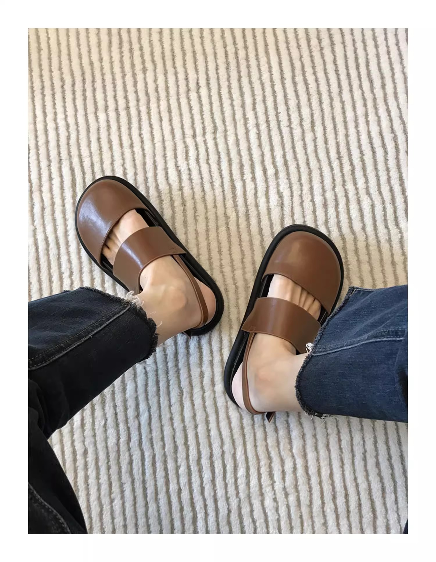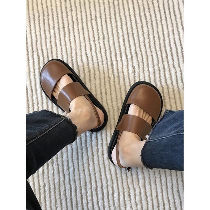 厚底包頭羅馬涼鞋女款夏季2025新款百搭棕色涼拖鞋圓頭醜萌勃肯鞋