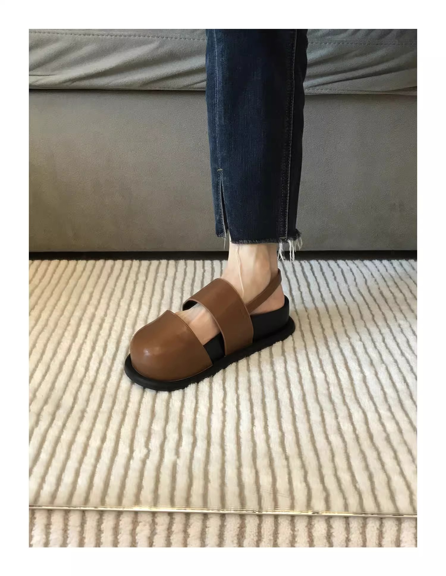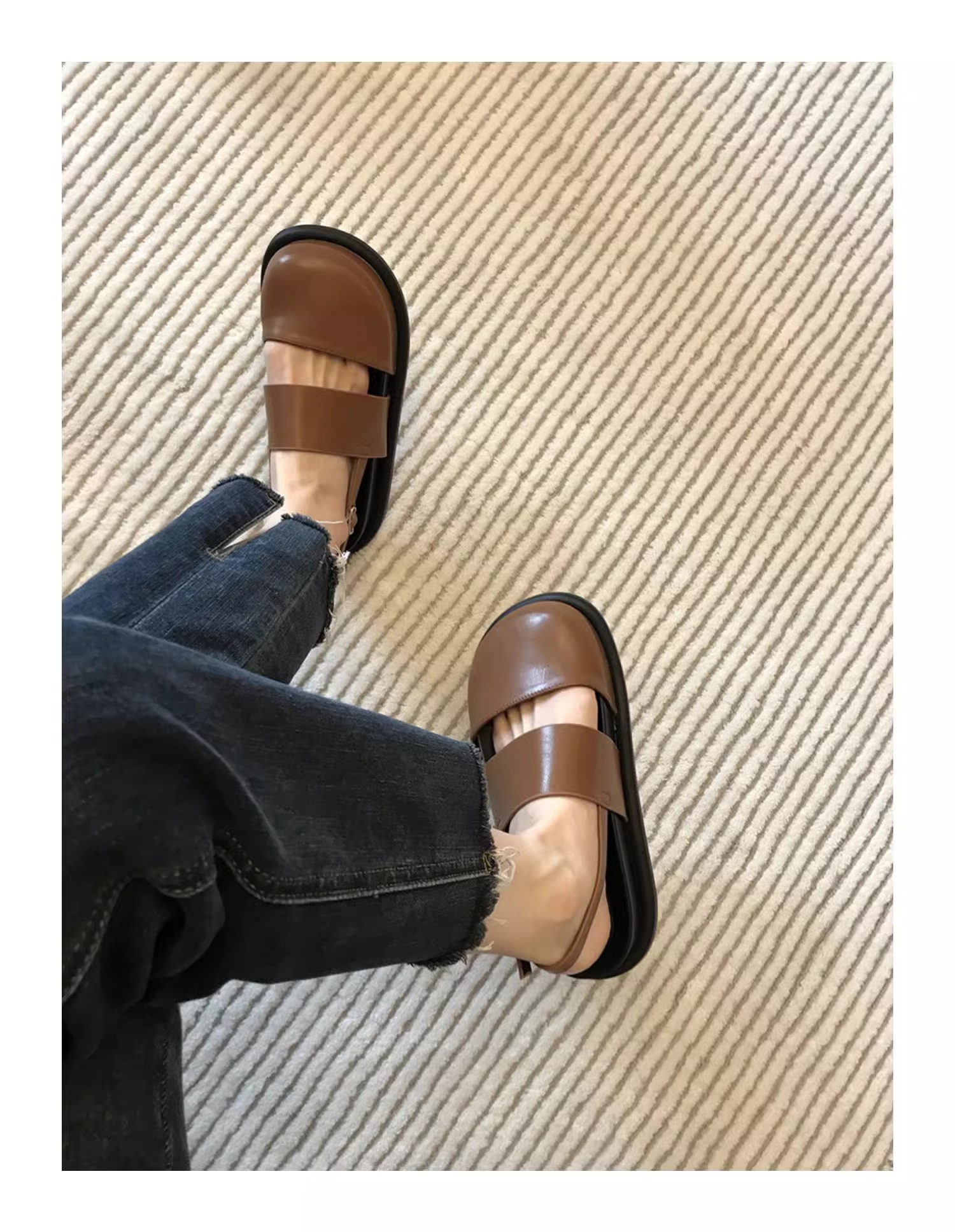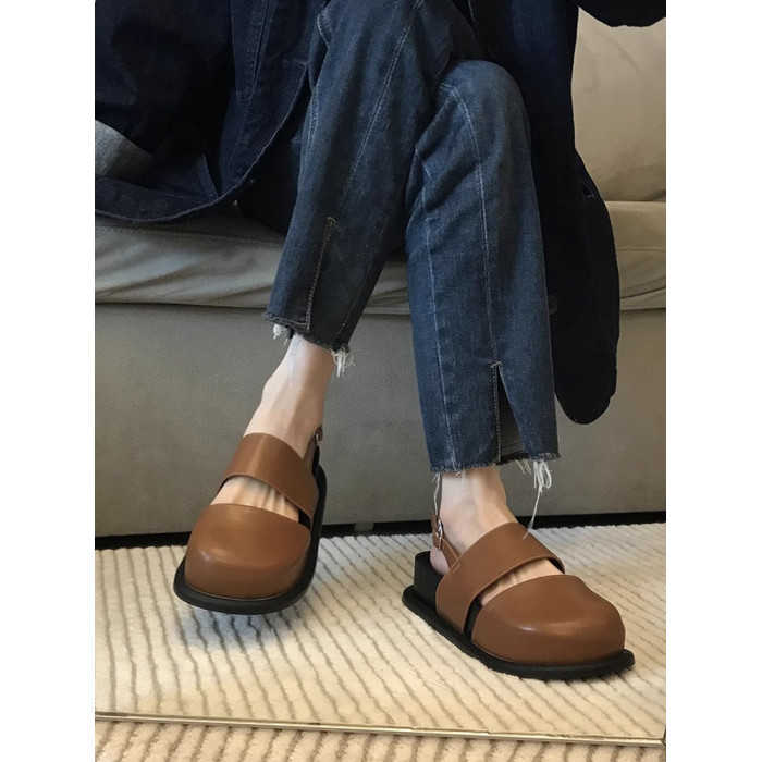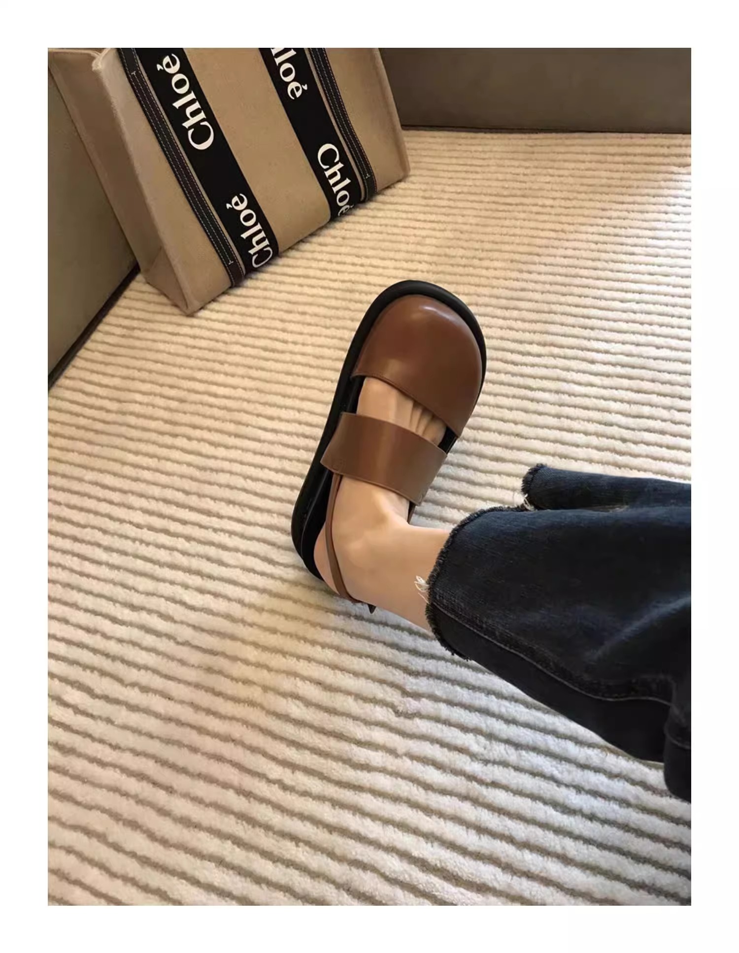 厚底包頭羅馬涼鞋女款夏季2025新款百搭棕色涼拖鞋圓頭醜萌勃肯鞋