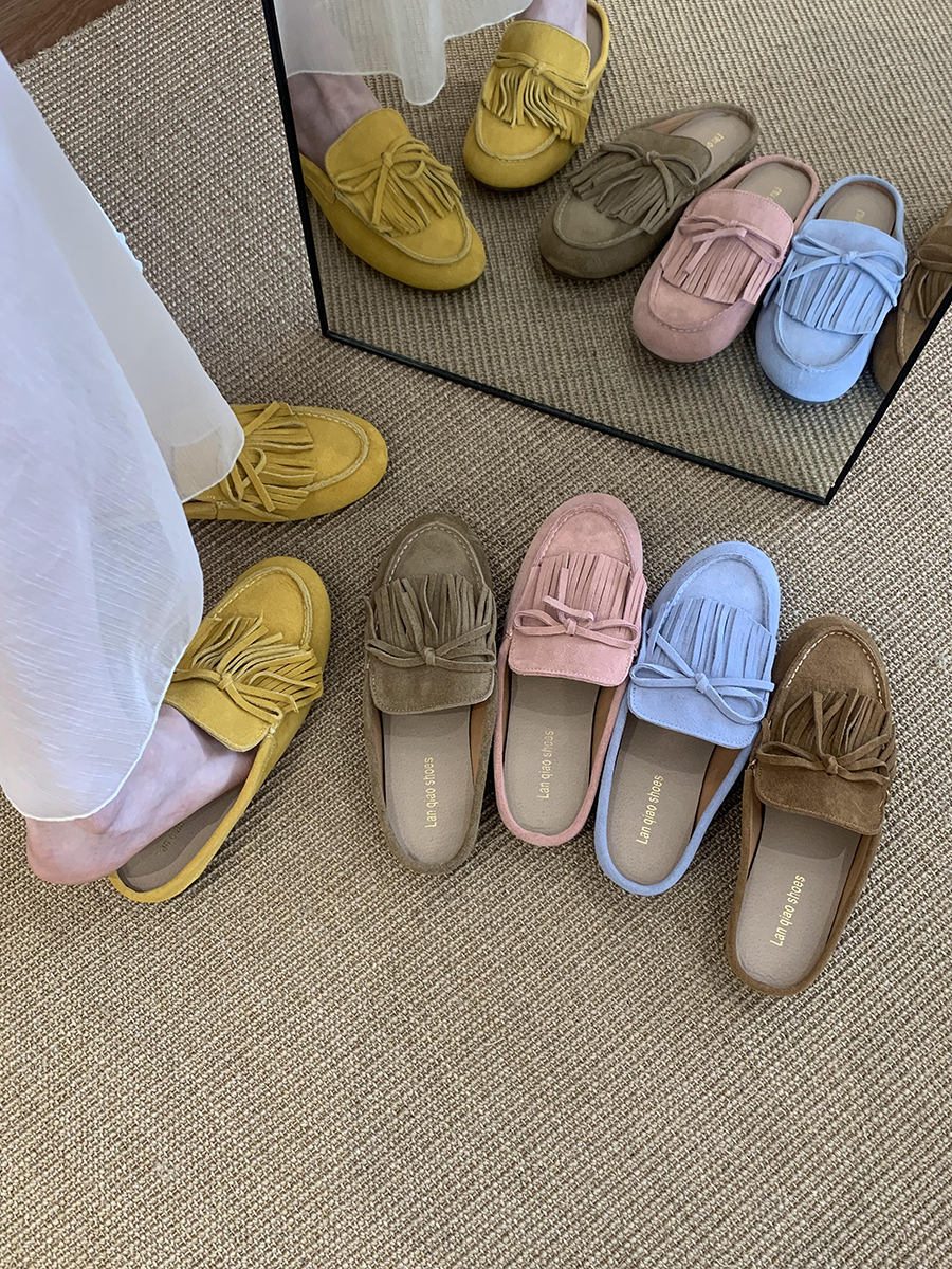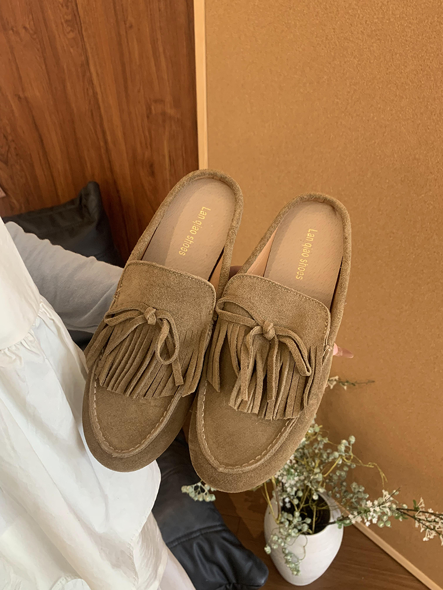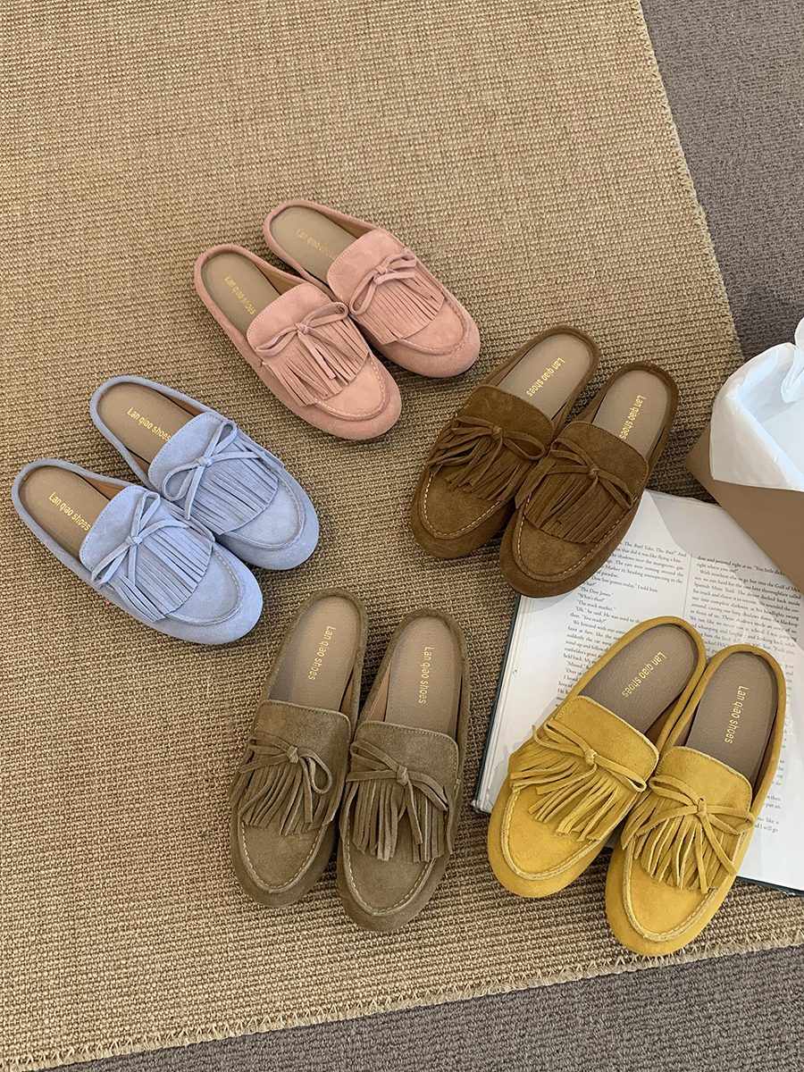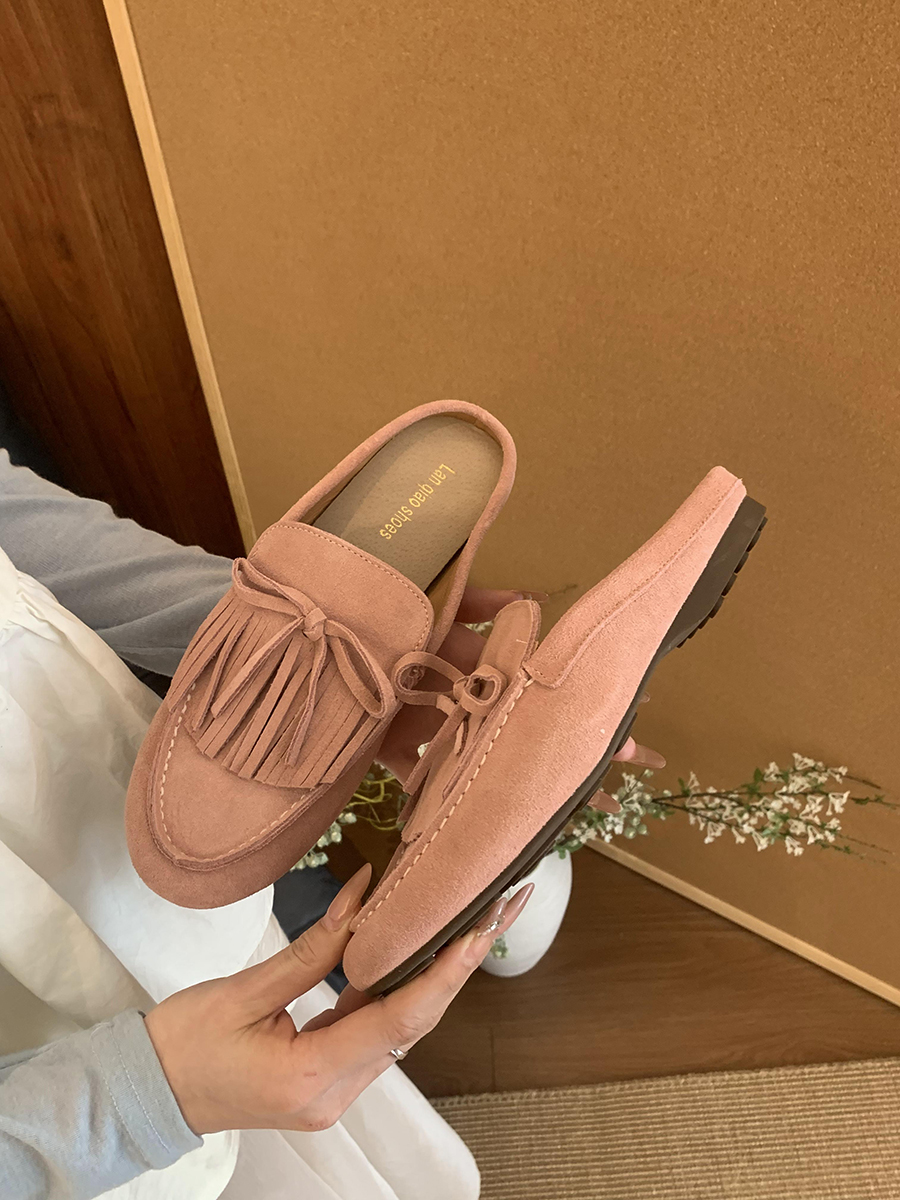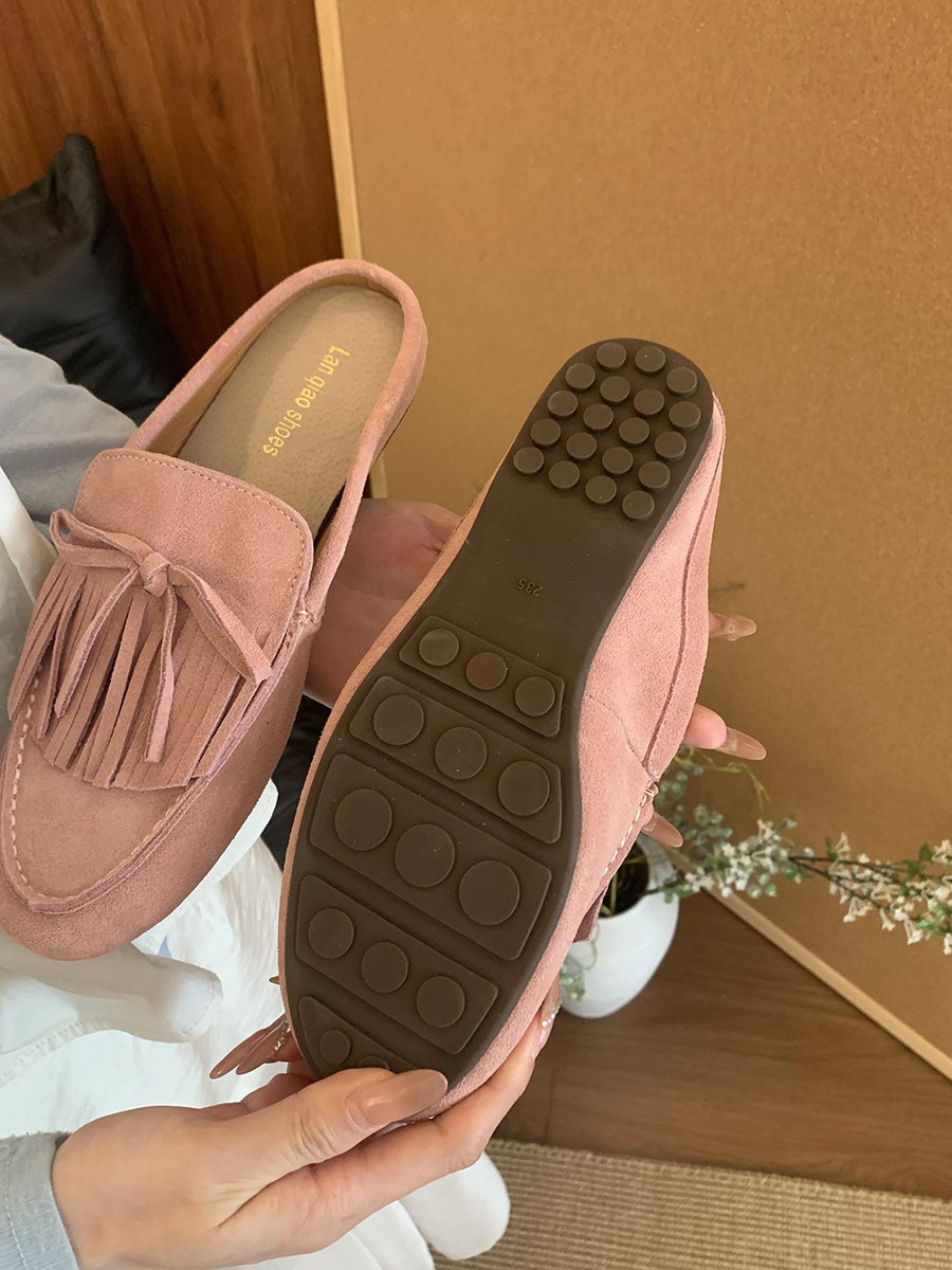 牛皮版!磨砂真皮包頭半拖鞋女外穿懶人一腳蹬休閒平底穆勒豆豆鞋