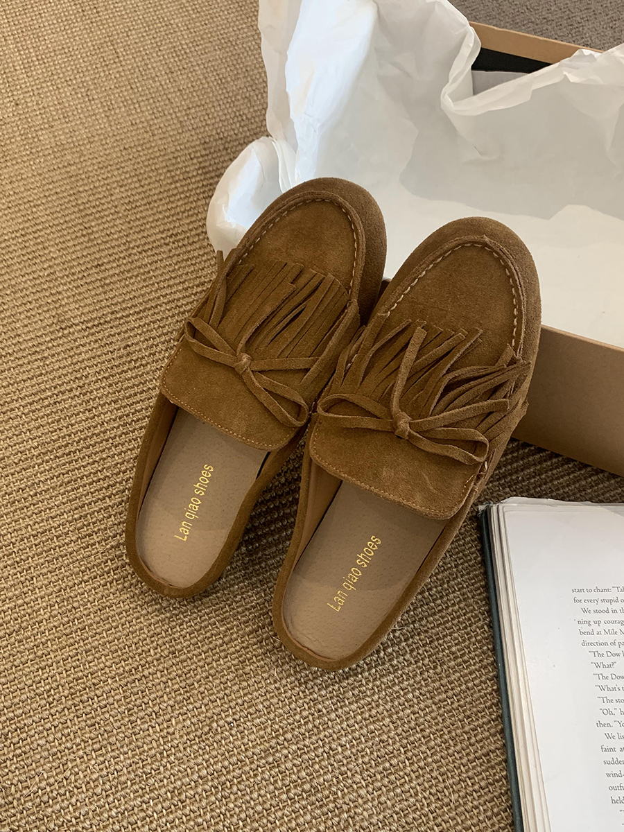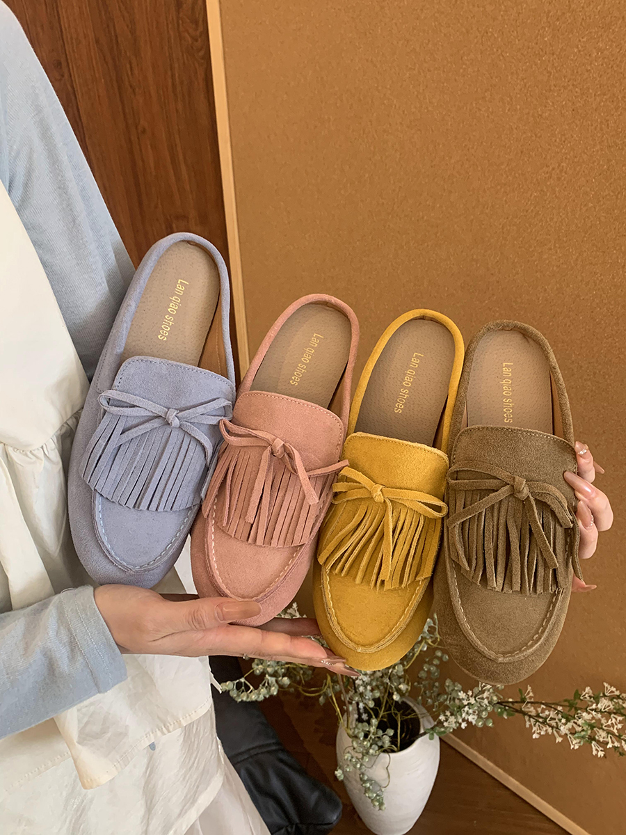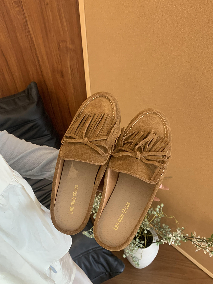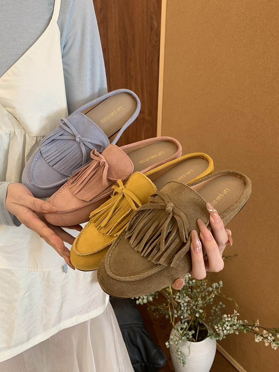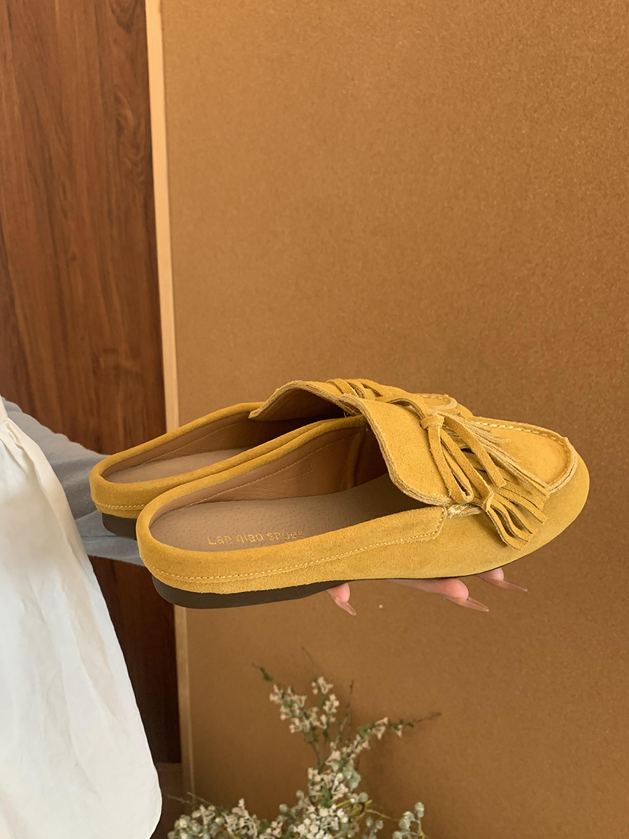 牛皮版!磨砂真皮包頭半拖鞋女外穿懶人一腳蹬休閒平底穆勒豆豆鞋
