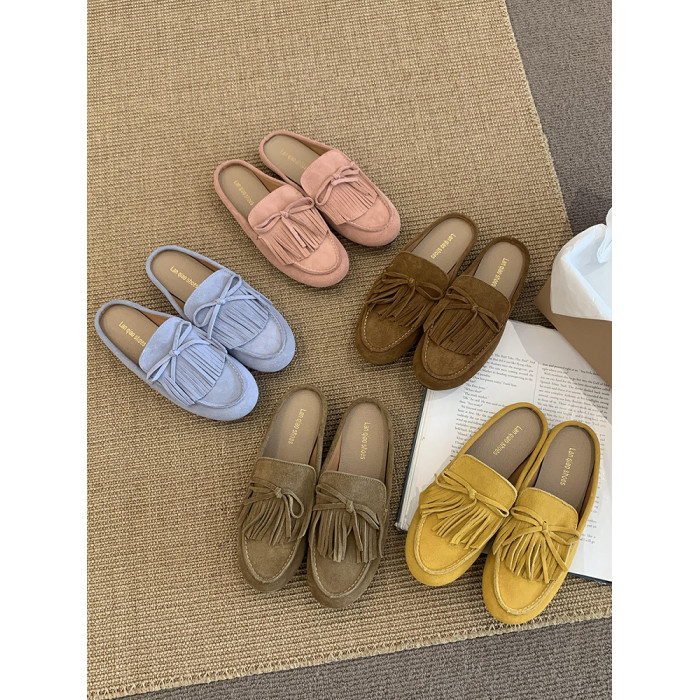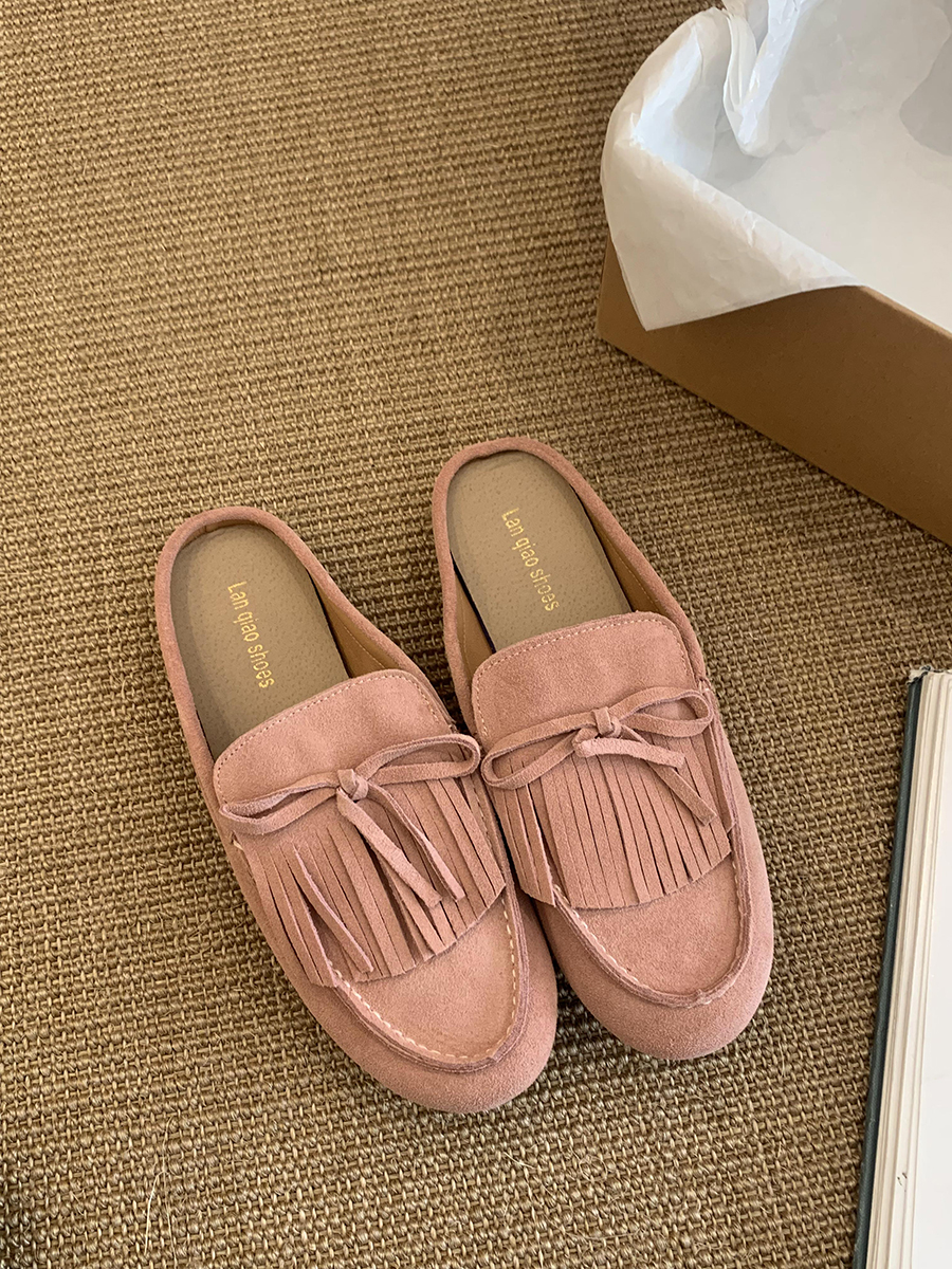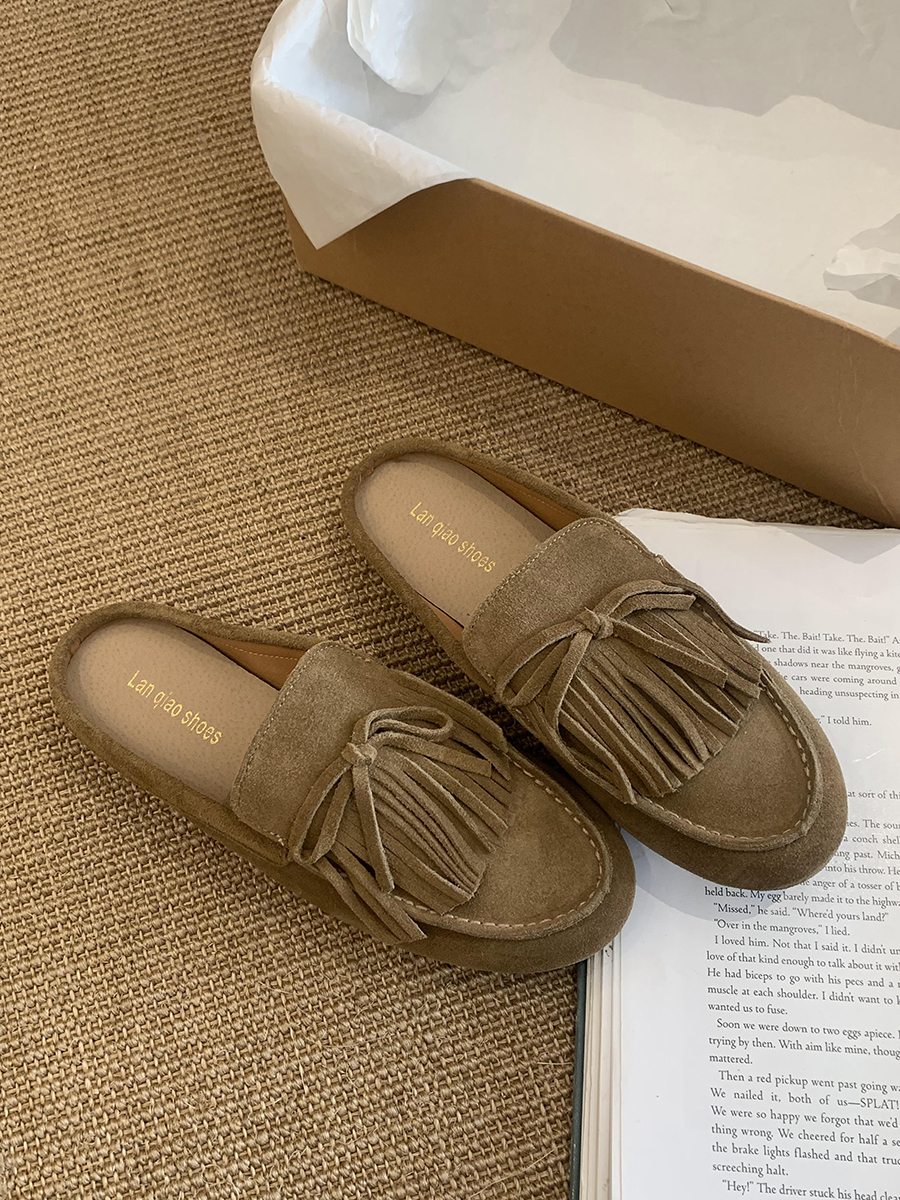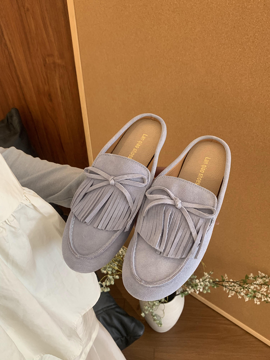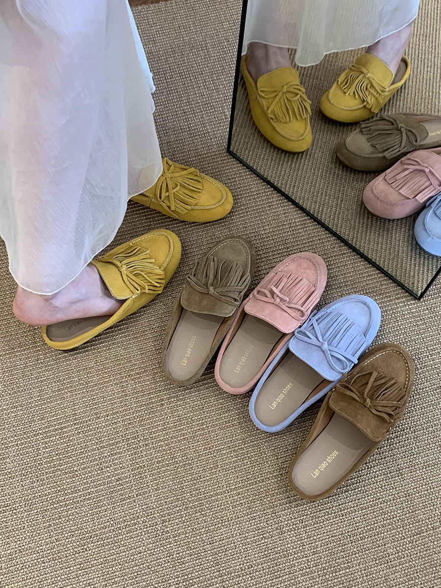 牛皮版!磨砂真皮包頭半拖鞋女外穿懶人一腳蹬休閒平底穆勒豆豆鞋