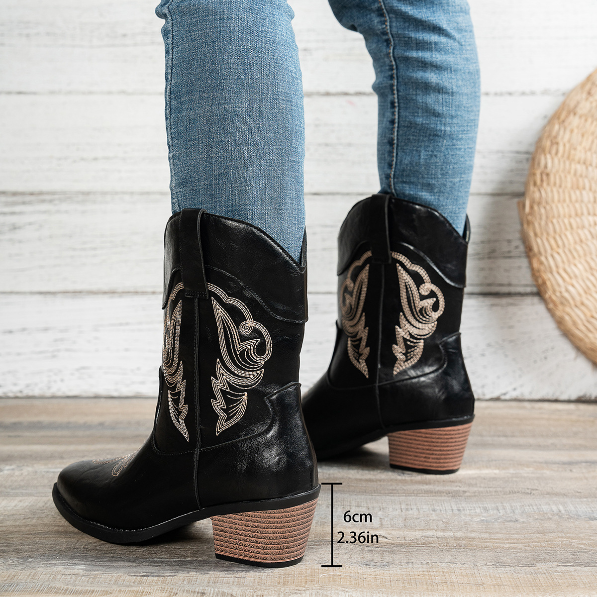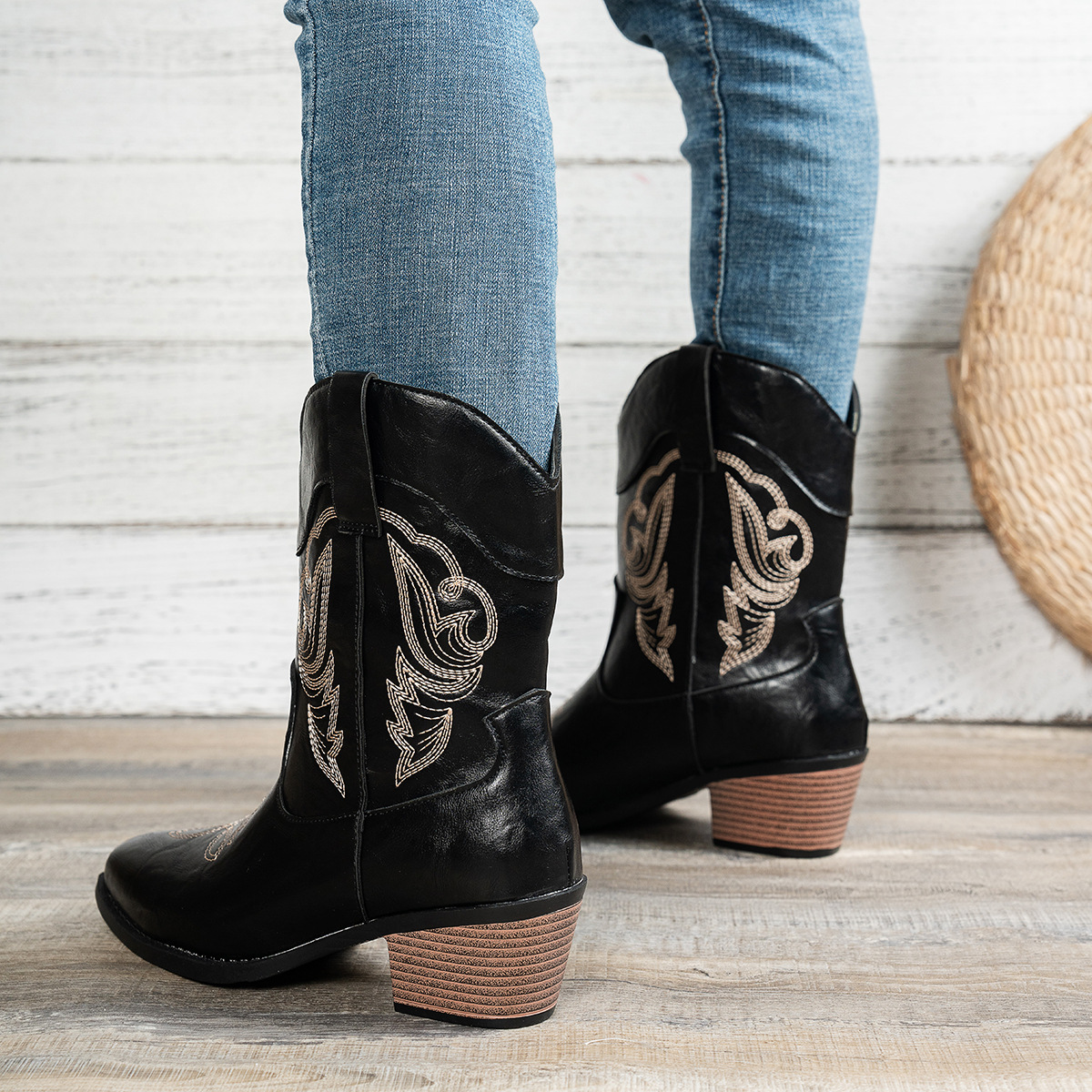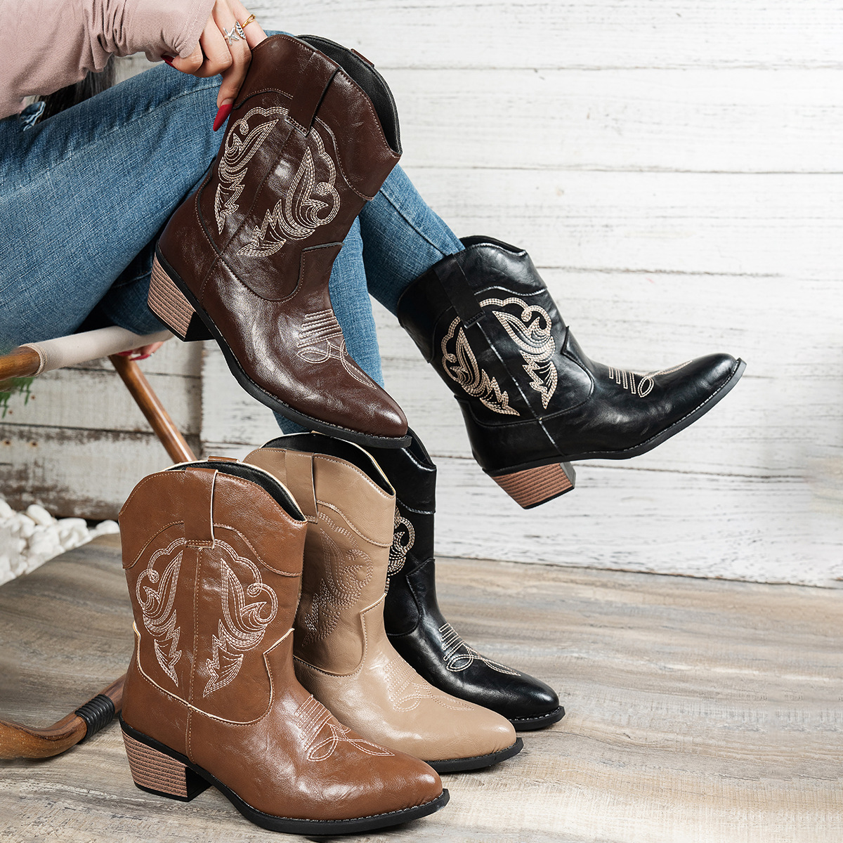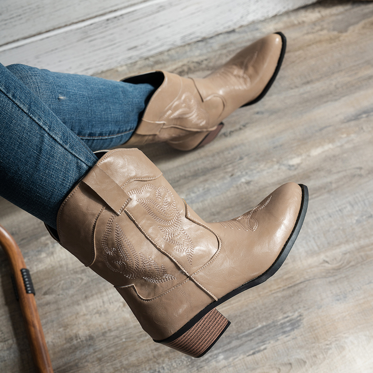 復古尖頭粗跟西部牛仔皮靴女新款百搭套腳大碼時裝馬丁靴