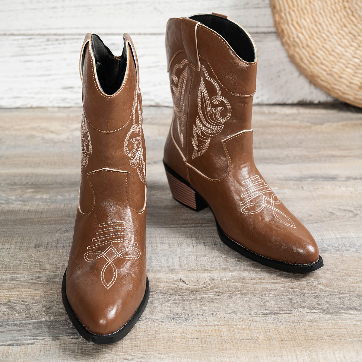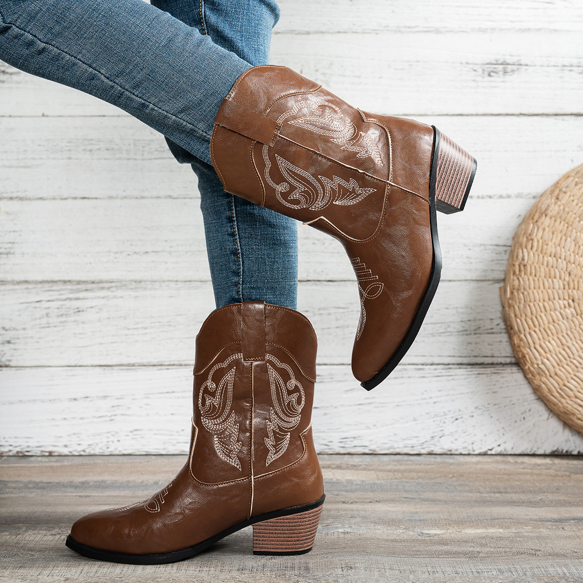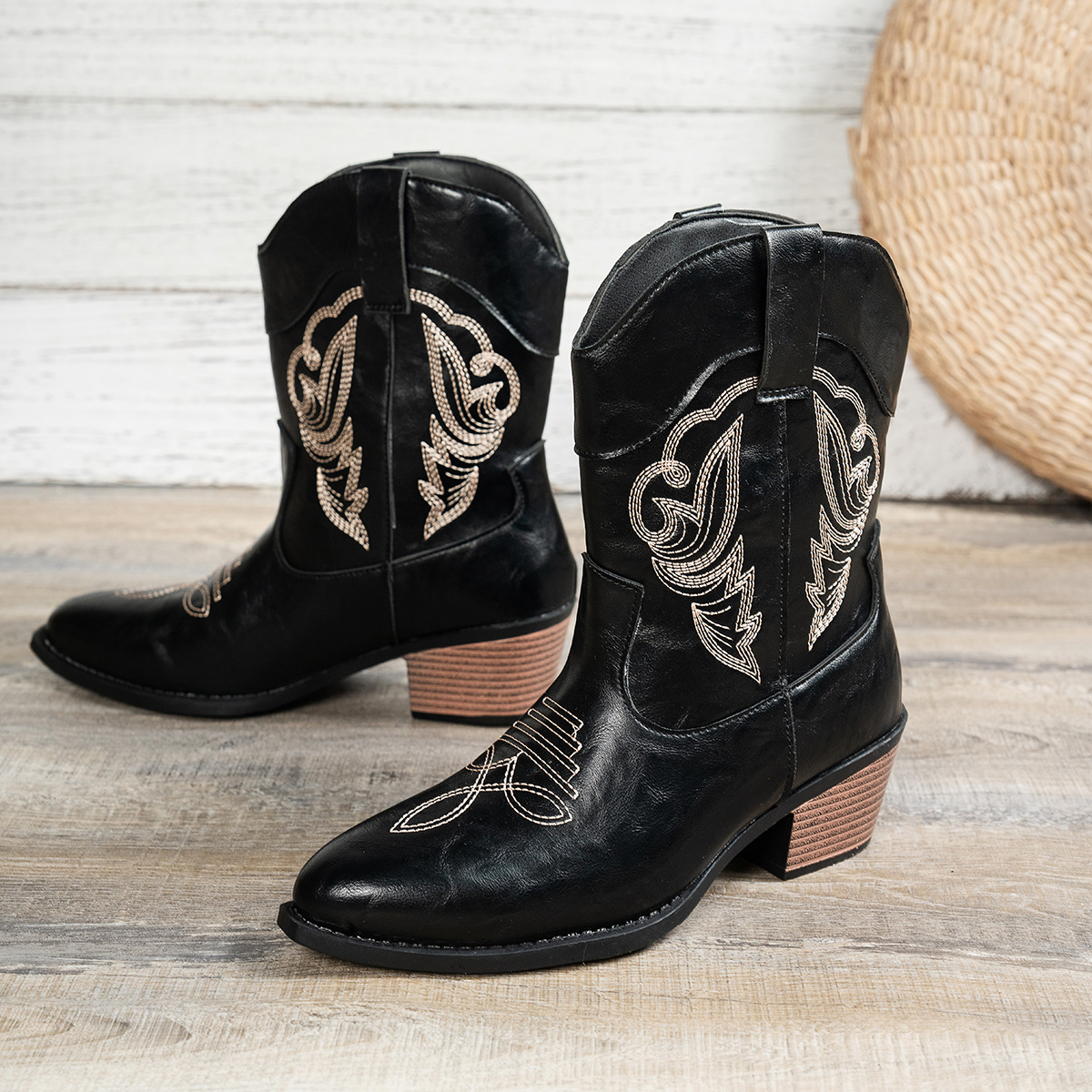復古尖頭粗跟西部牛仔皮靴女新款百搭套腳大碼時裝馬丁靴
