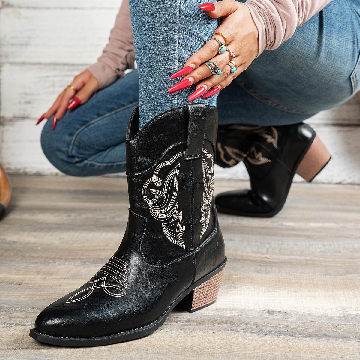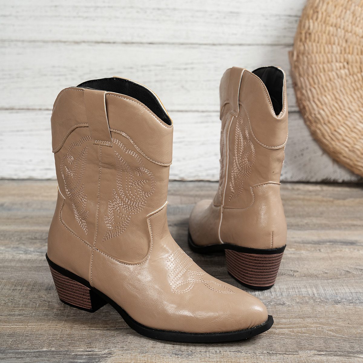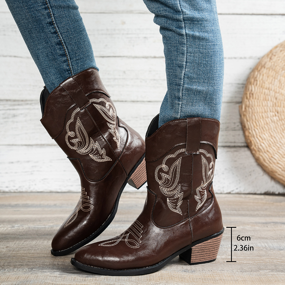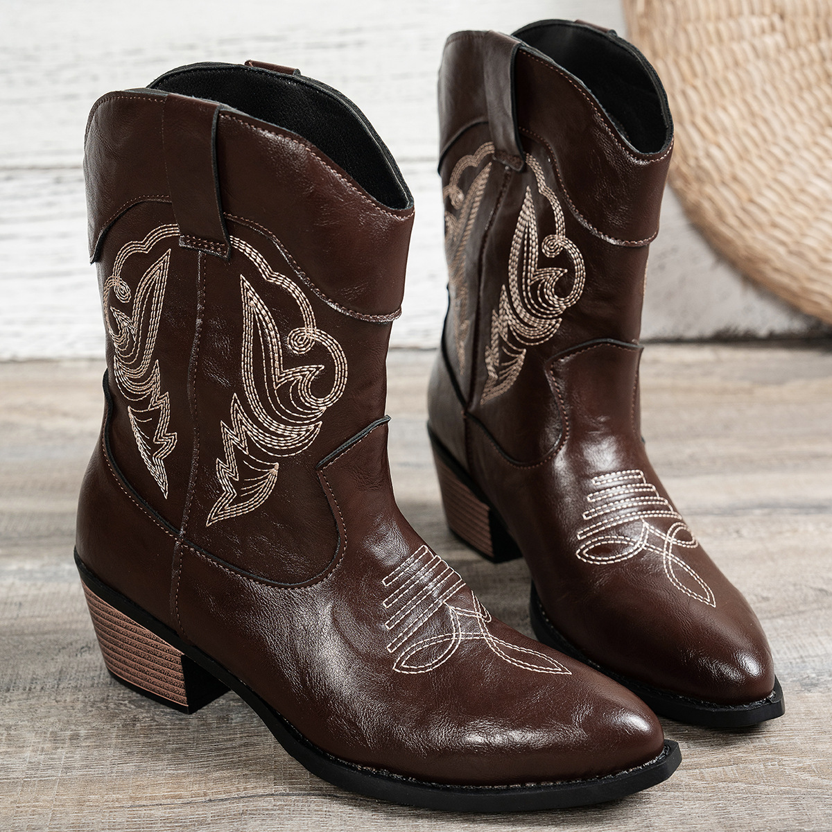 復古尖頭粗跟西部牛仔皮靴女新款百搭套腳大碼時裝馬丁靴
