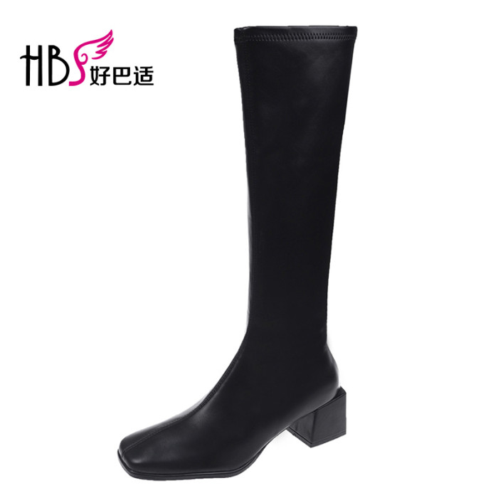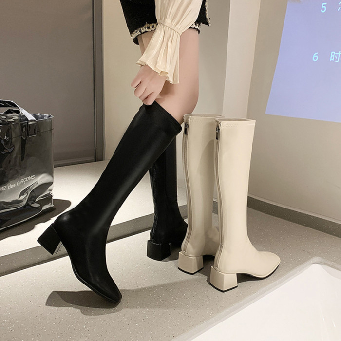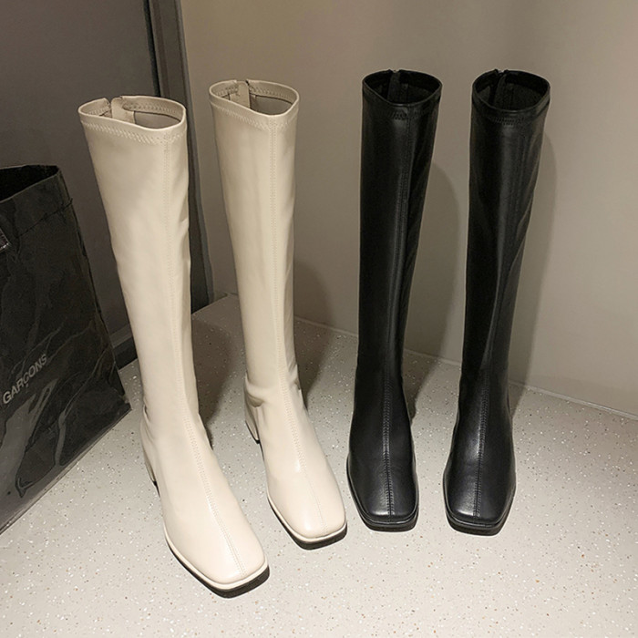 小個子白色長筒靴女不過膝2025年秋冬季高筒方頭靴子粗跟高跟長靴