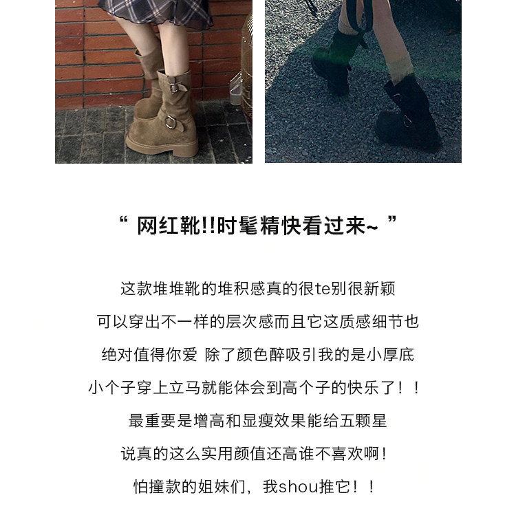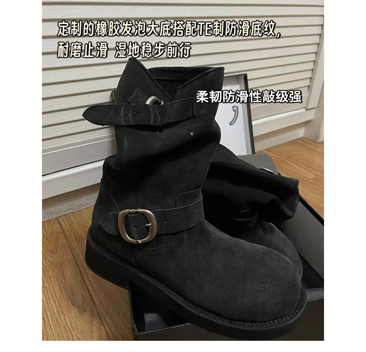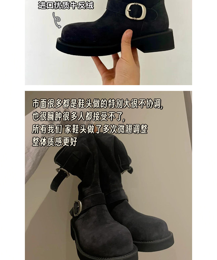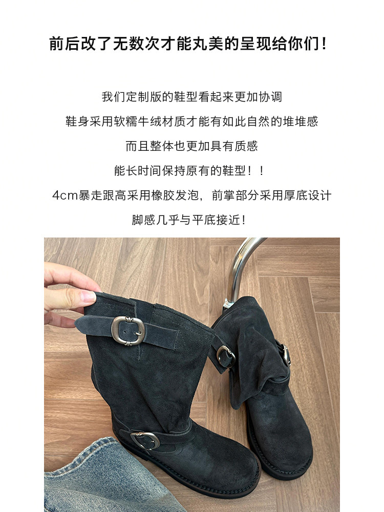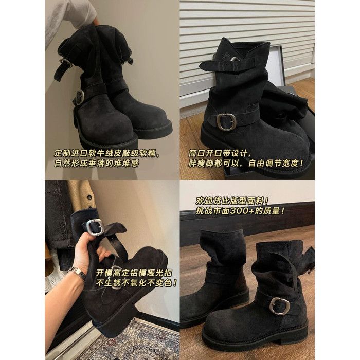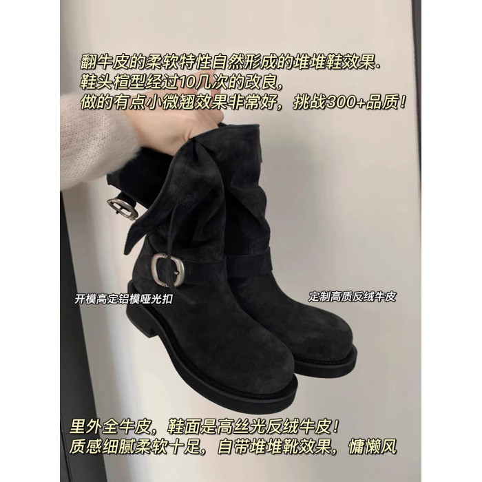 早秋中筒短靴女2024新款秋季擦色磨砂真皮厚底馬丁靴女款堆堆靴子