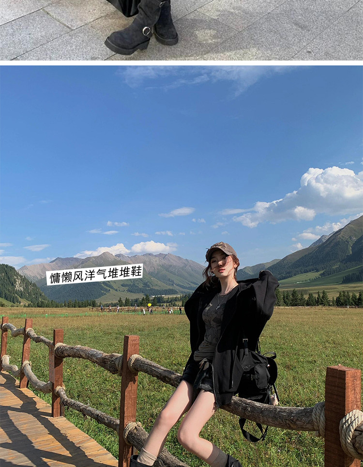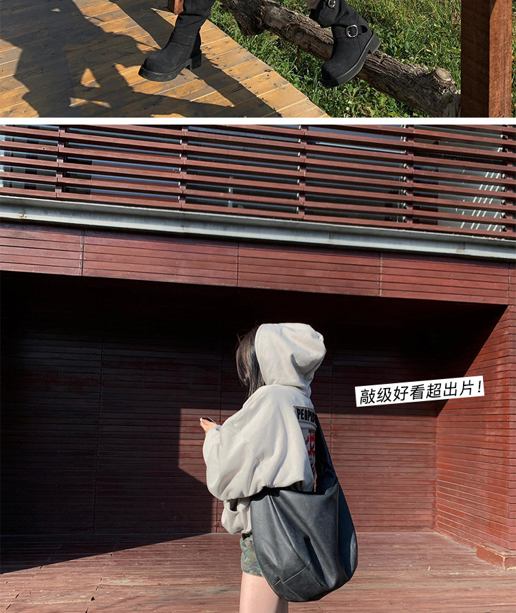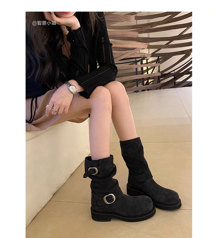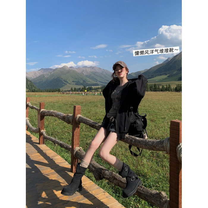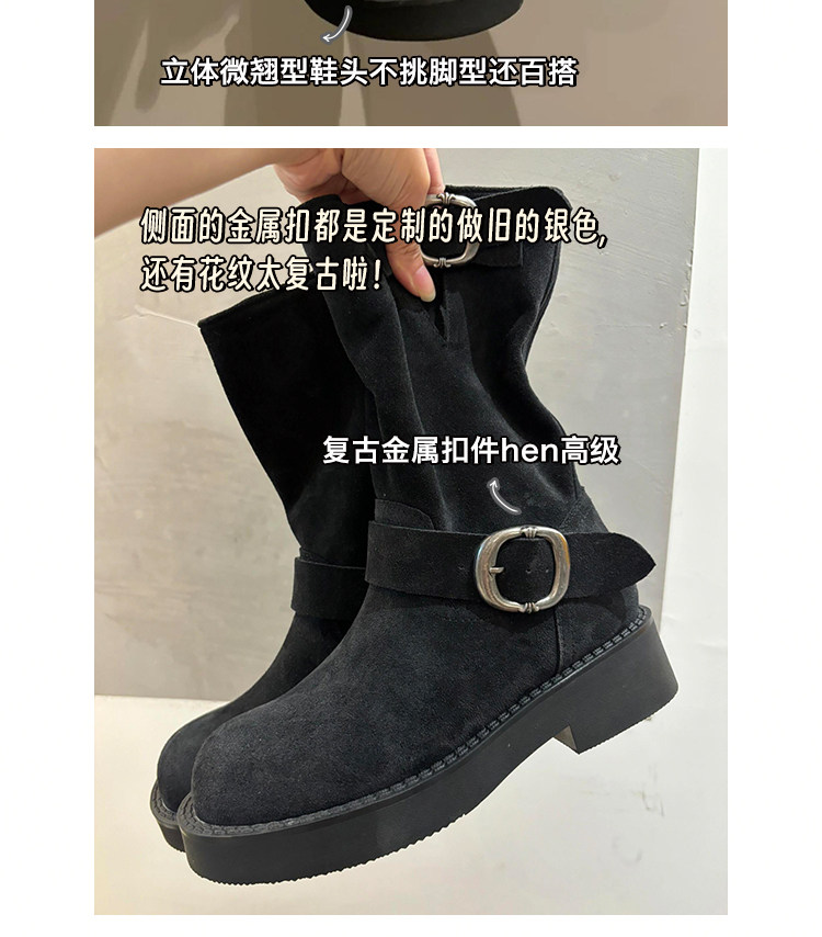 早秋中筒短靴女2024新款秋季擦色磨砂真皮厚底馬丁靴女款堆堆靴子