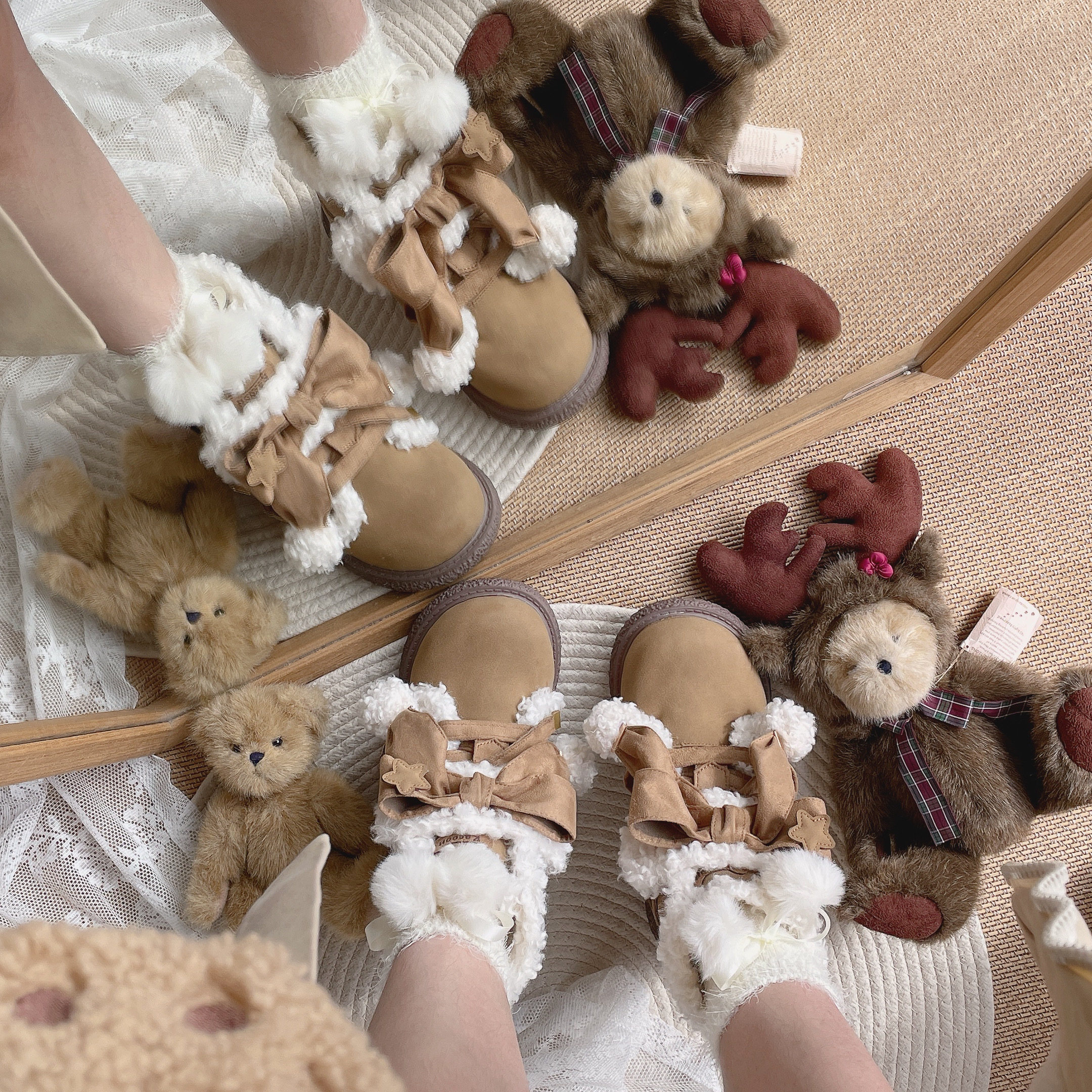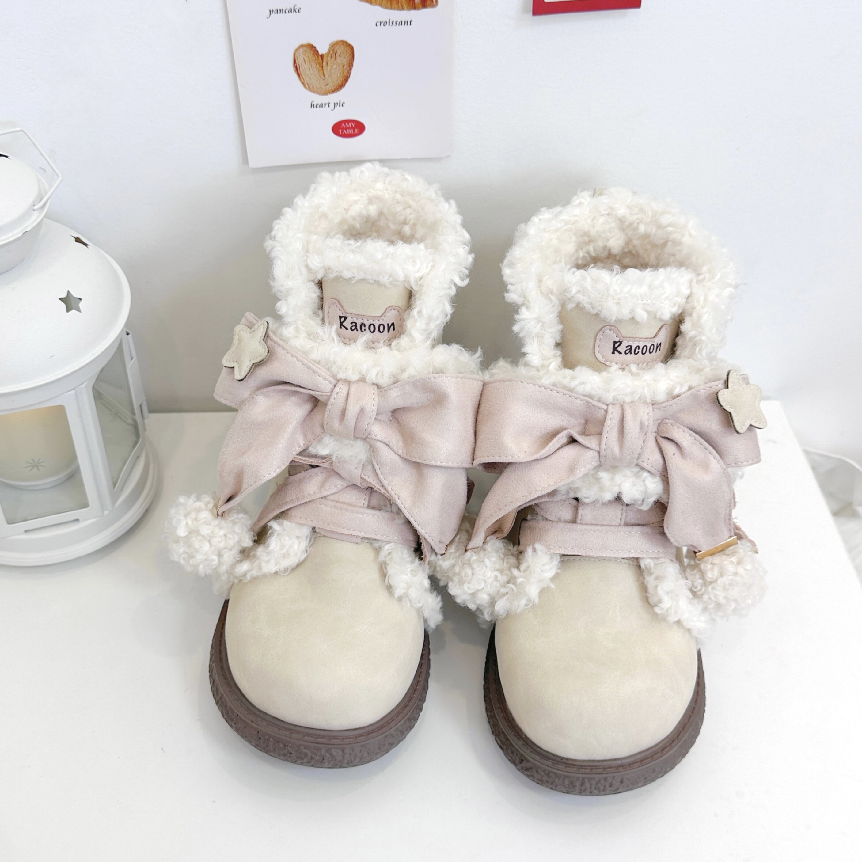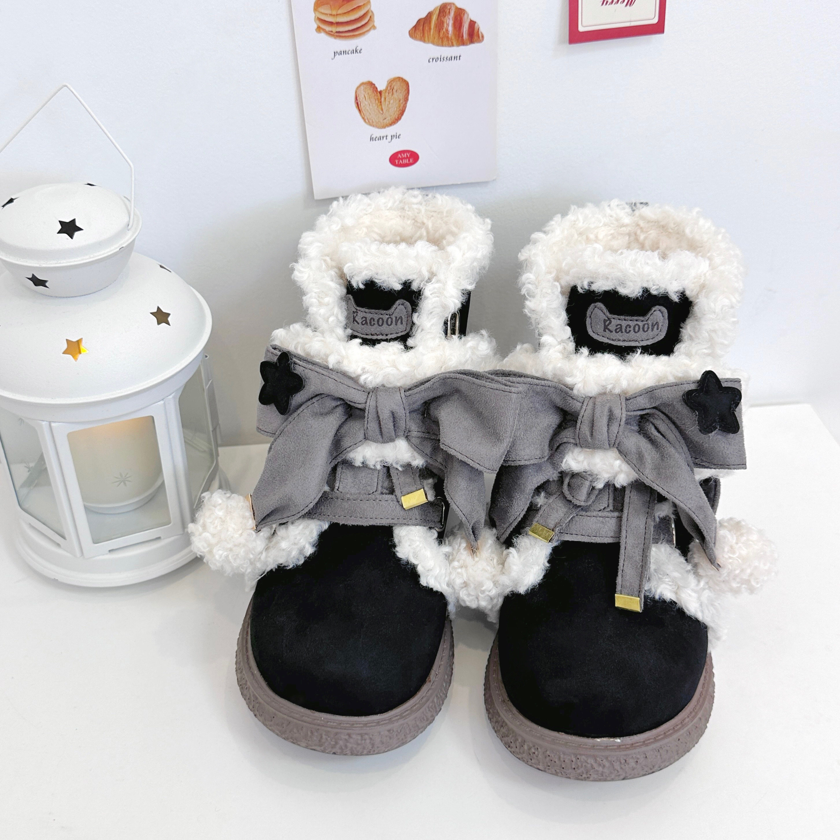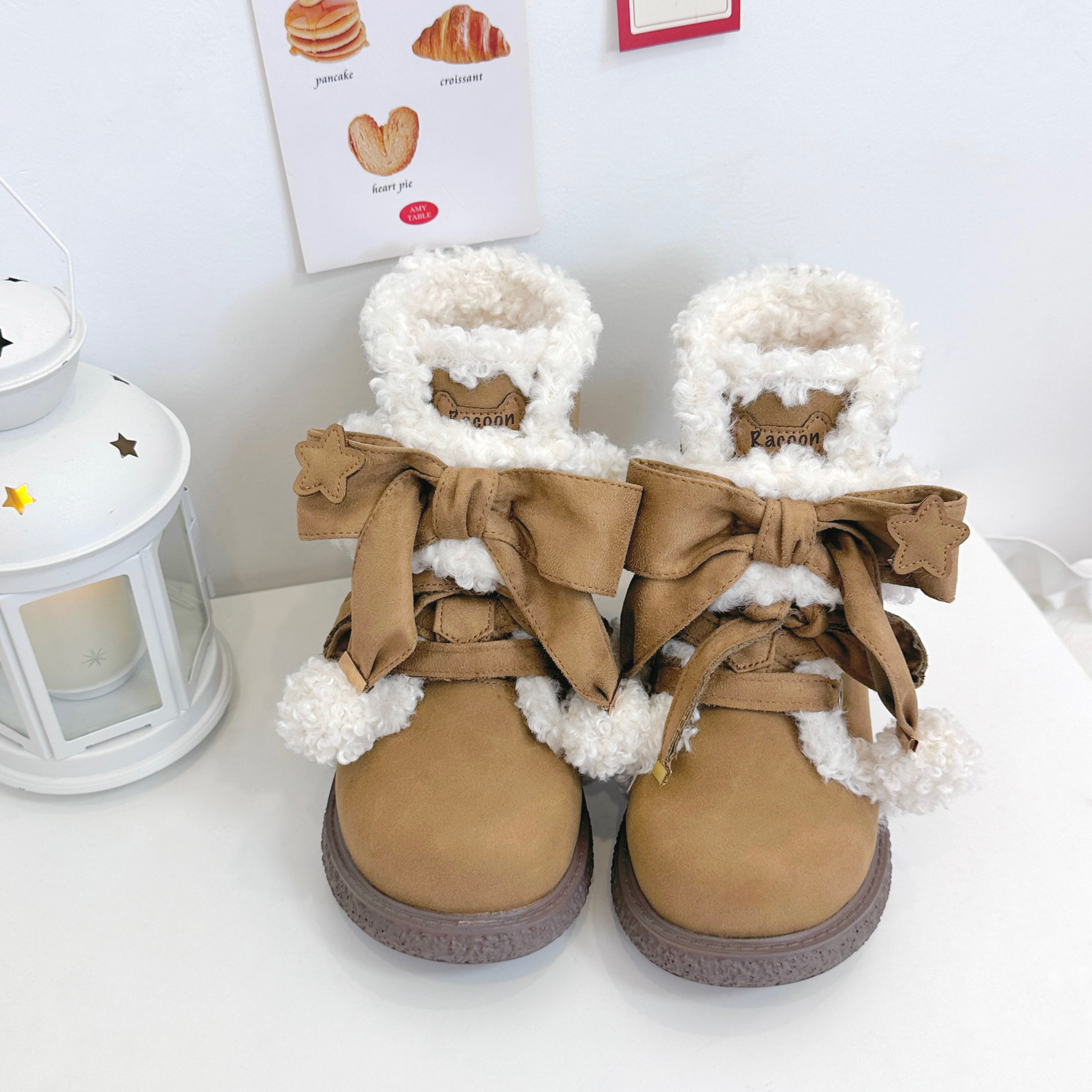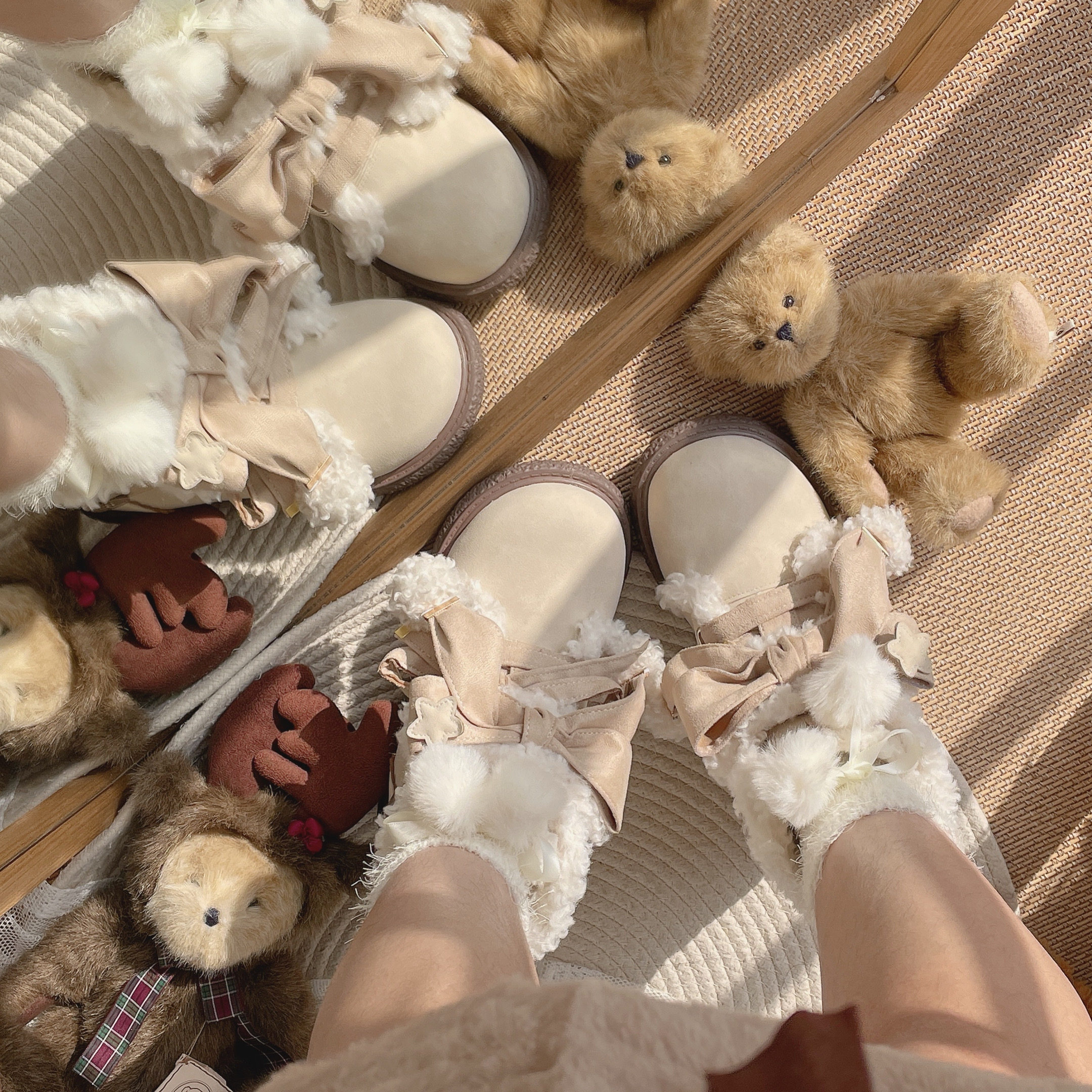 【浣熊團子】毛絨棉鞋可愛平底圓頭蝴蝶結雪地靴lo鞋冬天