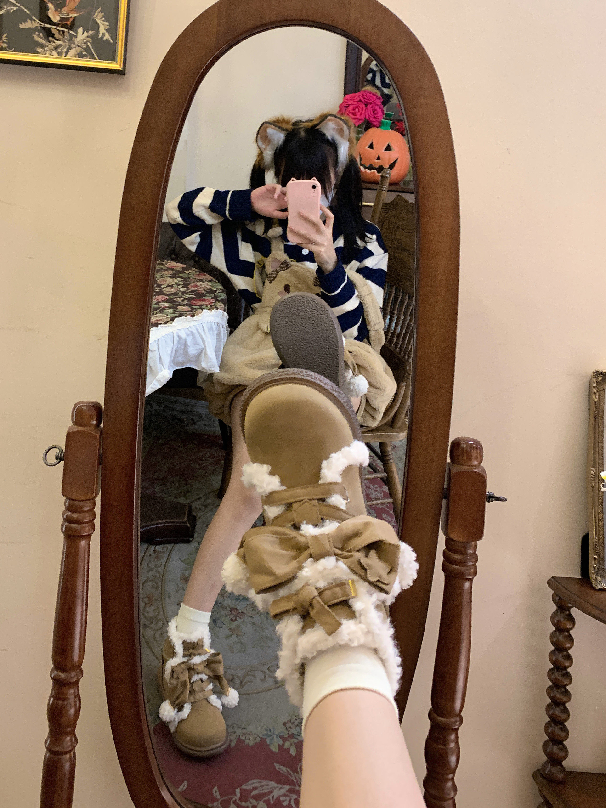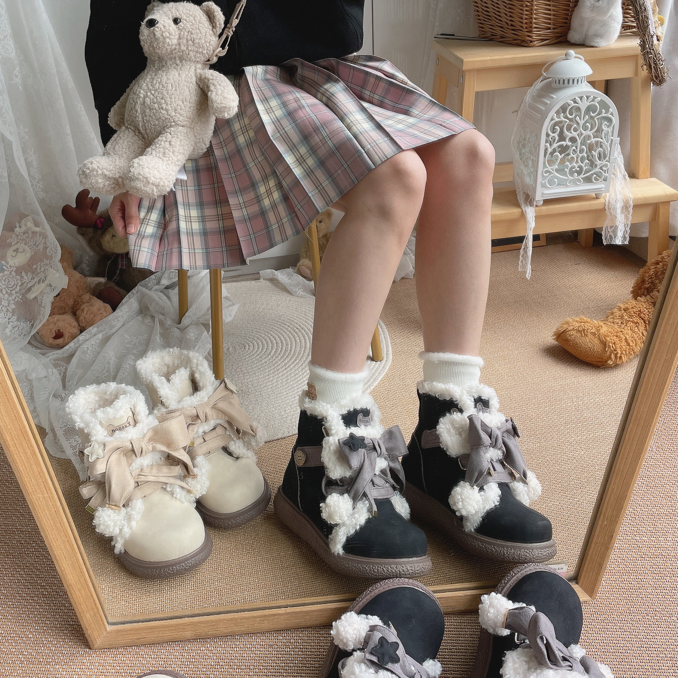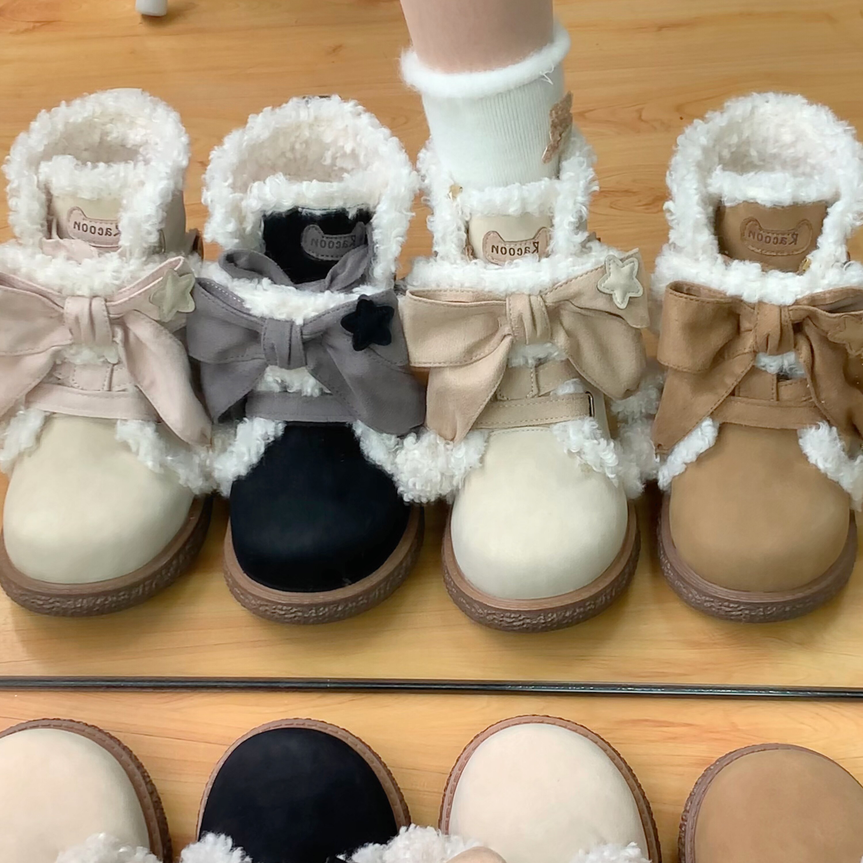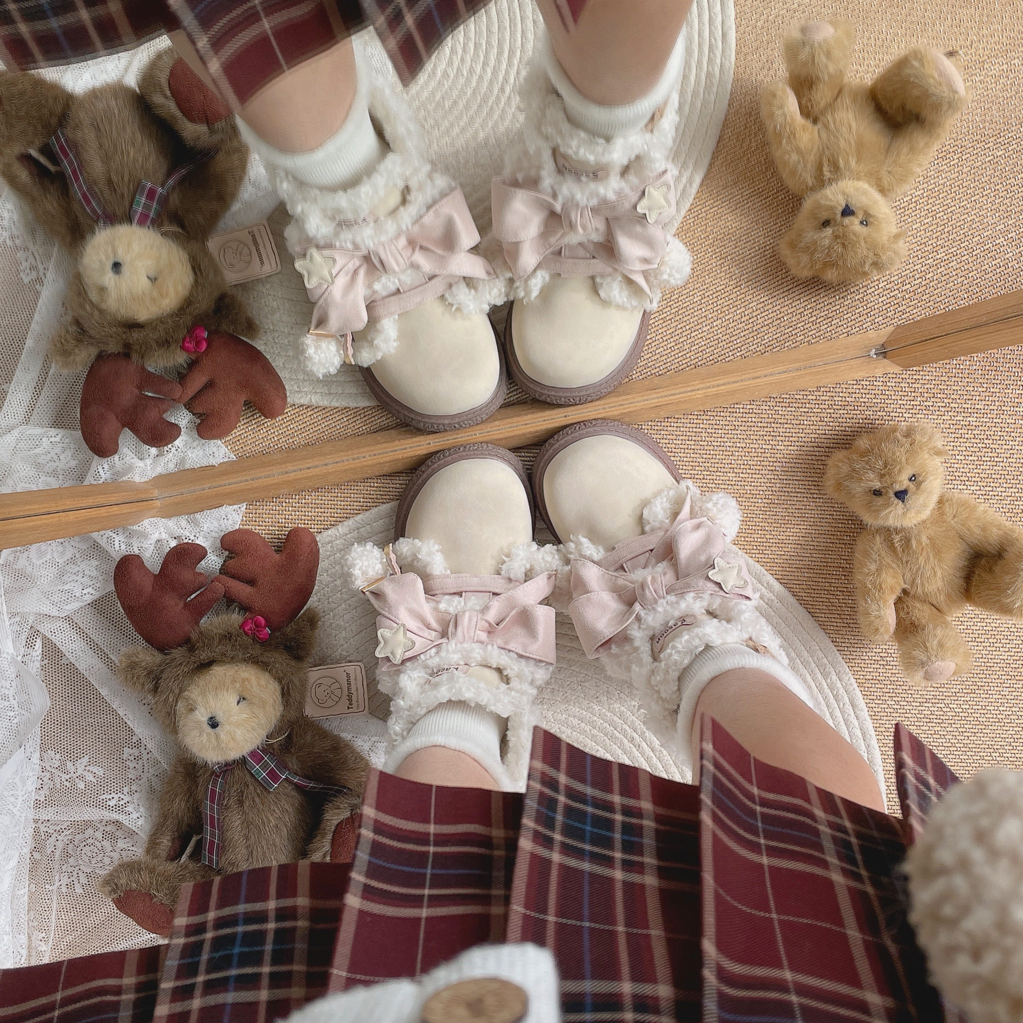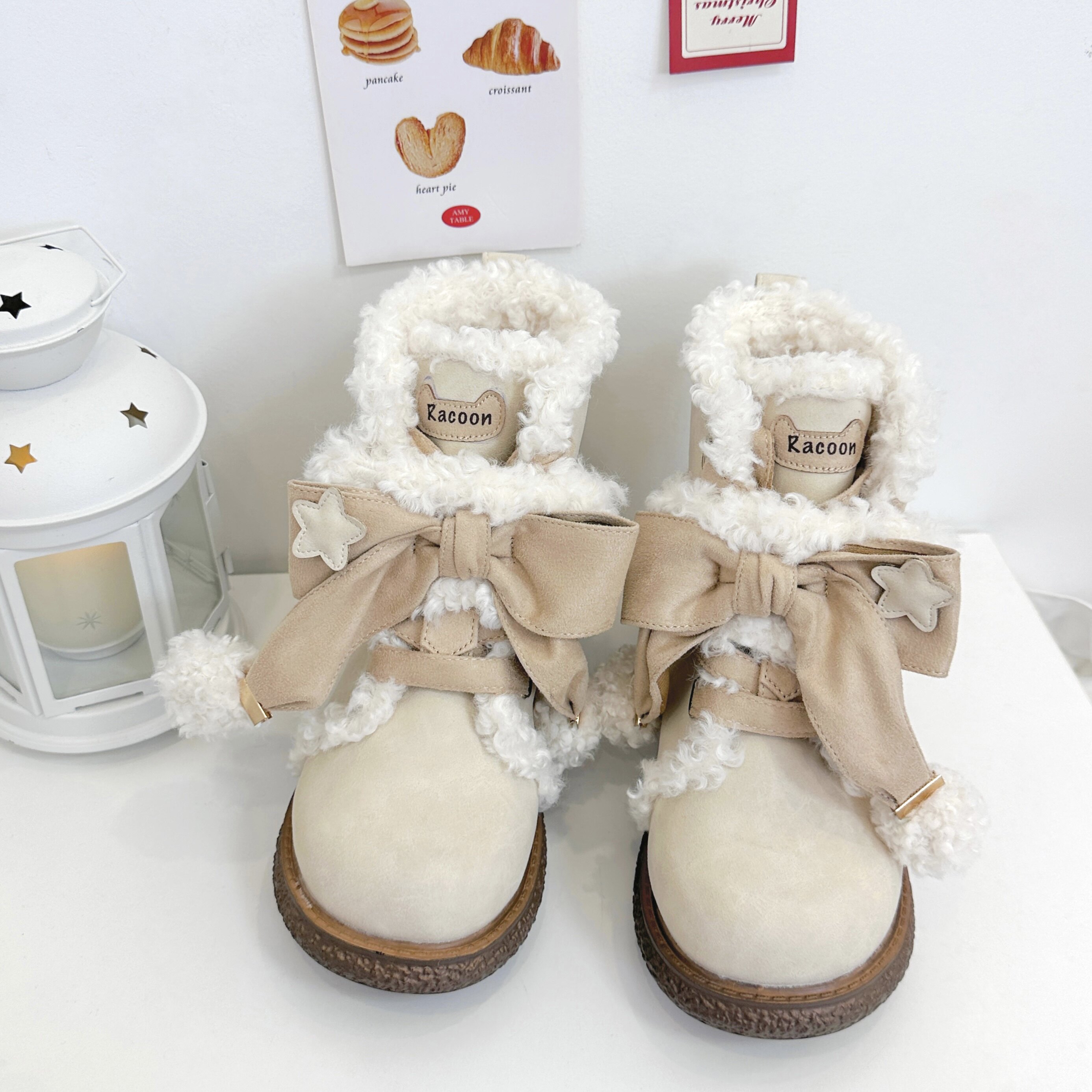 【浣熊團子】毛絨棉鞋可愛平底圓頭蝴蝶結雪地靴lo鞋冬天