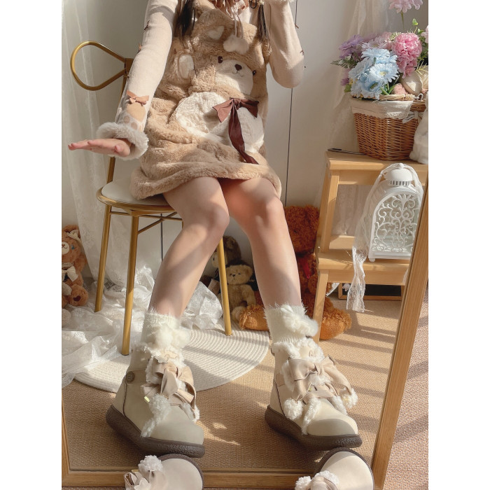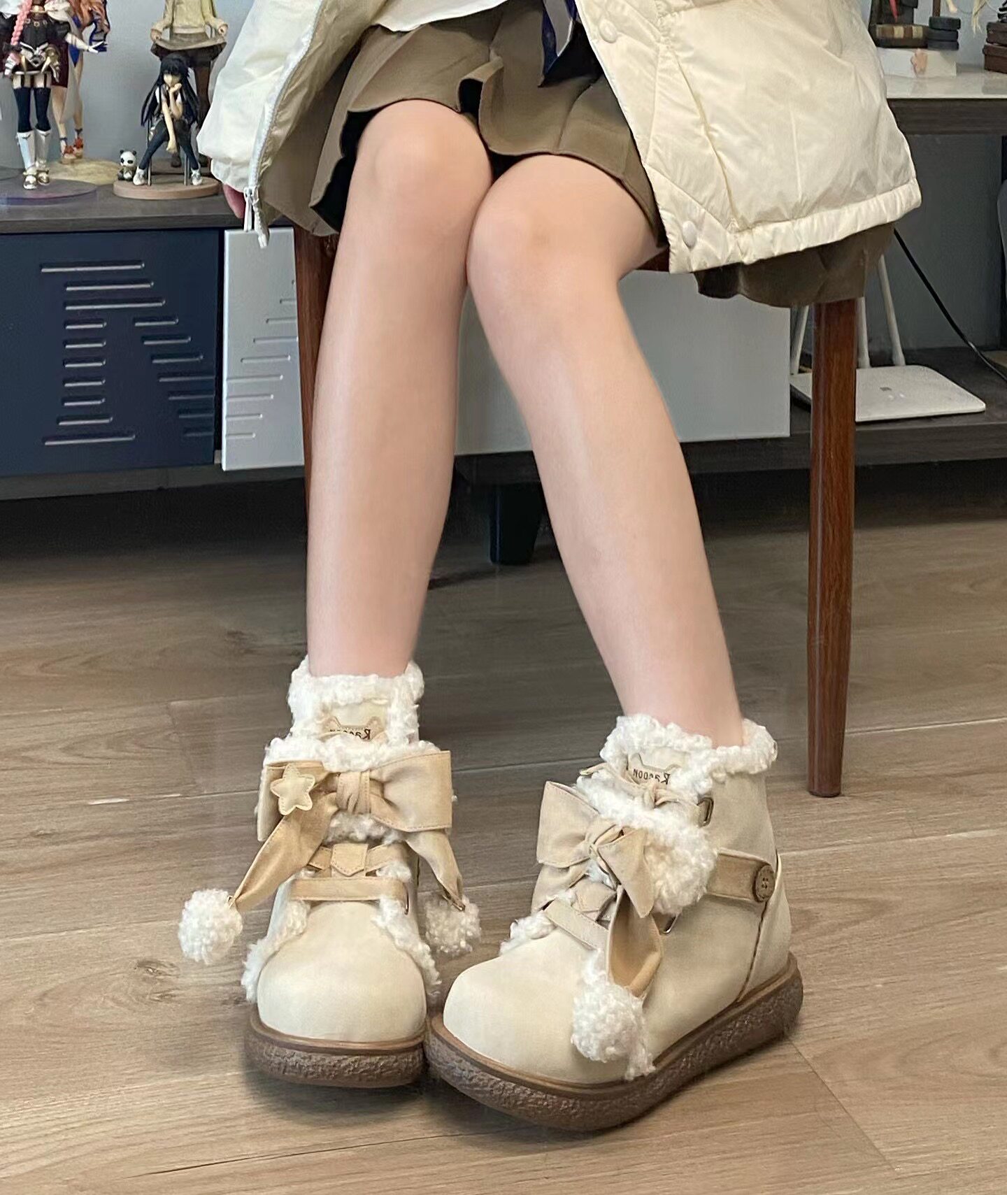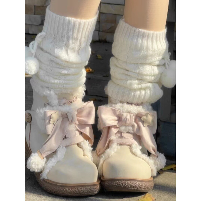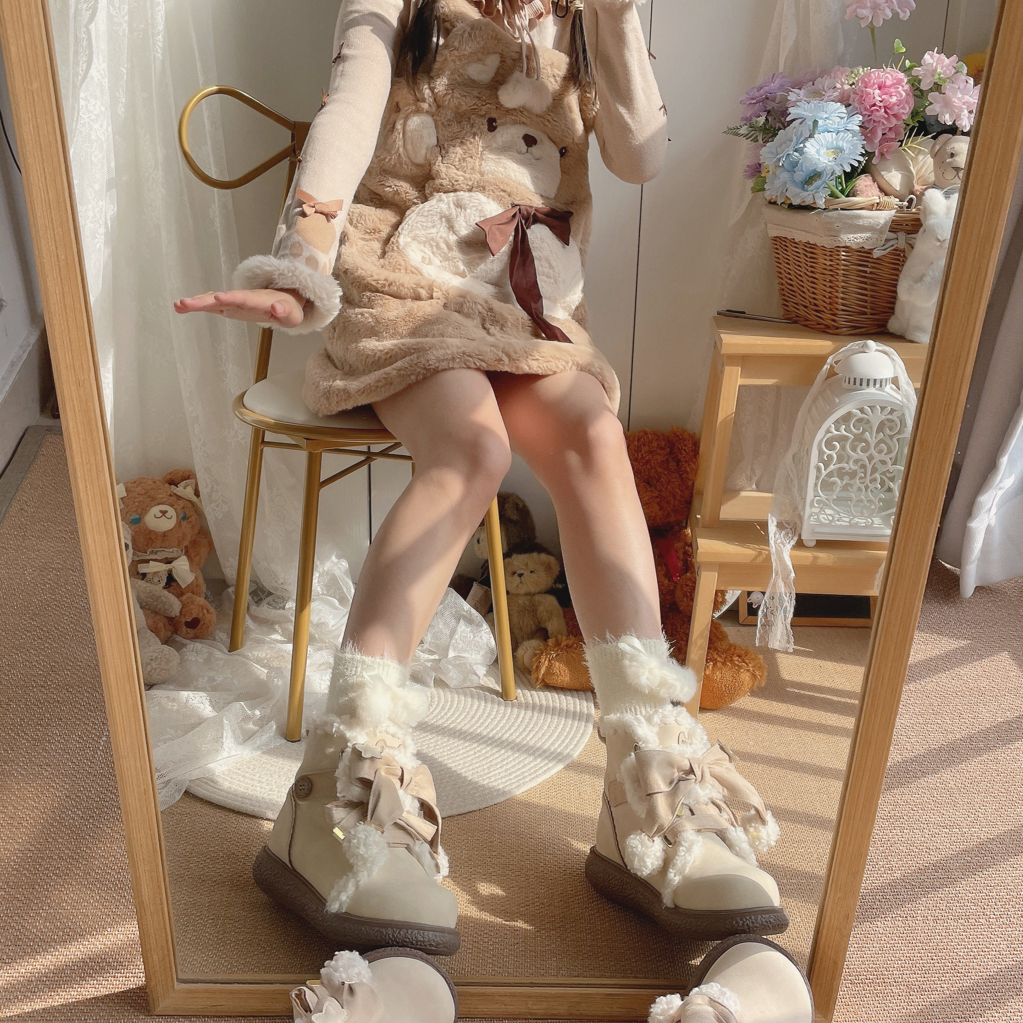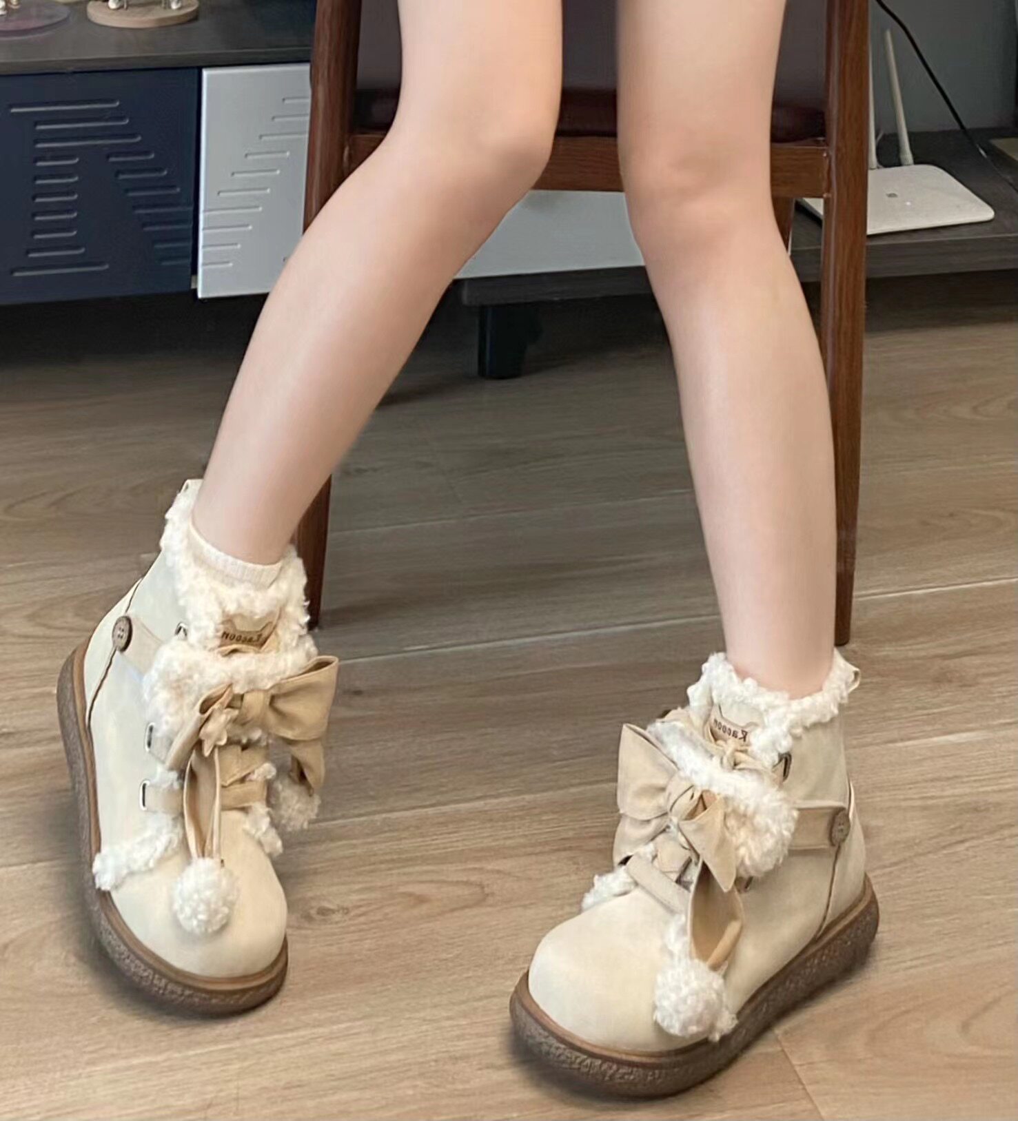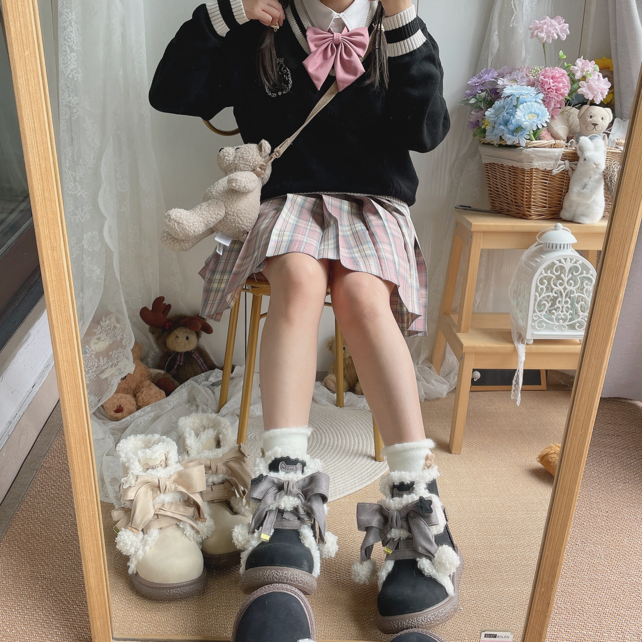 【浣熊團子】毛絨棉鞋可愛平底圓頭蝴蝶結雪地靴lo鞋冬天