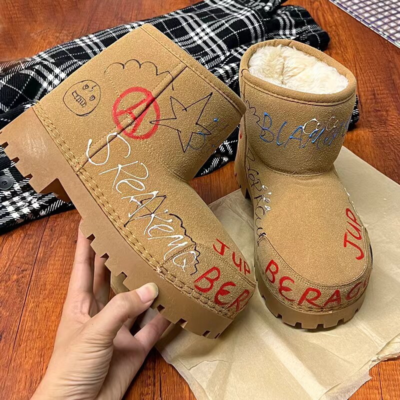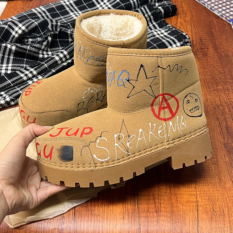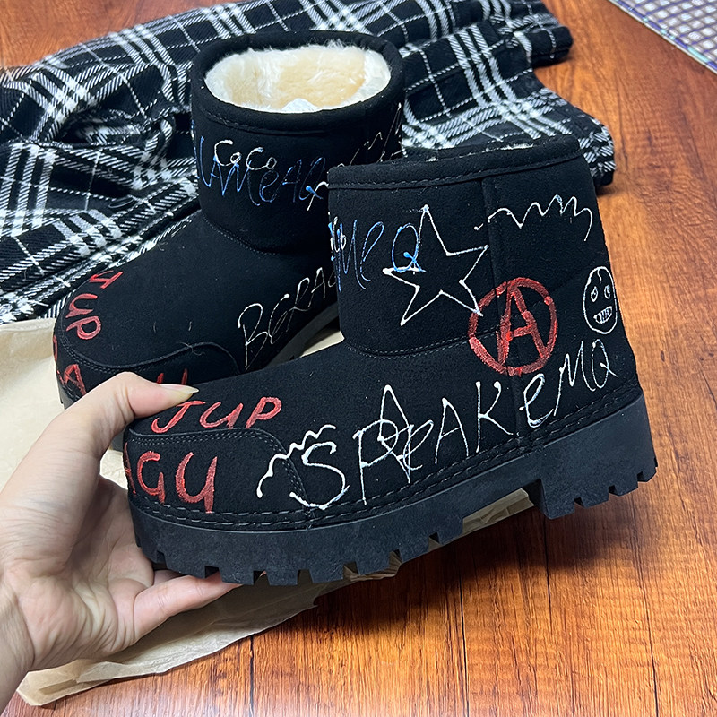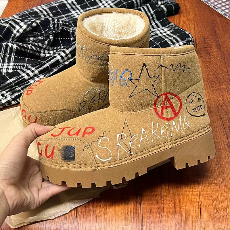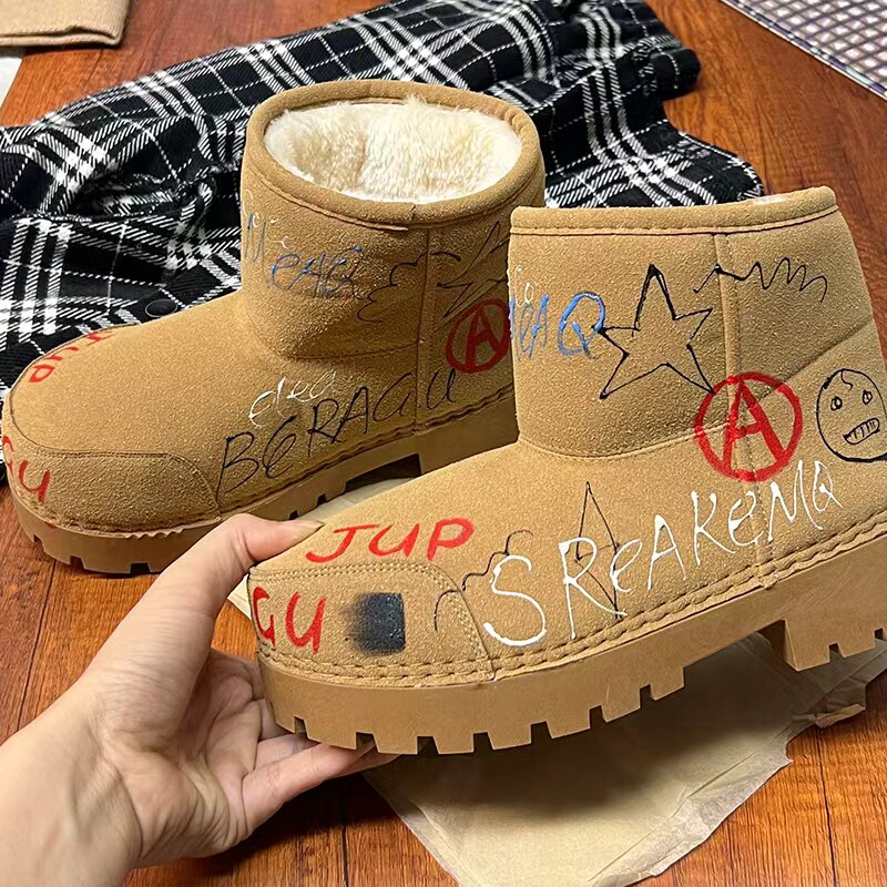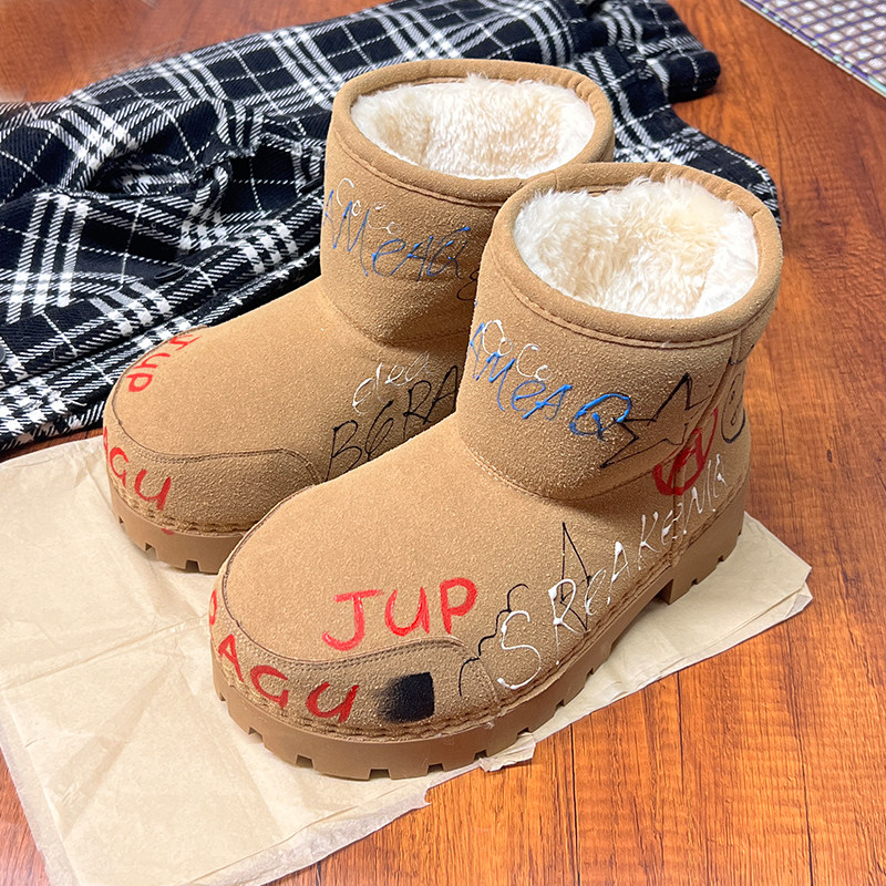 歐貨男女2025冬季新款爆款手工塗鴉雪地靴真皮反絨加絨保暖棉靴潮