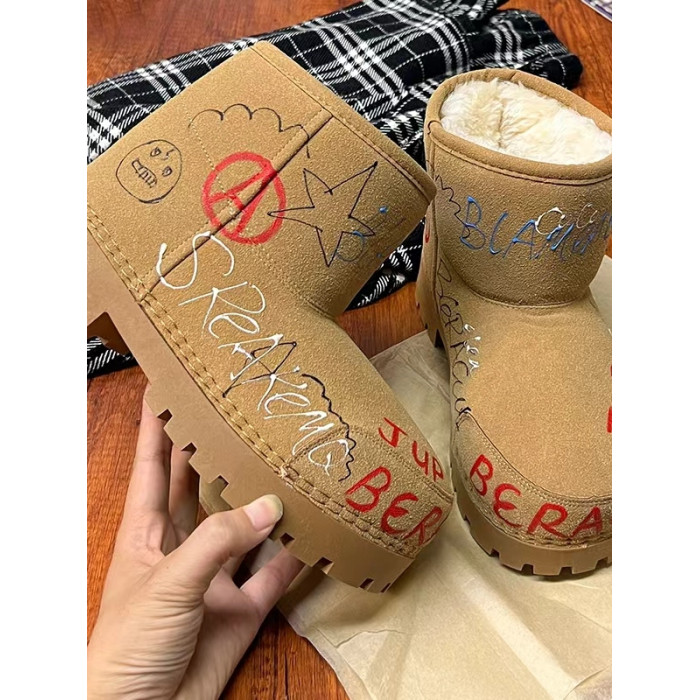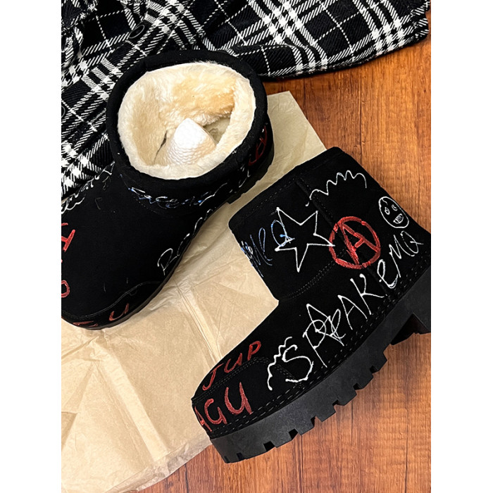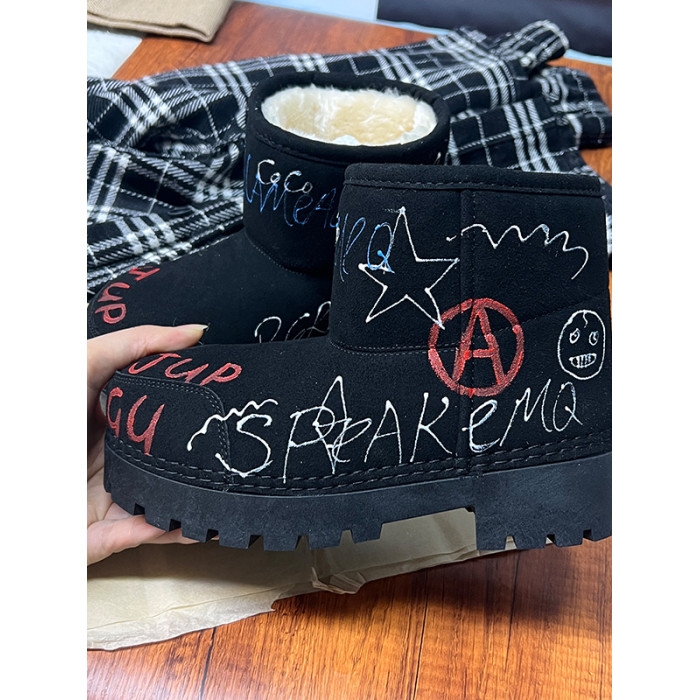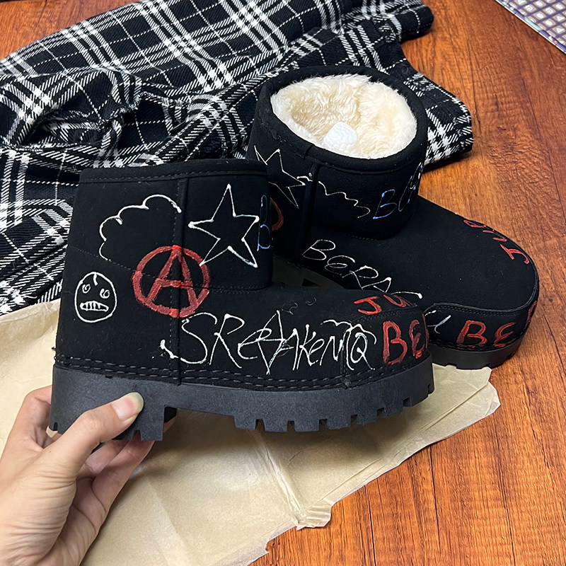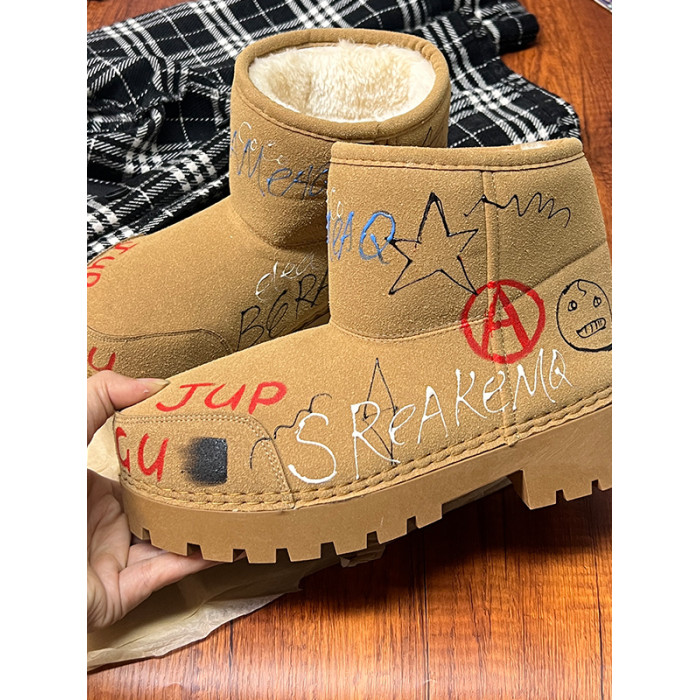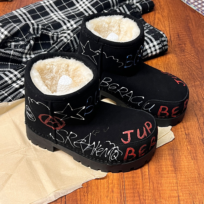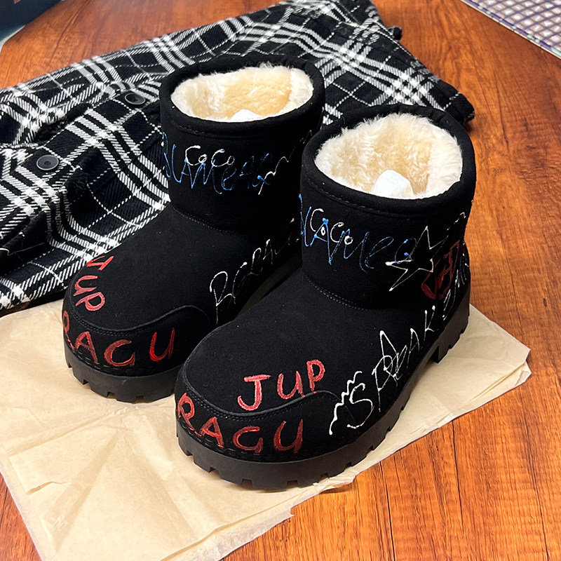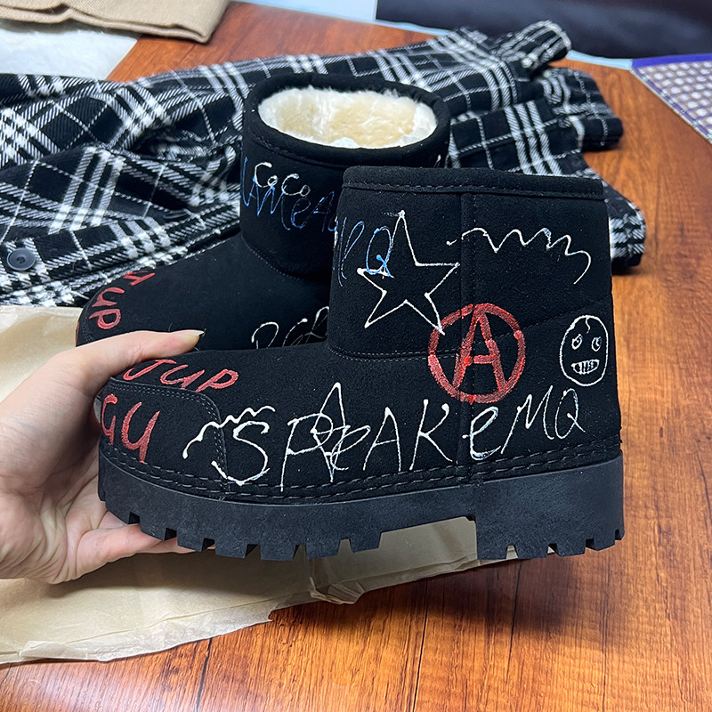 歐貨男女2025冬季新款爆款手工塗鴉雪地靴真皮反絨加絨保暖棉靴潮