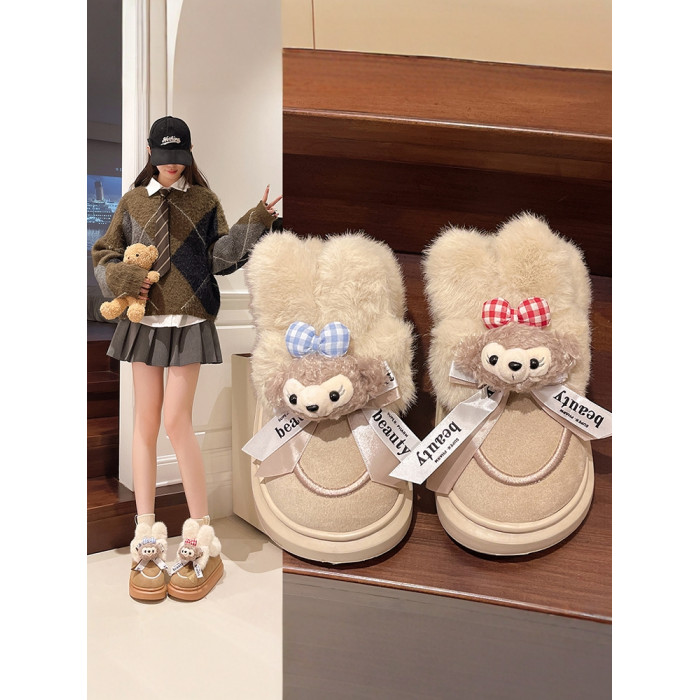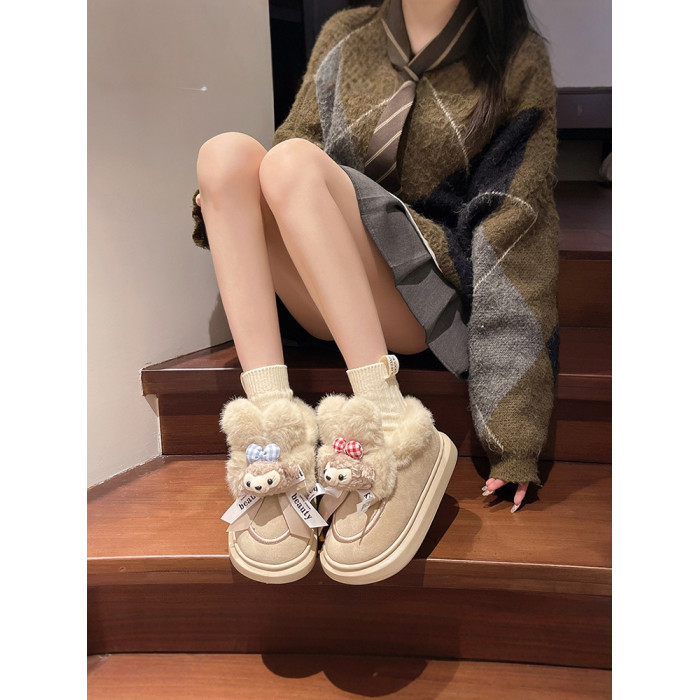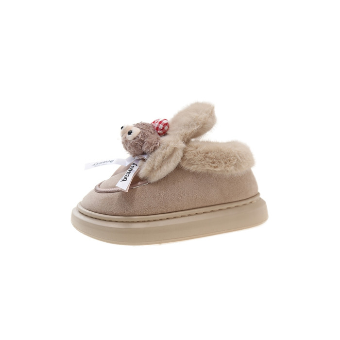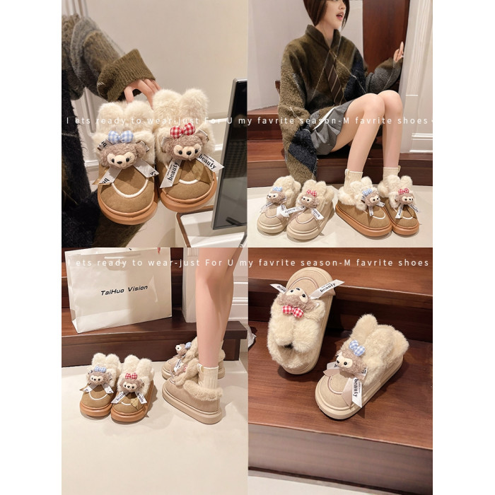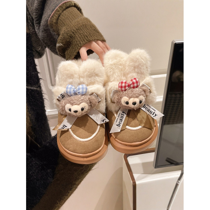 可愛卡通毛絨熊雪地靴女2024冬季新款外穿厚底家居保暖加絨棉鞋潮