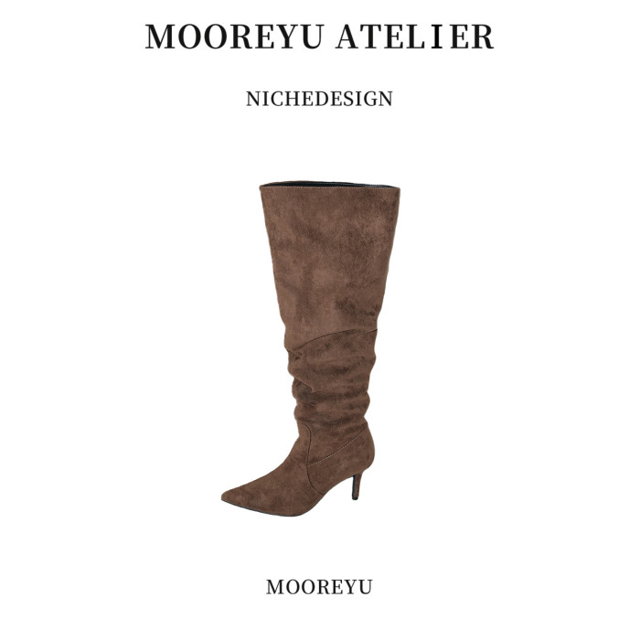 Mooreyu原創棕色尖頭長靴女2026年春夏新款絨面大筒圍細高跟靴子