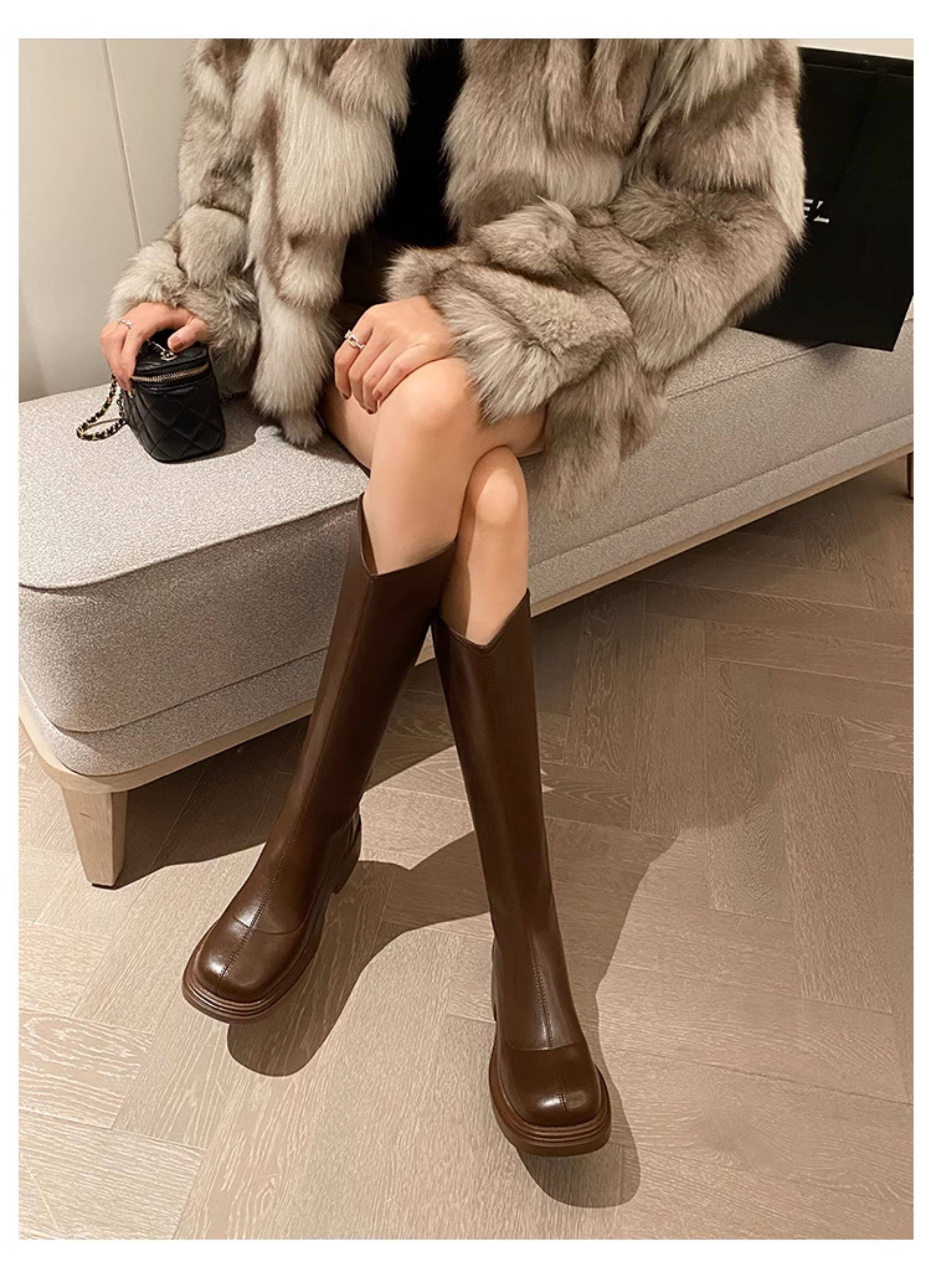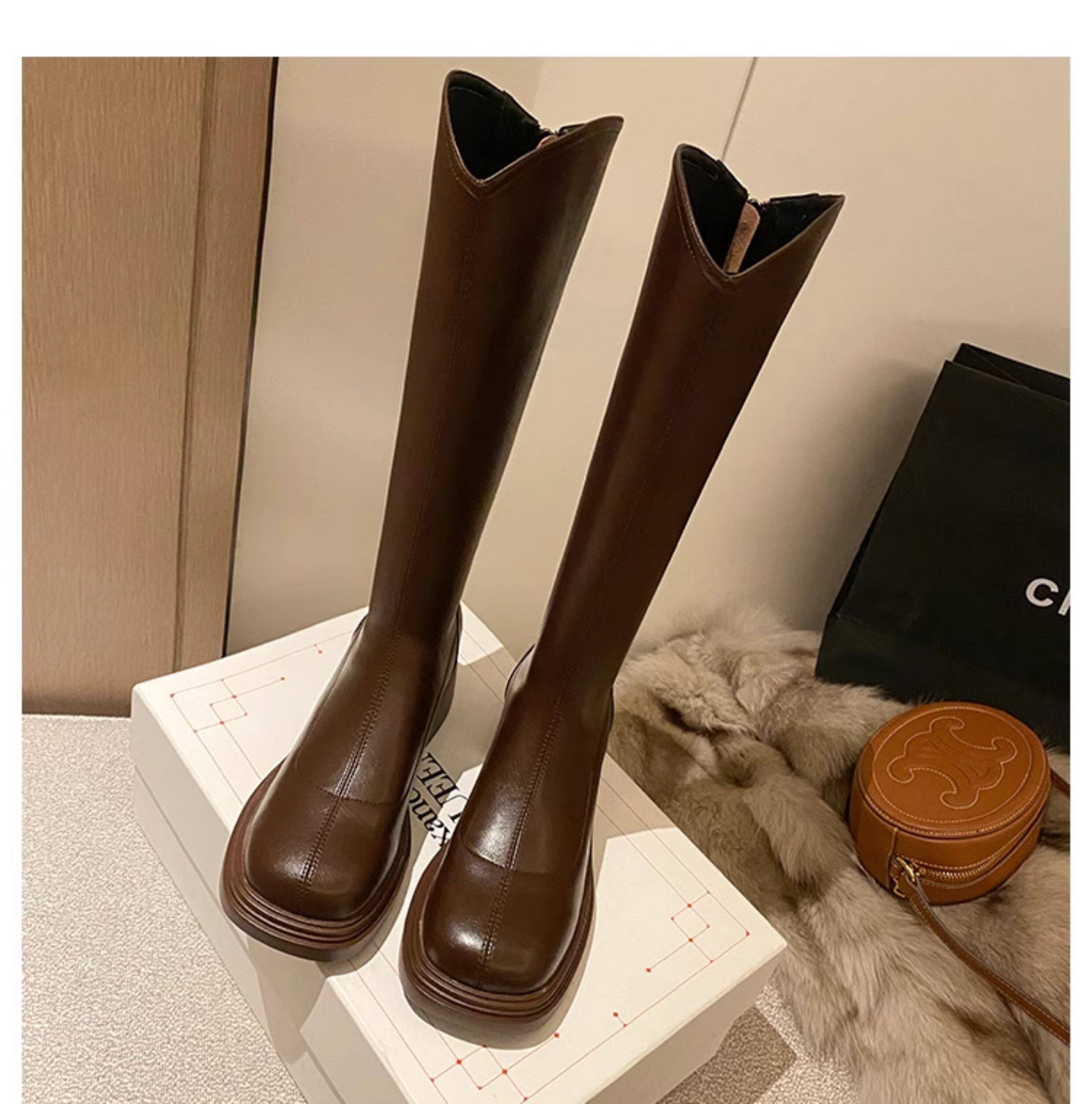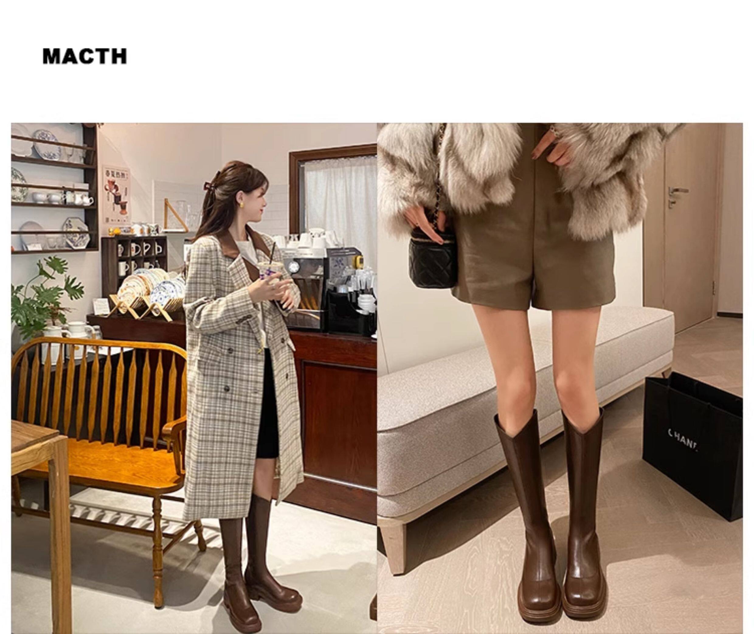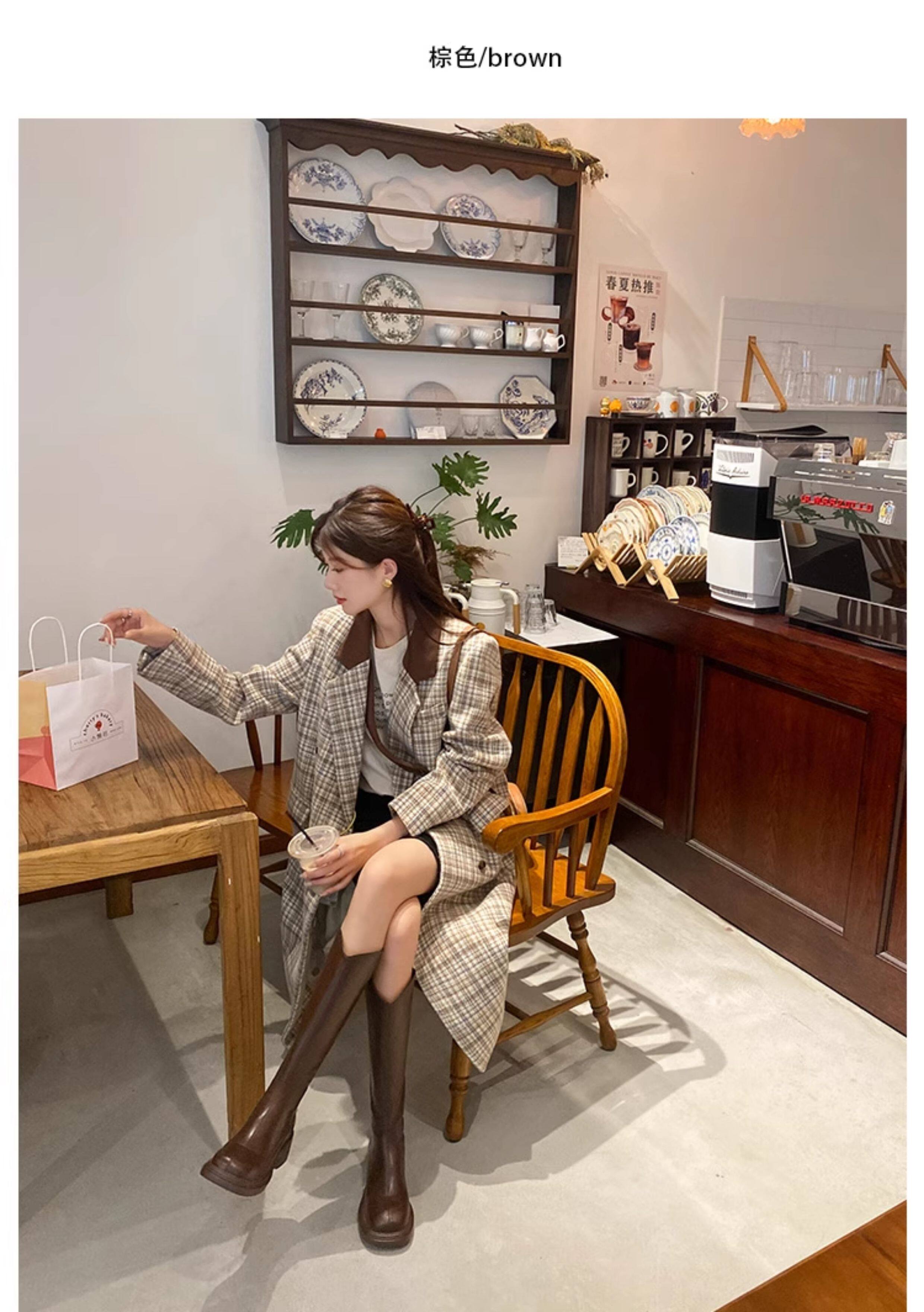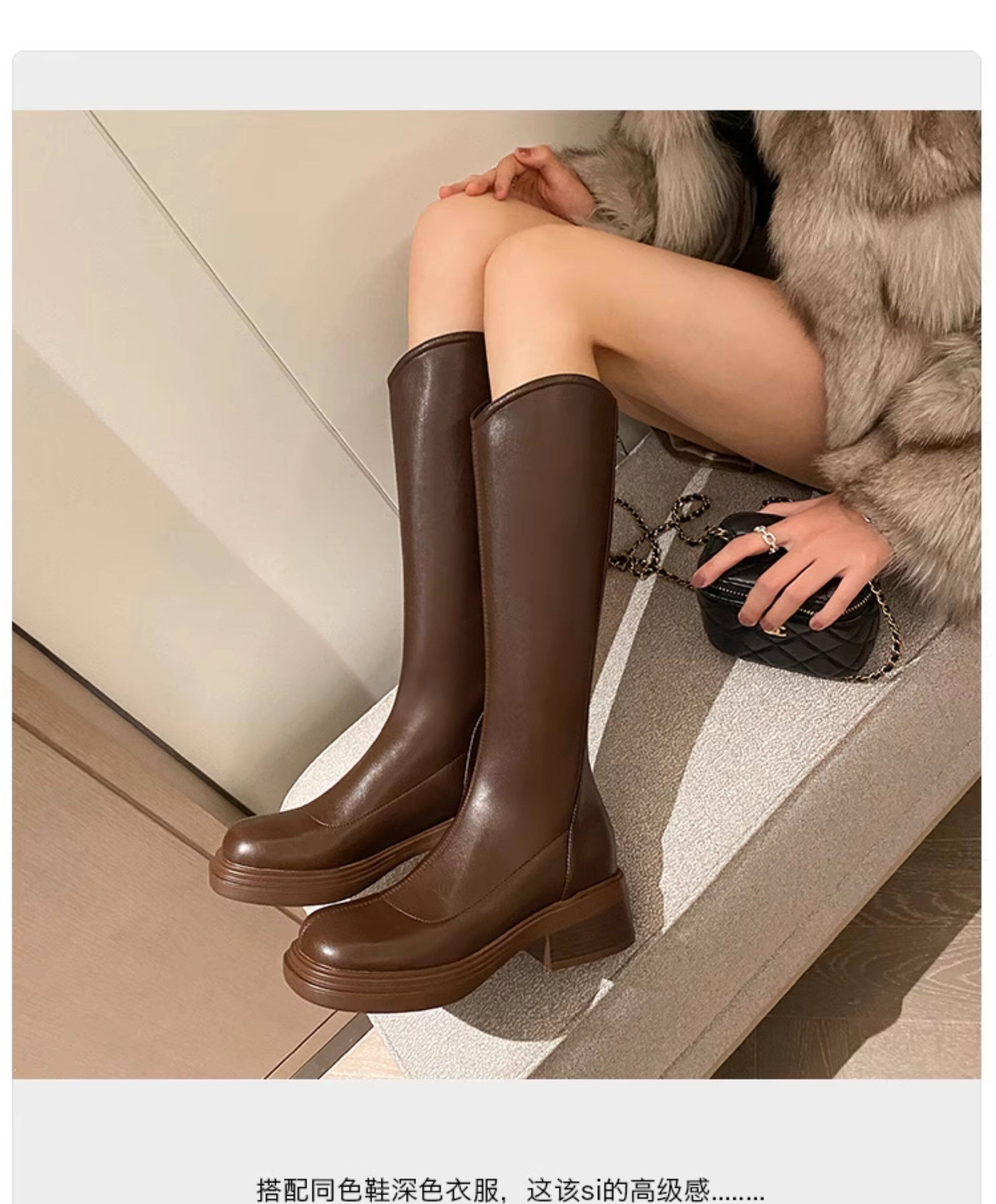 棕色厚底粗腿大筒圍女靴顯瘦粗跟彈力v口長筒靴胖mm高筒騎士靴子