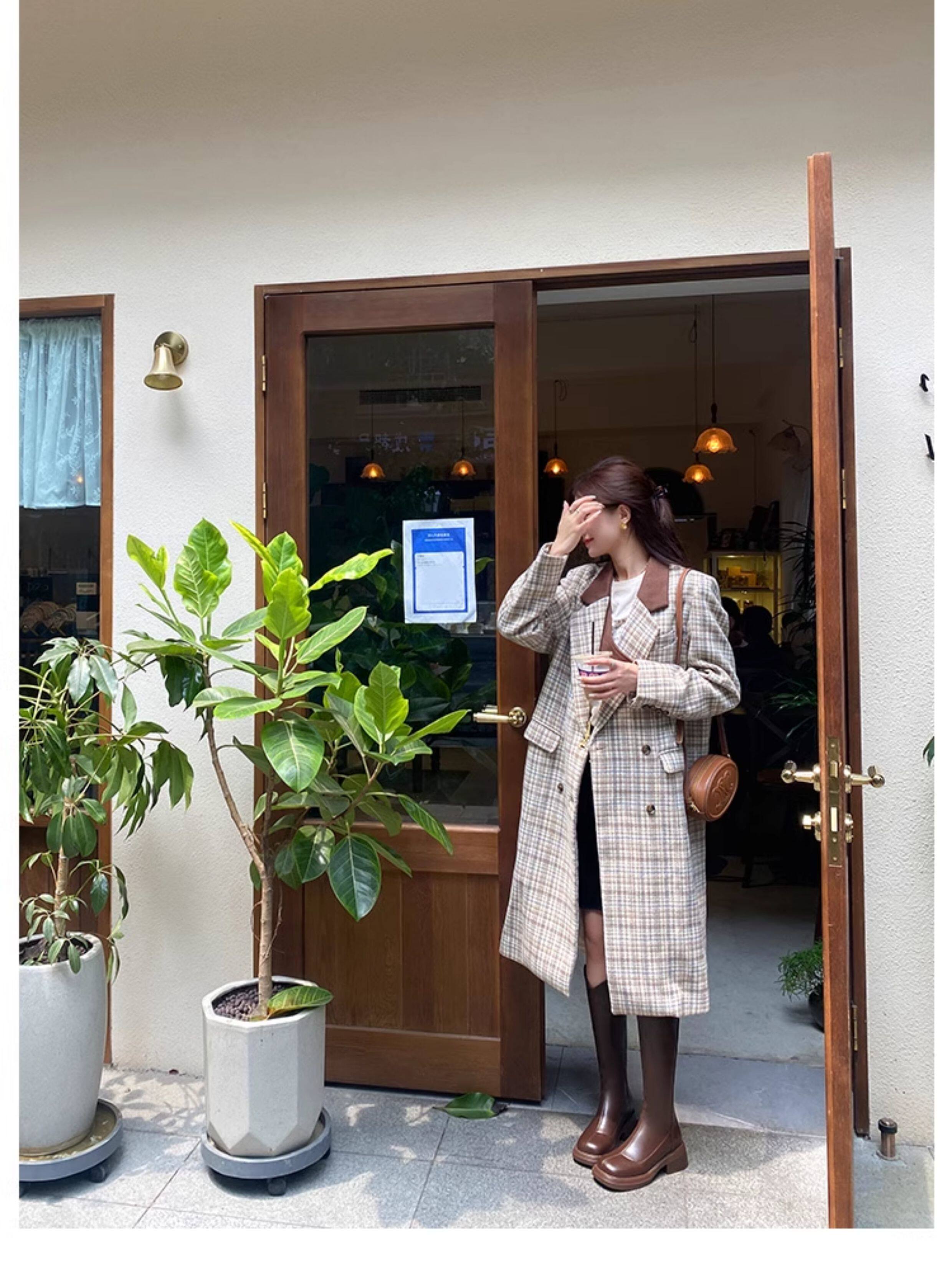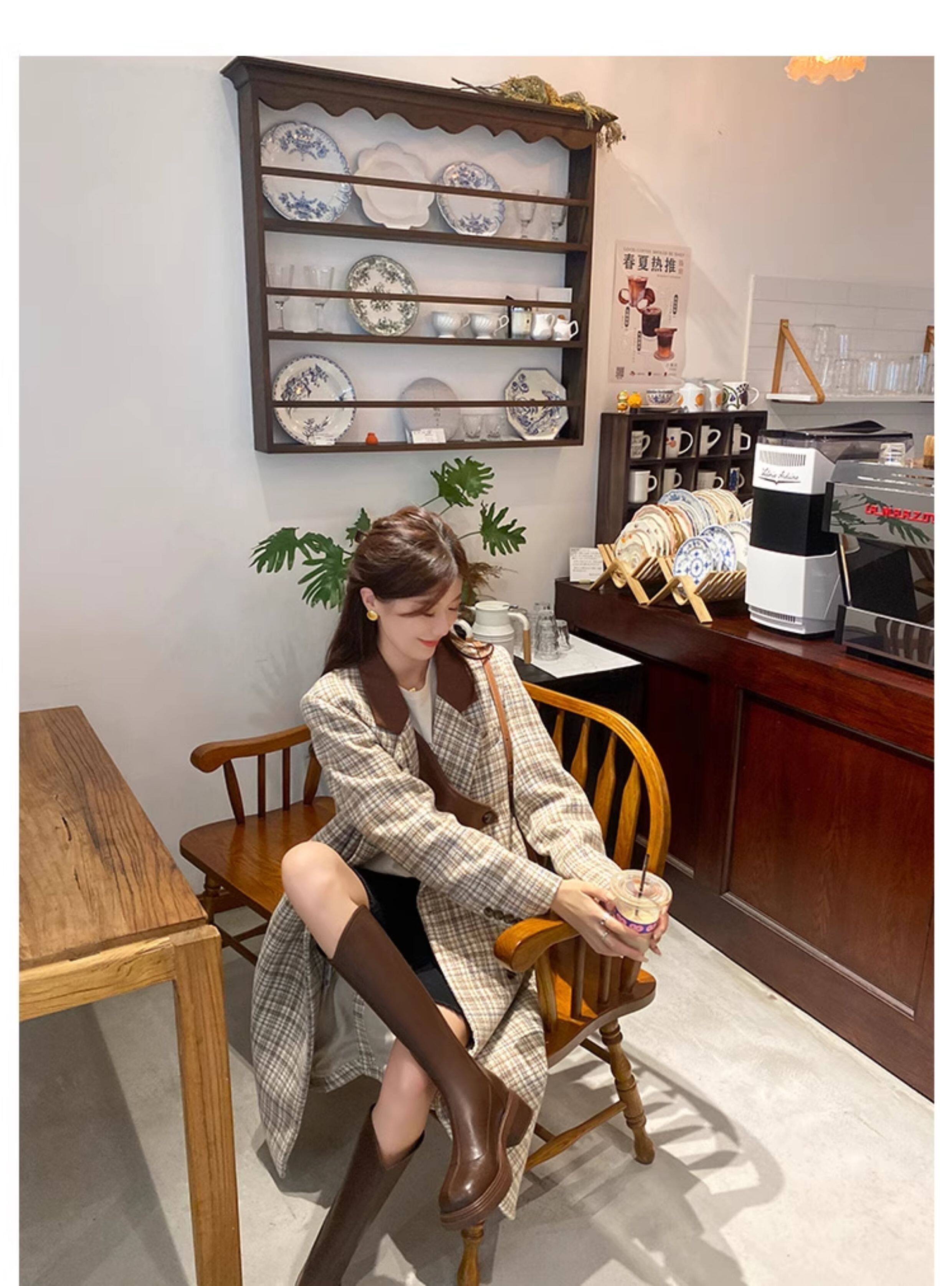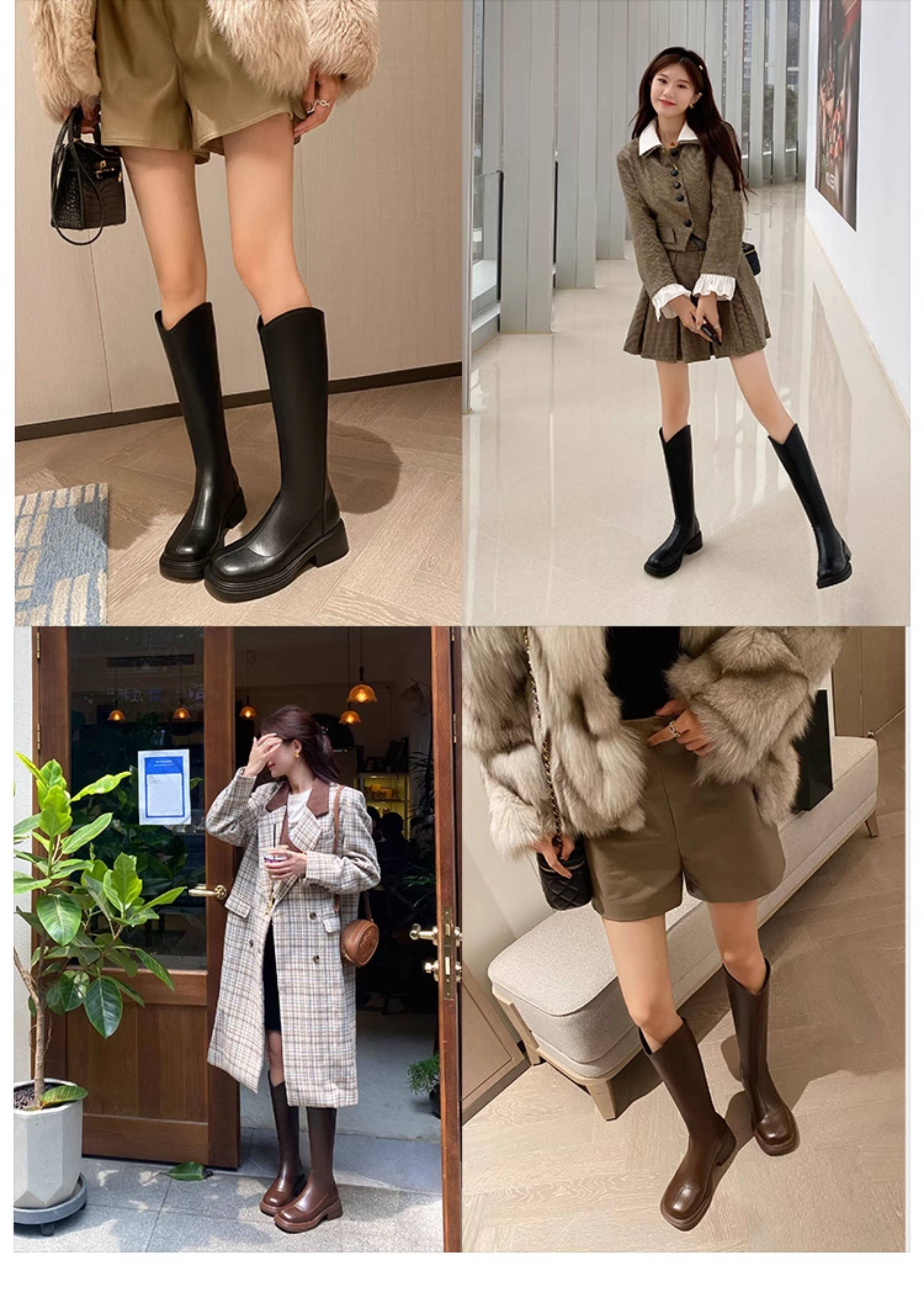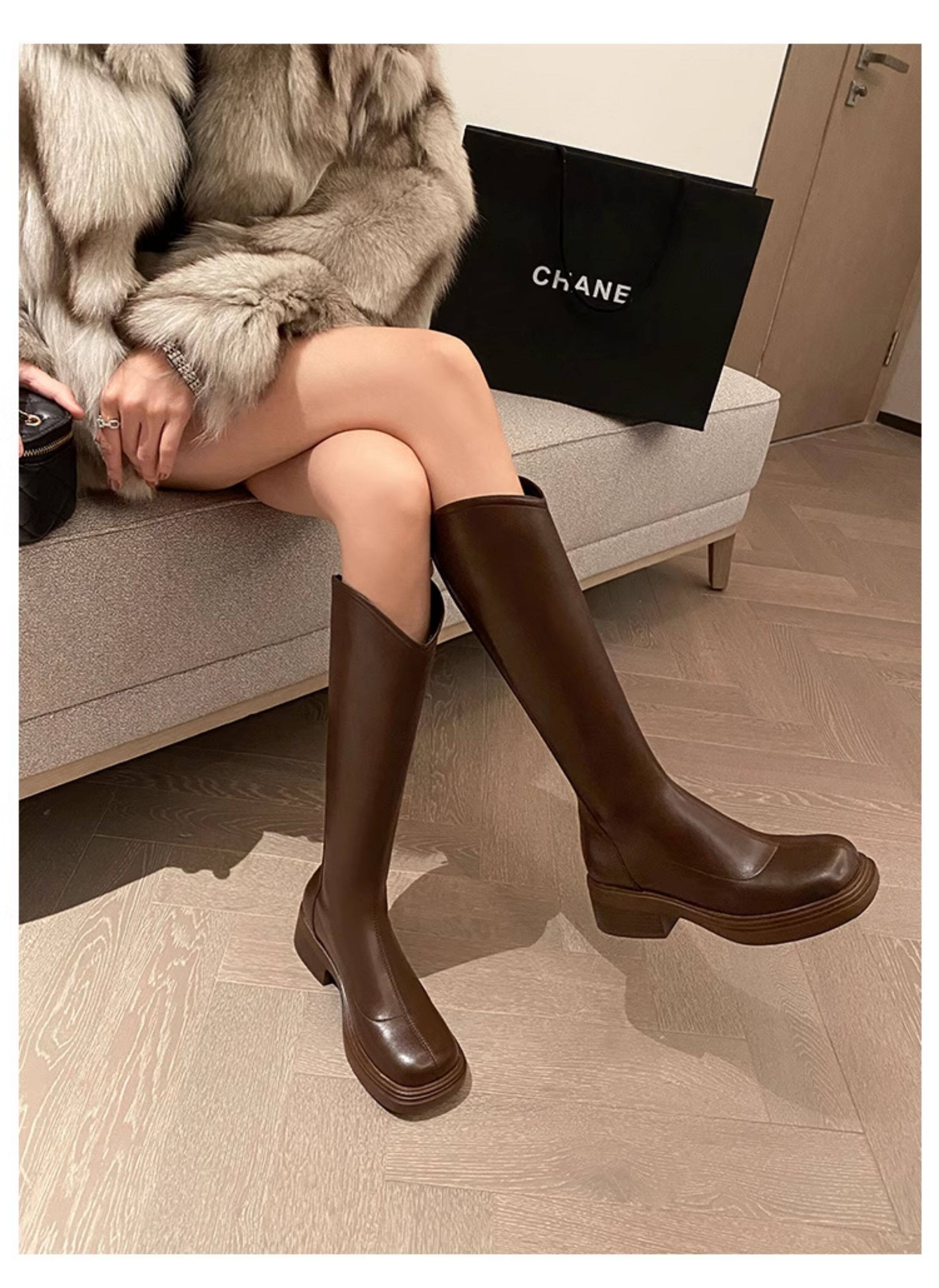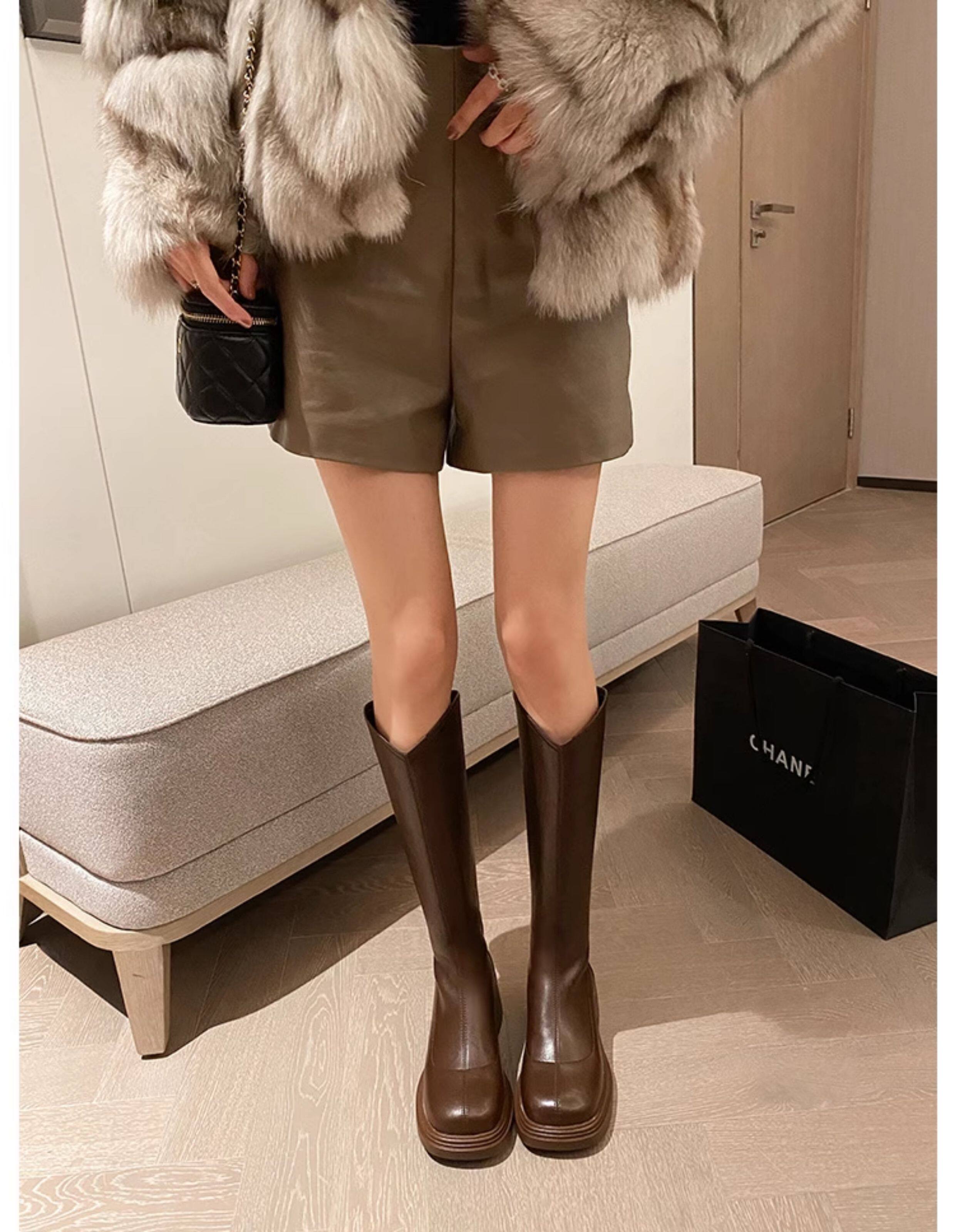棕色厚底粗腿大筒圍女靴顯瘦粗跟彈力v口長筒靴胖mm高筒騎士靴子
