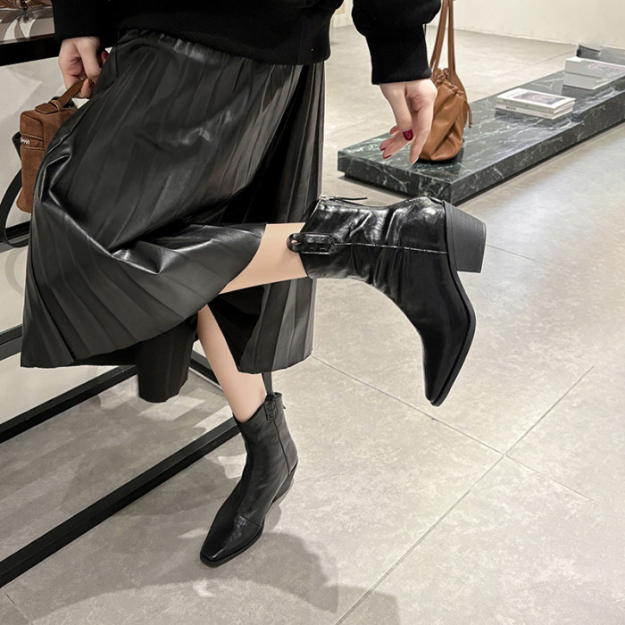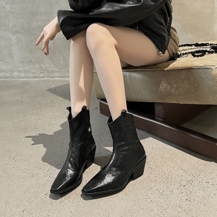 牛皮版~時髦尖頭V口顯瘦粗跟皺感西部短靴女真皮馬丁靴單靴小踝靴
