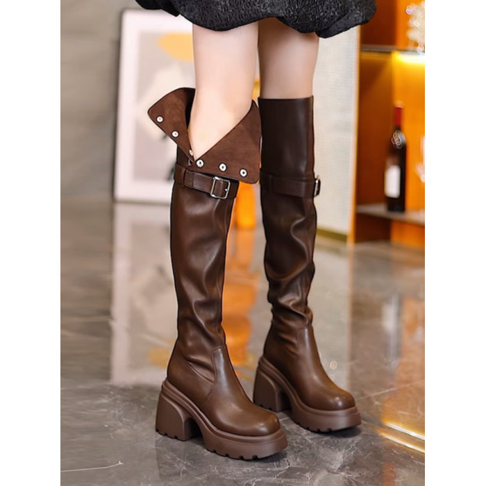 爆款過膝靴女春秋新款圓頭高跟長靴粗跟厚底兩穿皮面百搭高筒靴子