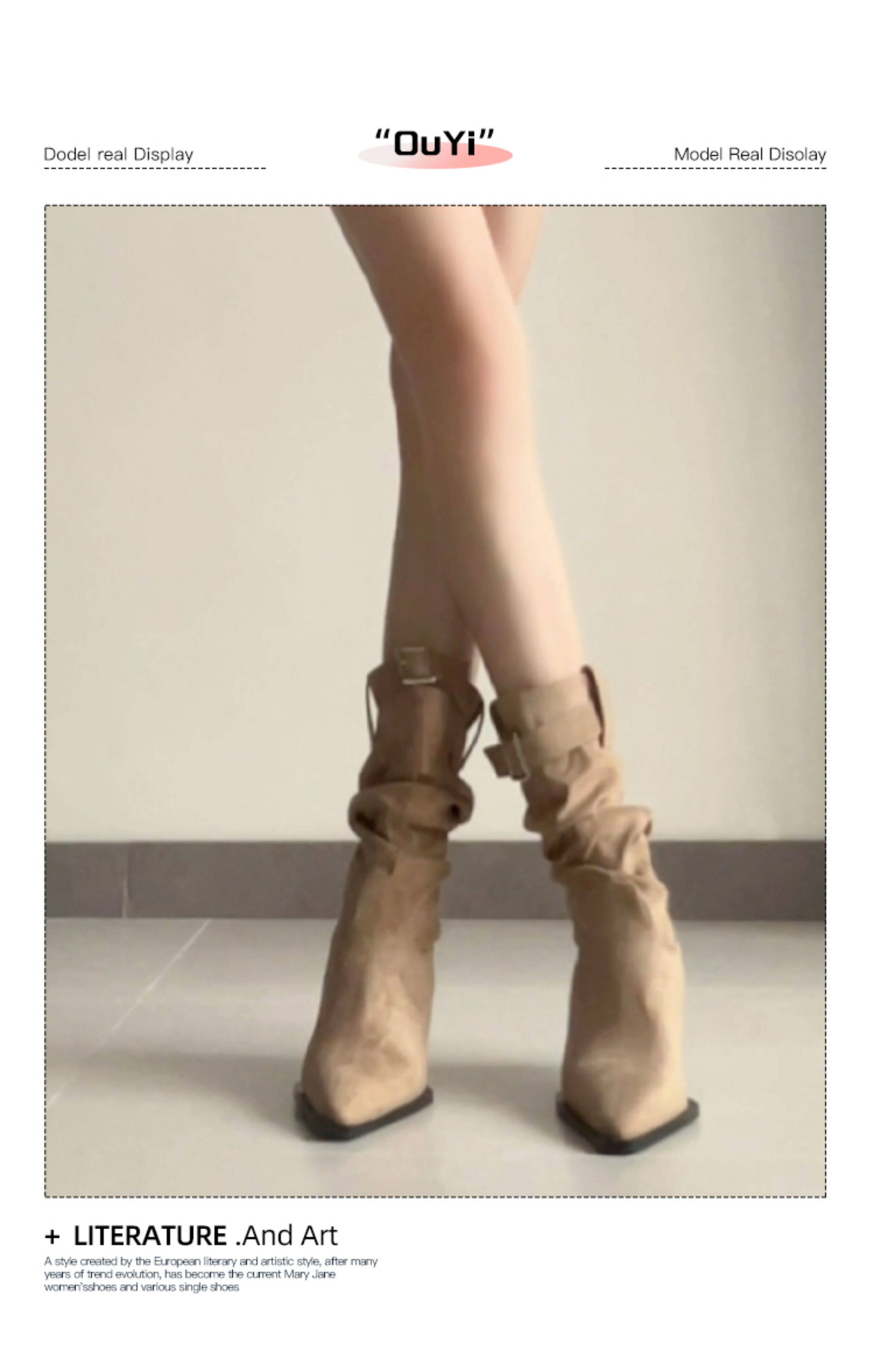 牛皮版~復古絨面短靴尖頭高跟中筒褶皺堆堆靴女新款顯瘦西部靴子