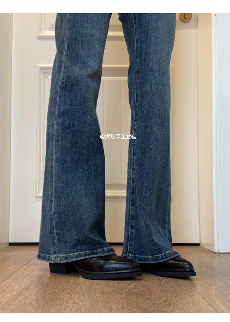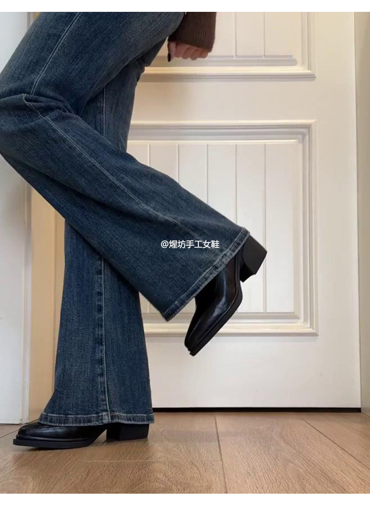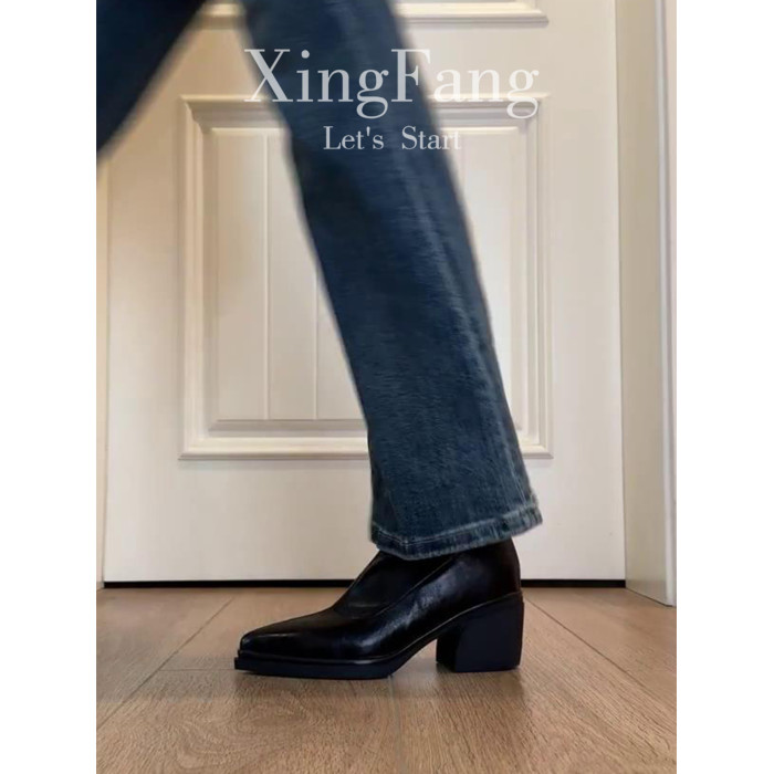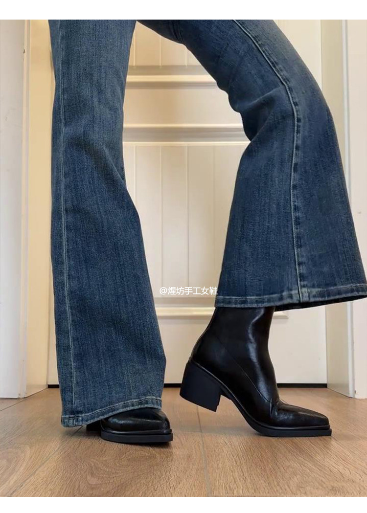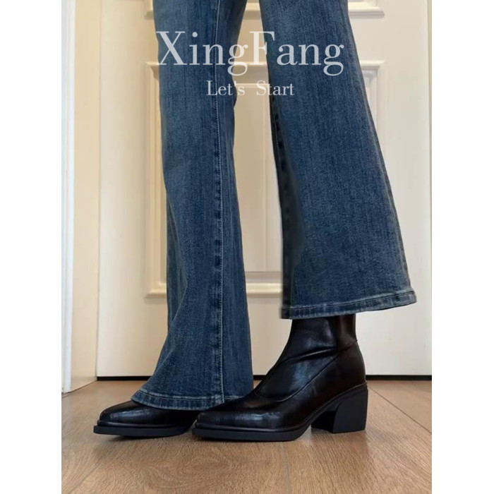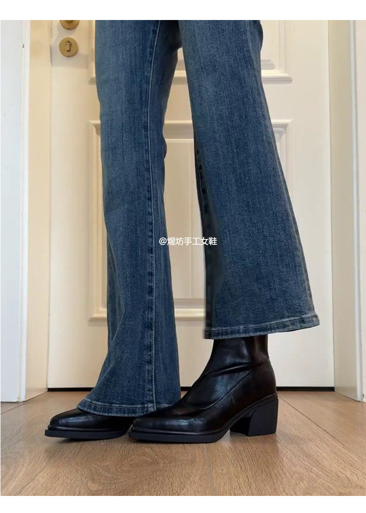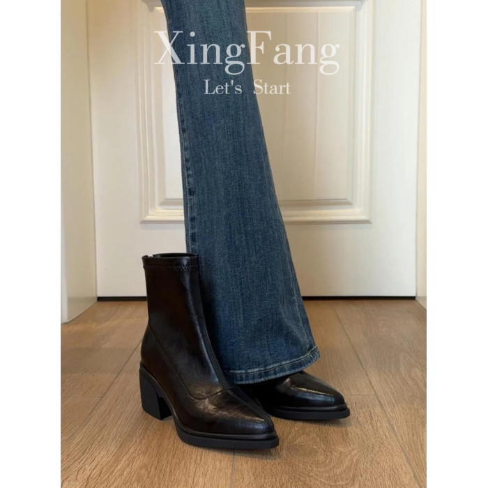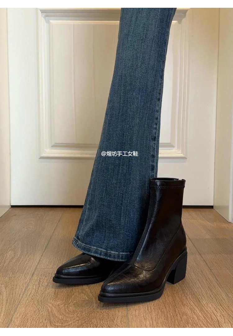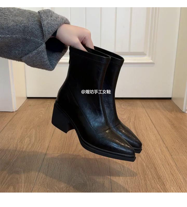 牛皮版~尖頭高跟短靴女秋冬新款復古厚底粗跟彈力瘦瘦靴馬丁靴子