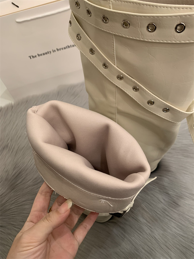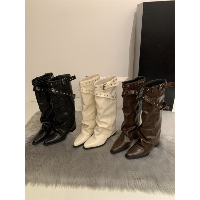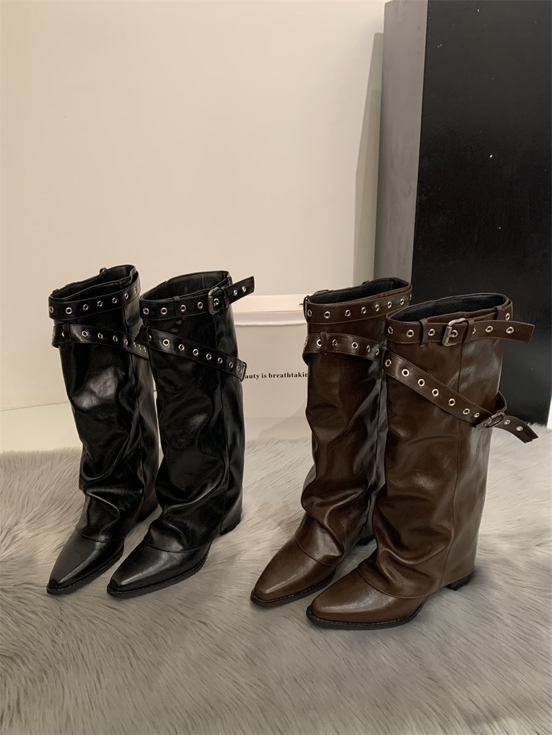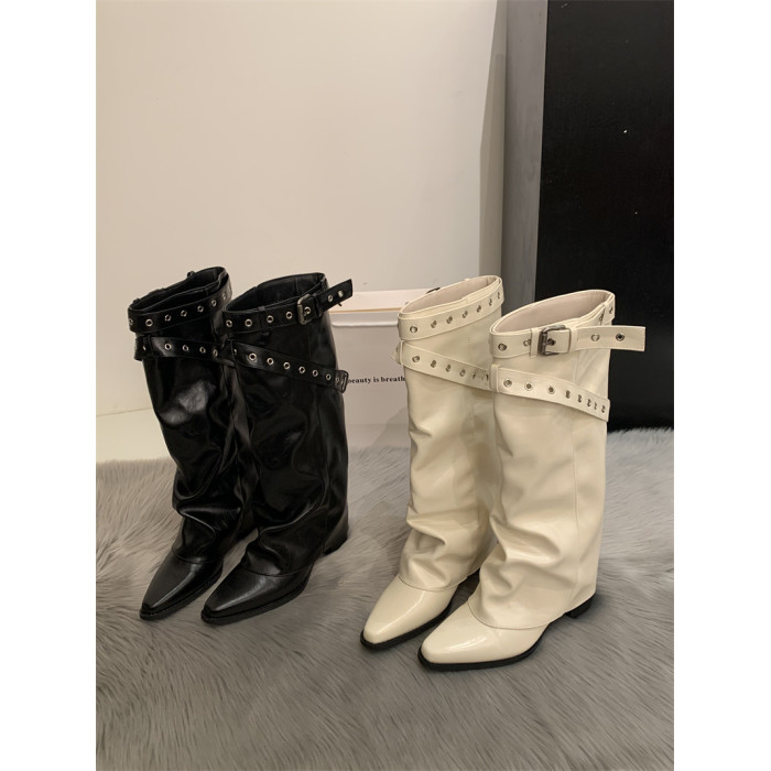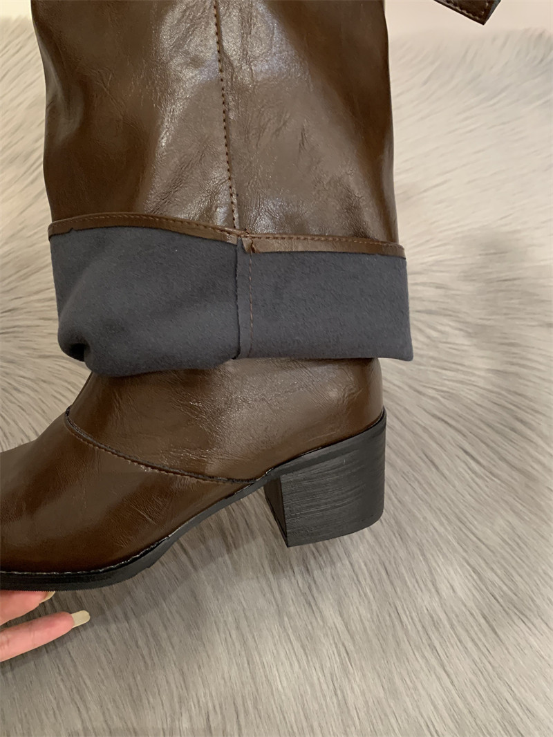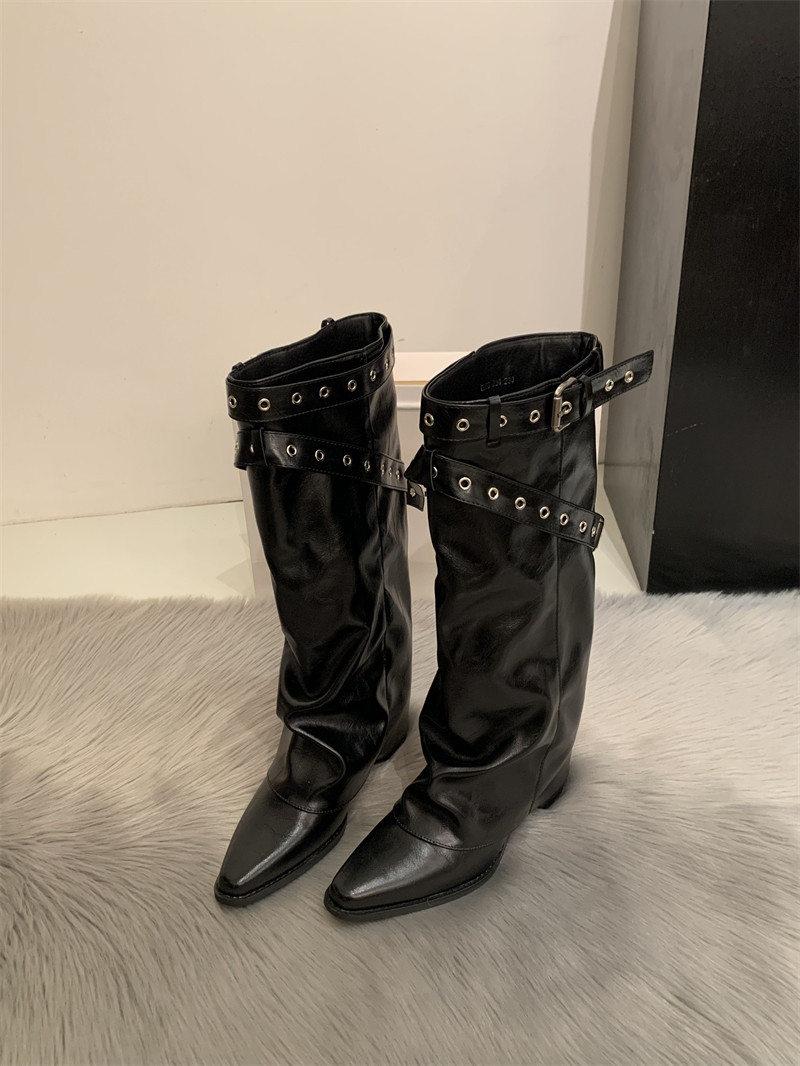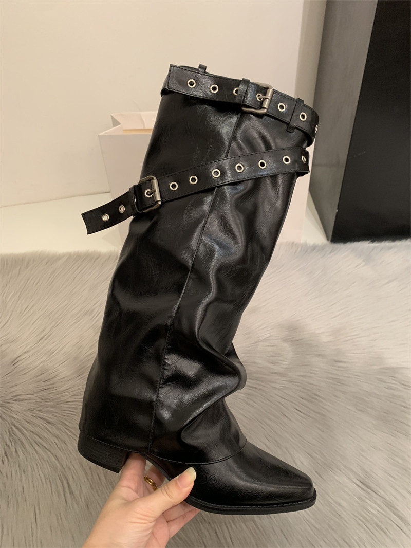 大筒圍不過膝長靴尖頭西部歐美高跟粗跟黑色堆堆騎士褲琯長筒靴女
