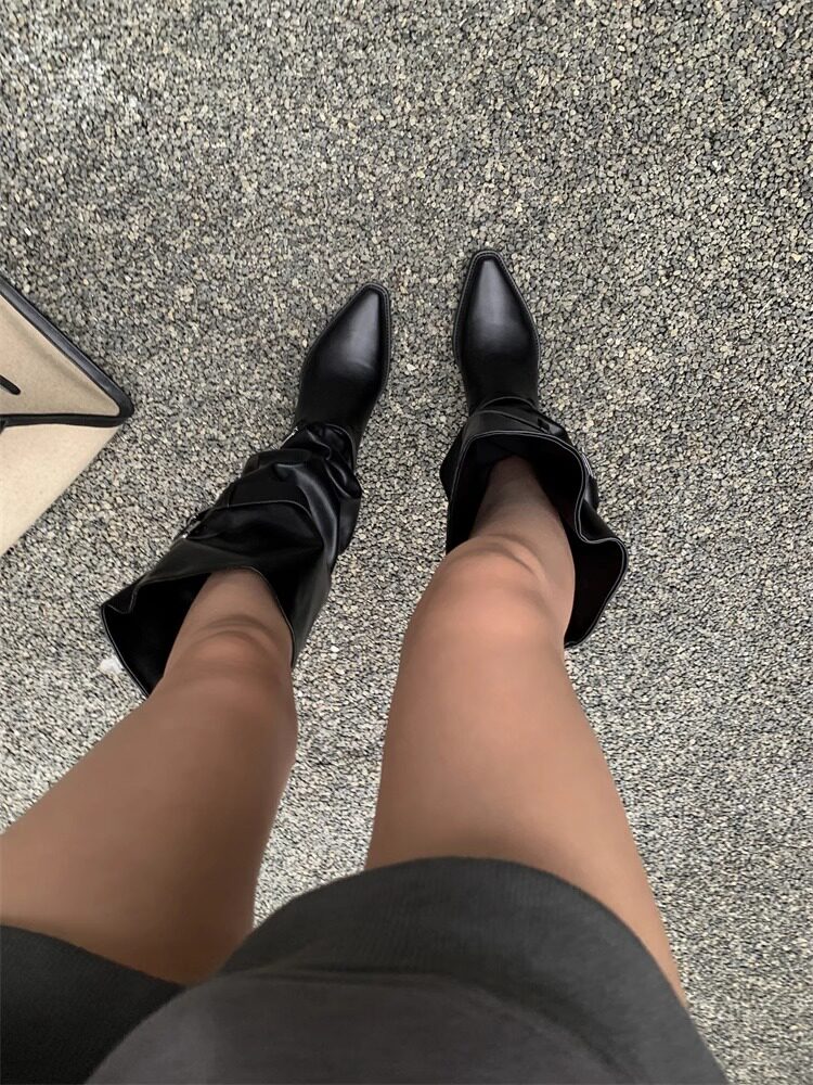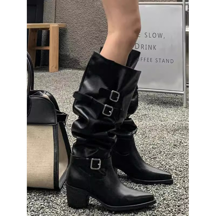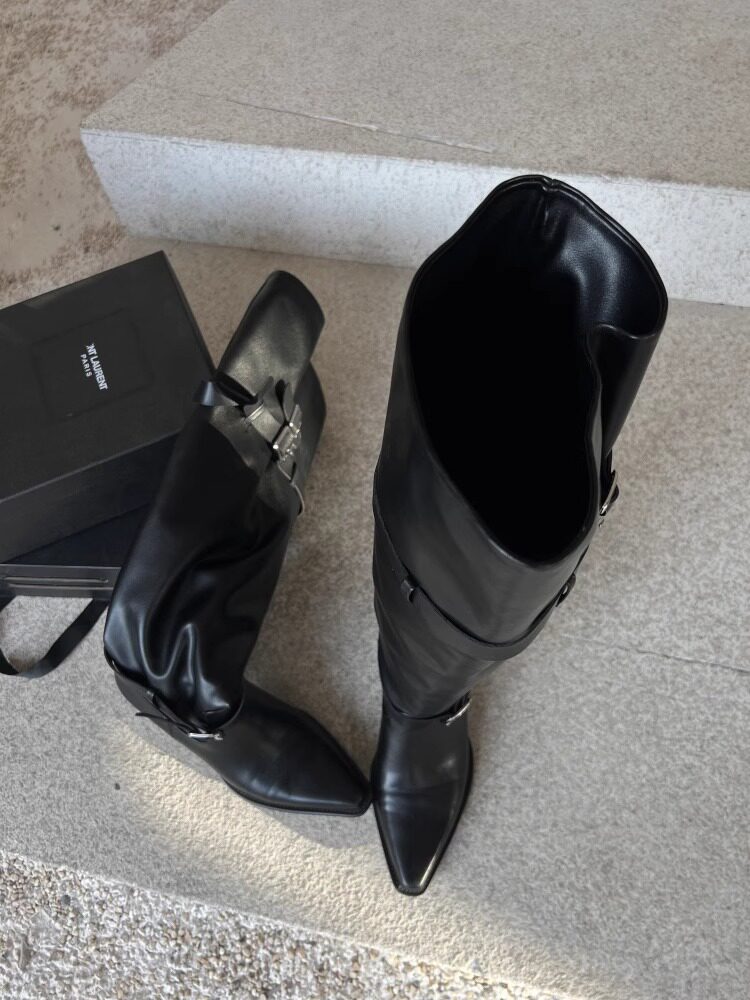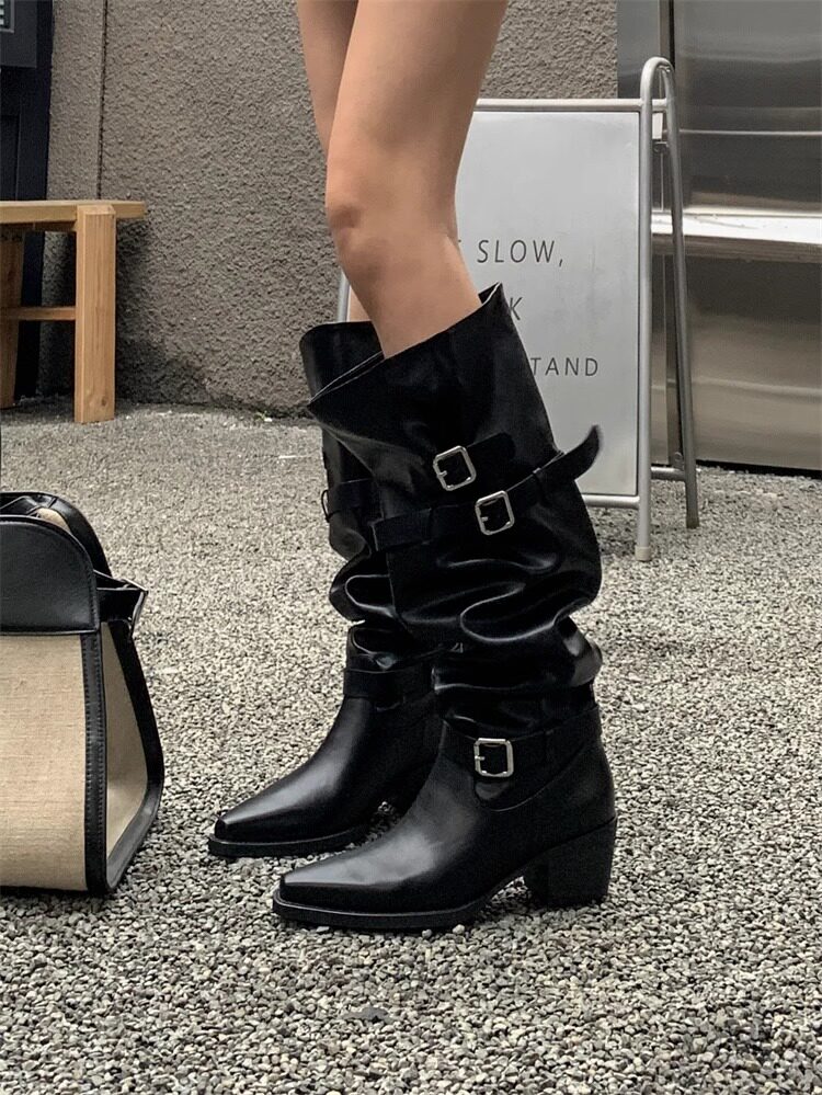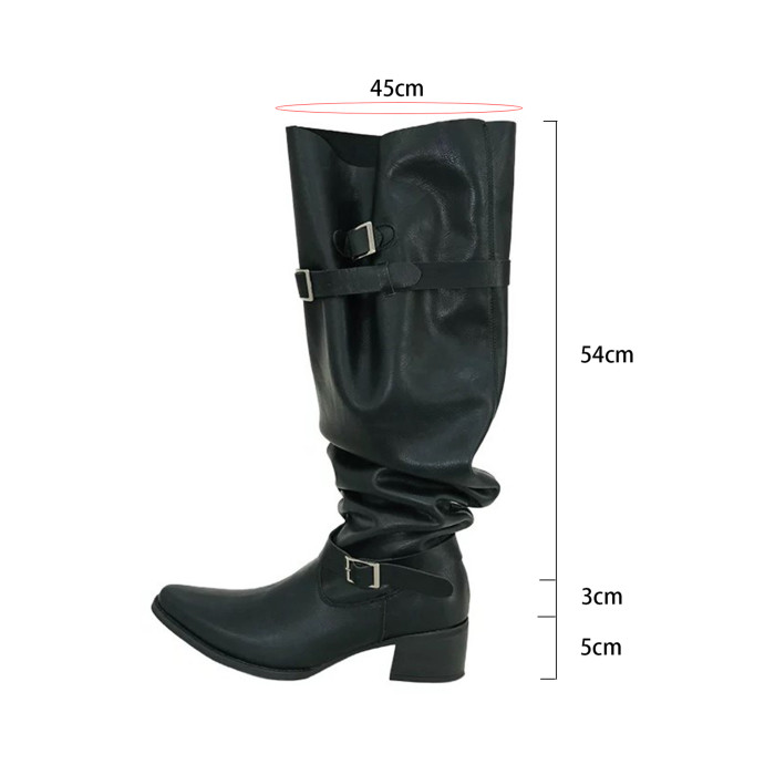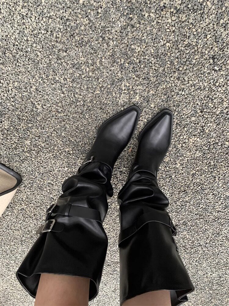七個橙~真皮尖頭騎士靴女不過膝長靴粗跟釦帶長筒靴內增高堆堆靴