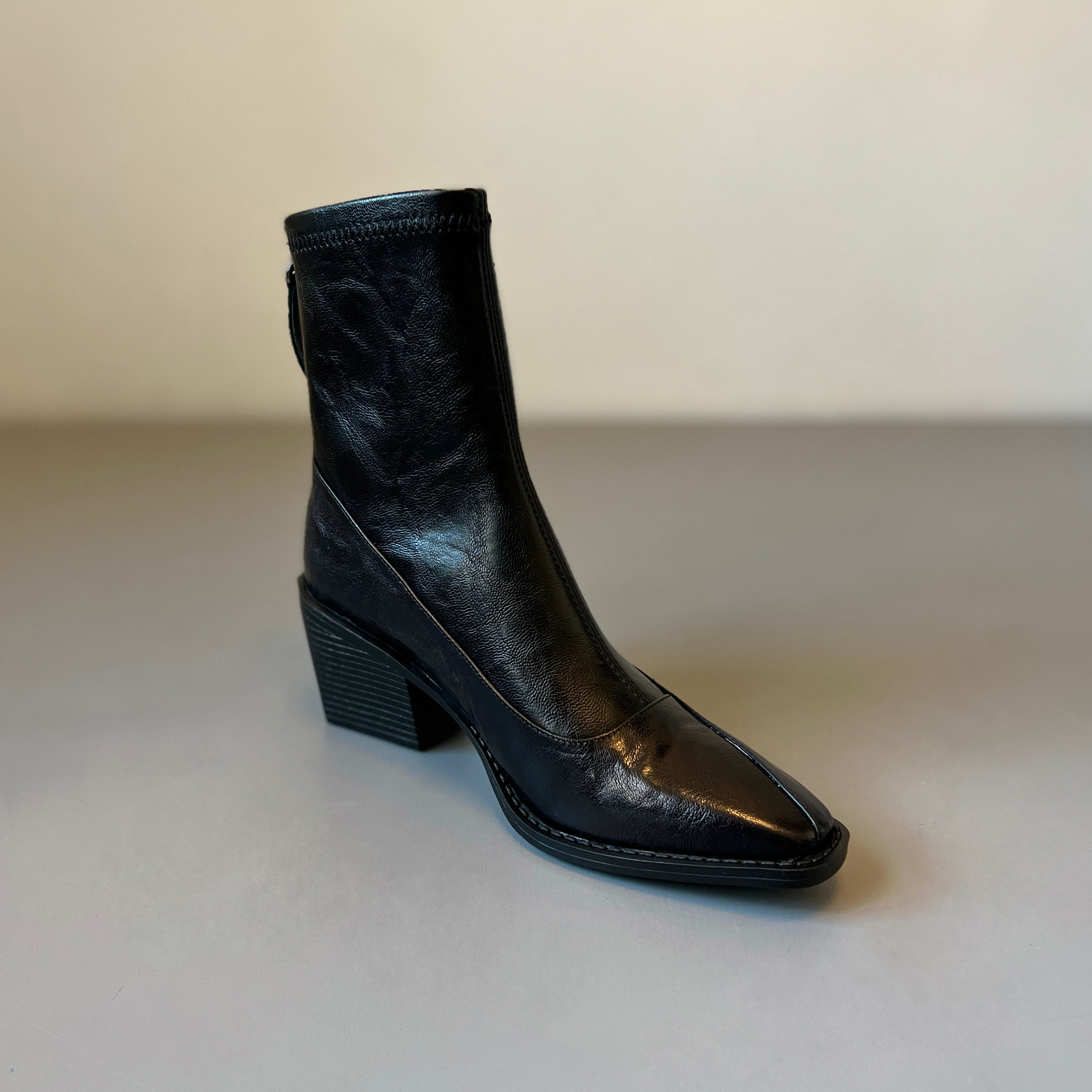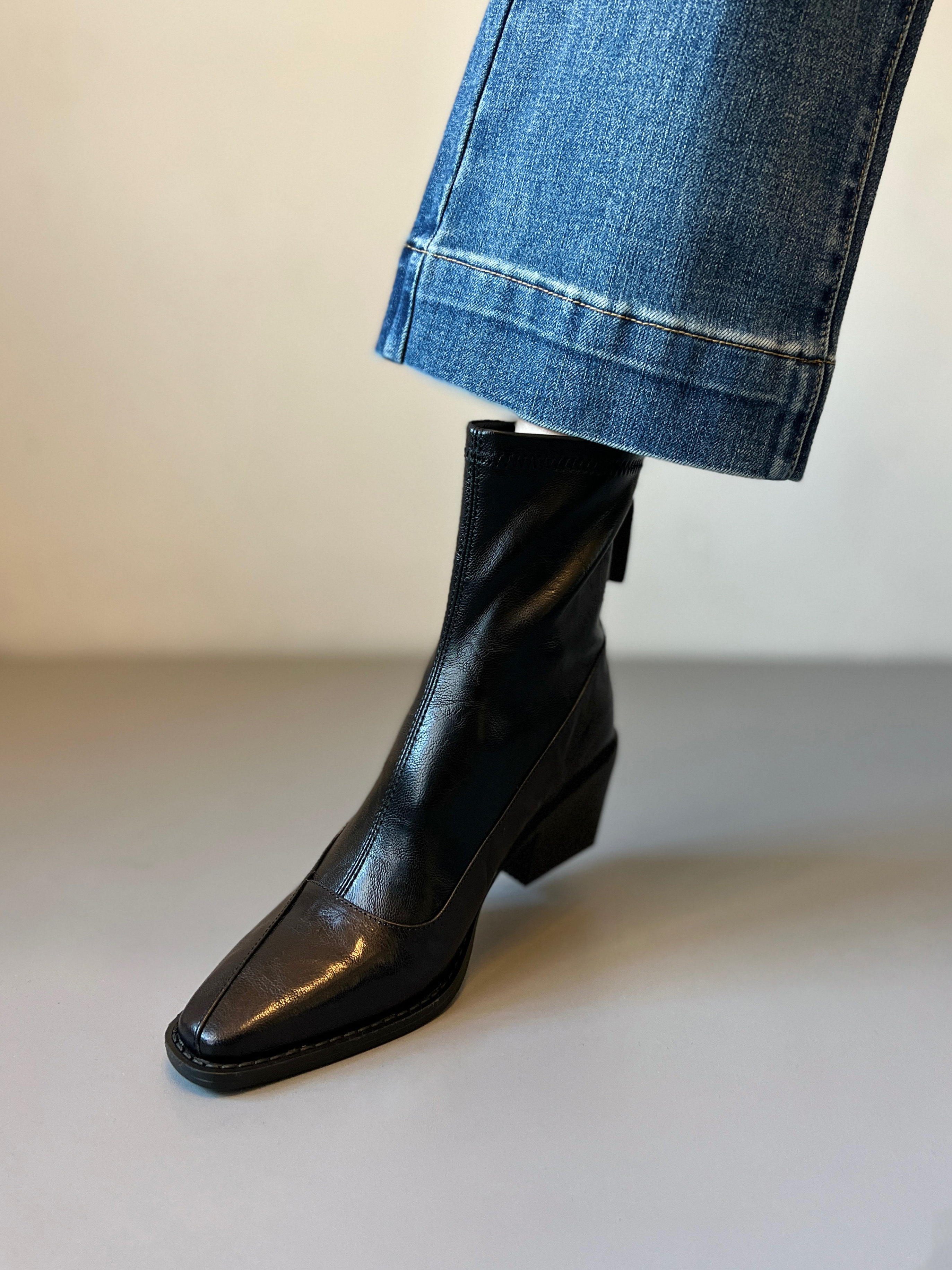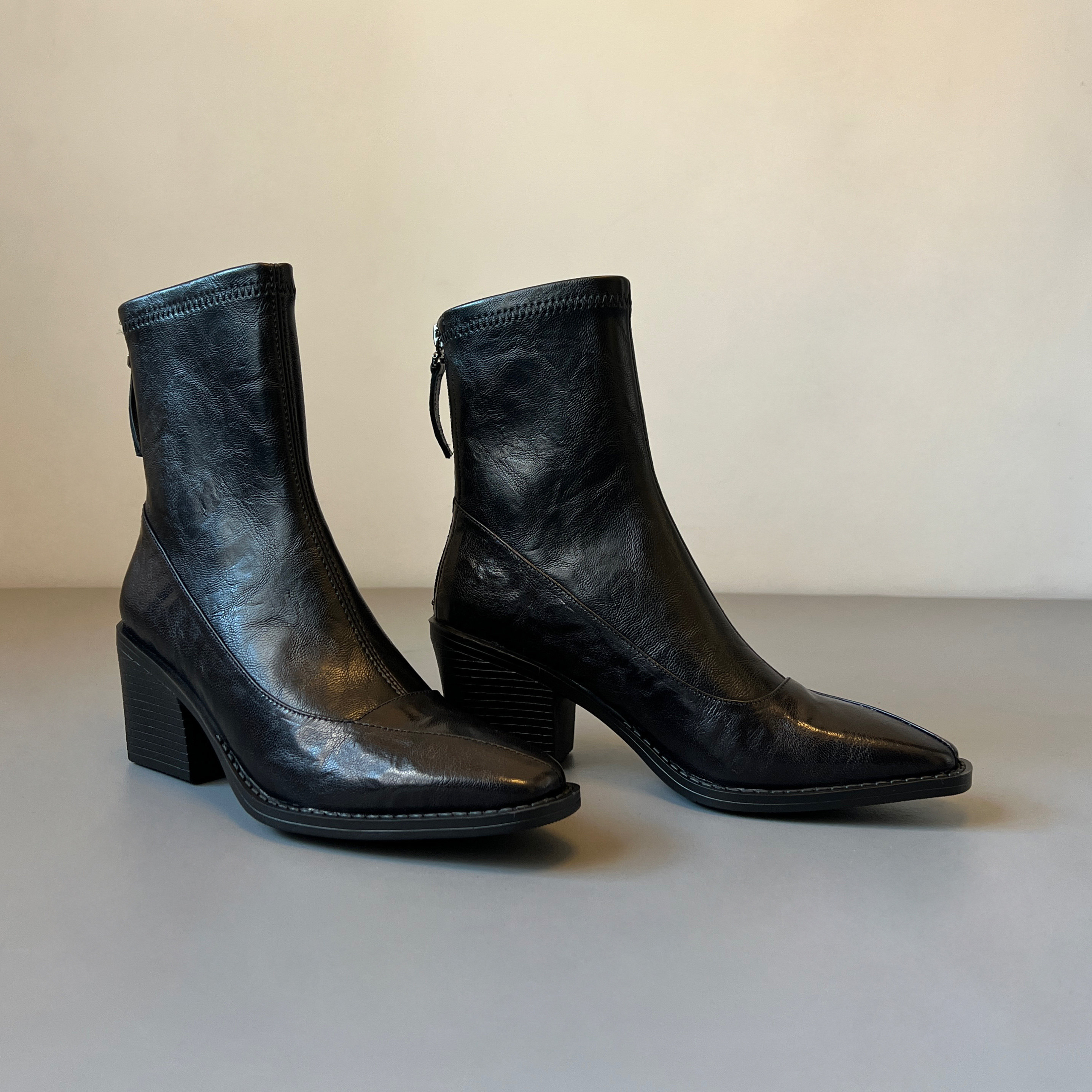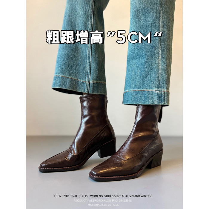 真皮~復古方頭粗跟短靴女2025新款黑色切爾西瘦瘦靴百搭馬丁靴女