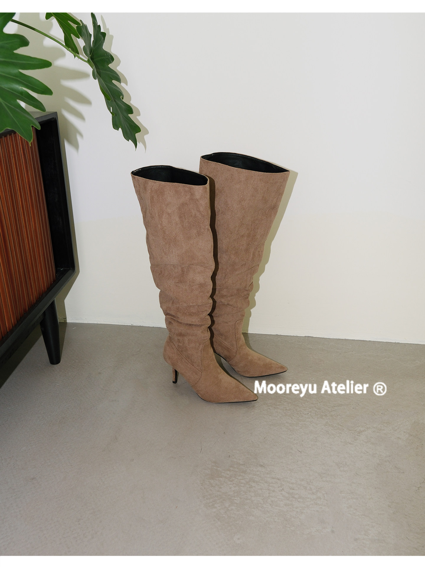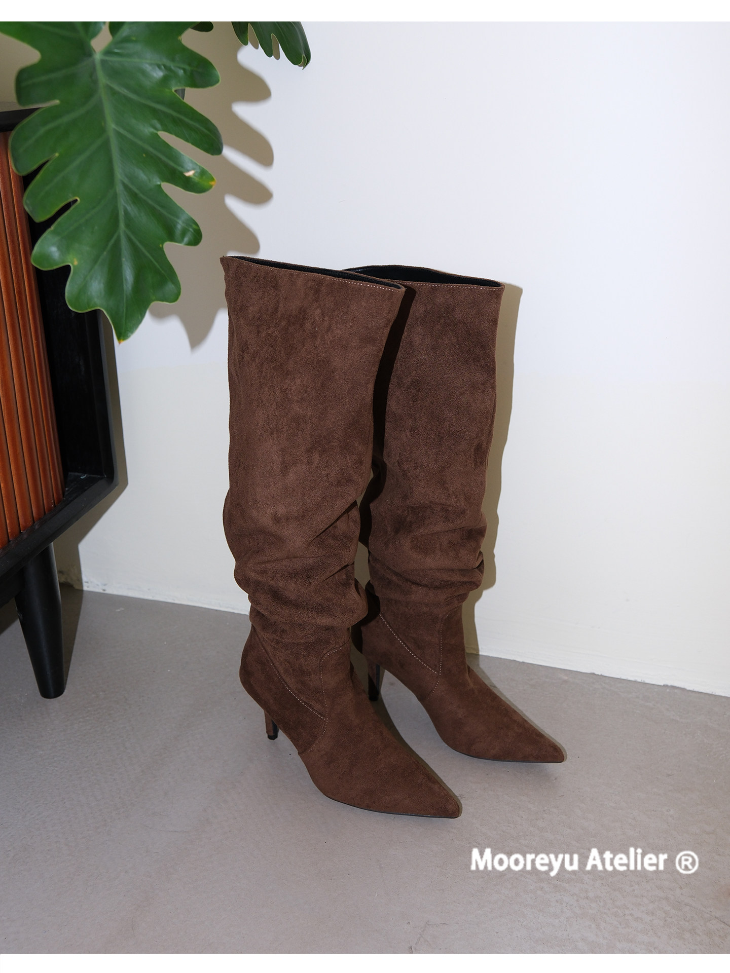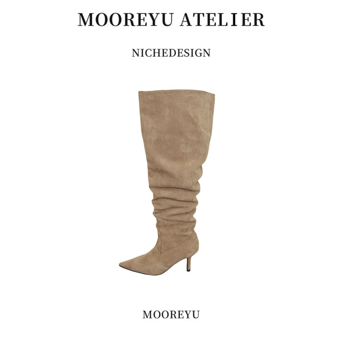 Mooreyu細高跟尖頭長靴女春夏新款復古褶皺堆堆大筒圍不過膝靴子
