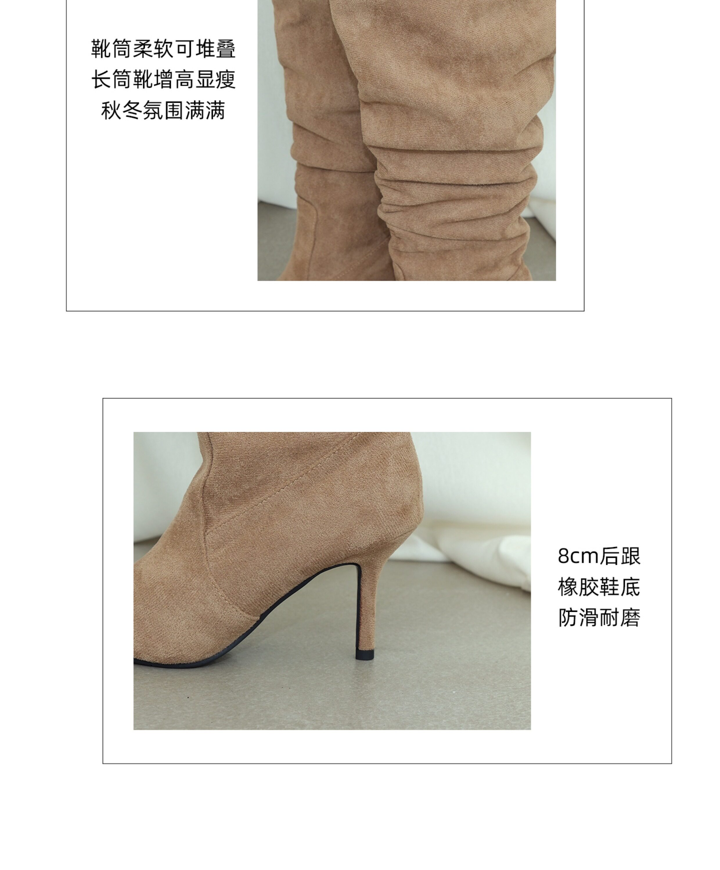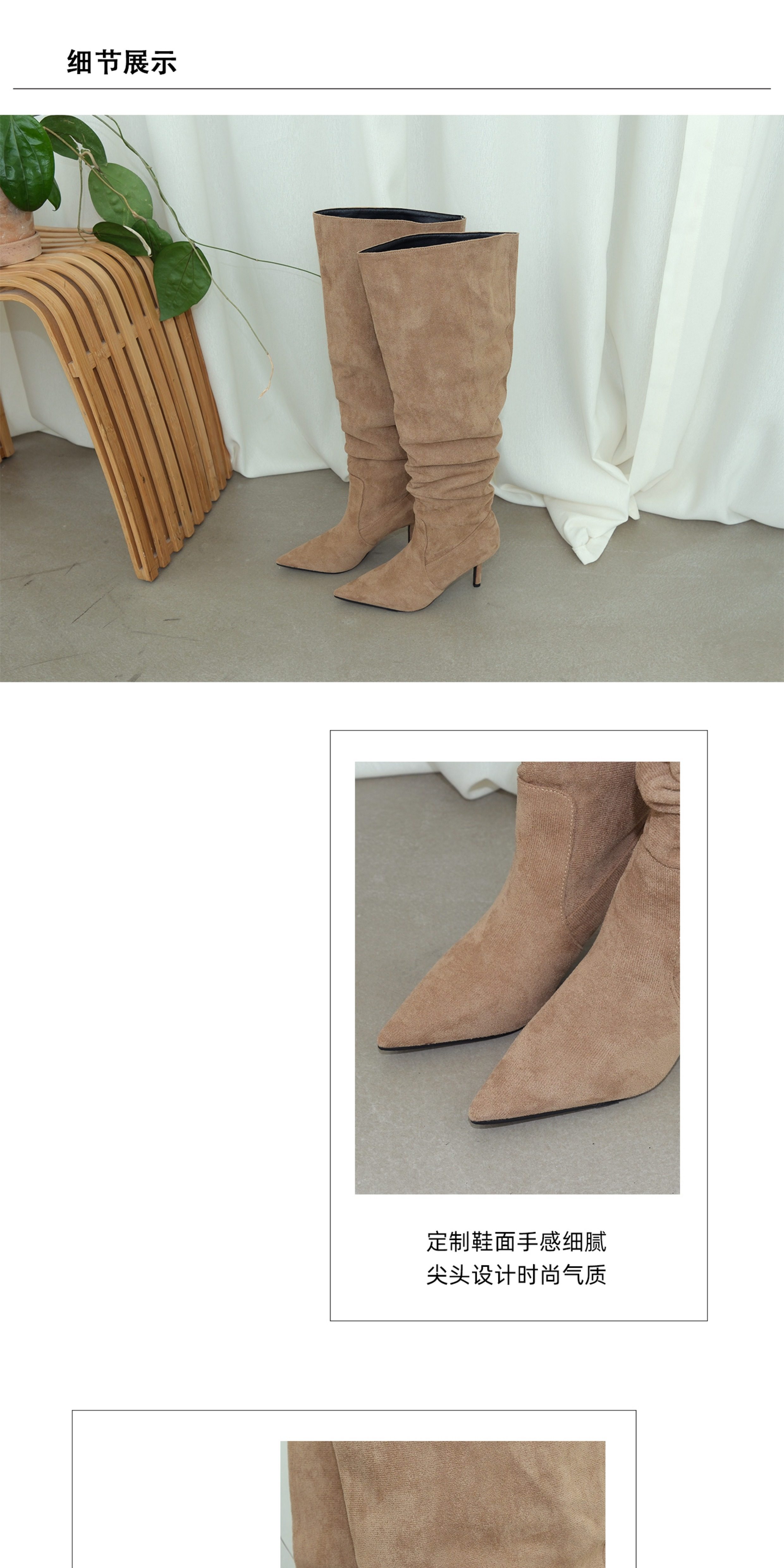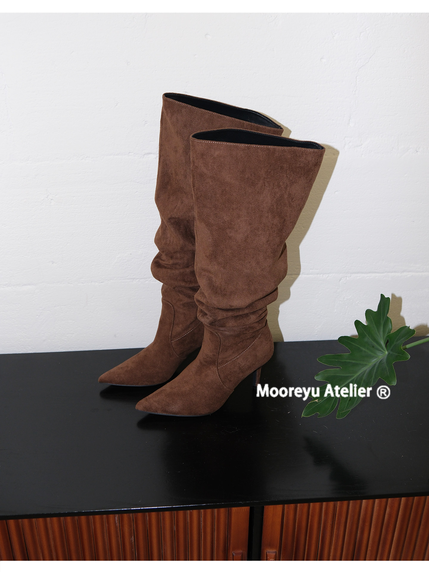 Mooreyu細高跟尖頭長靴女春夏新款復古褶皺堆堆大筒圍不過膝靴子