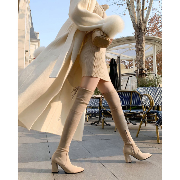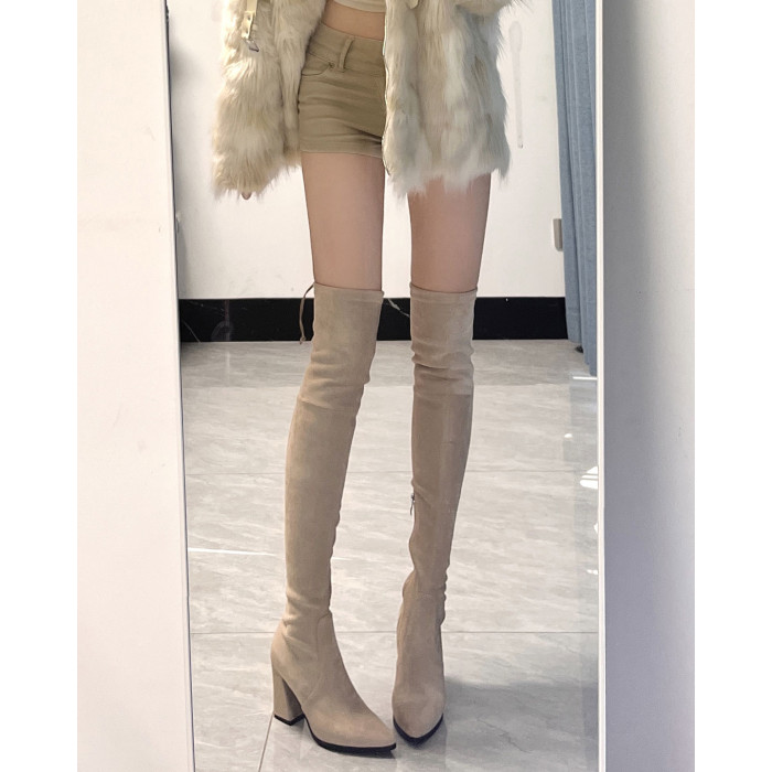 戈丹琳 2025新款過膝靴女長靴尖頭粗跟高跟彈力黑色側拉鍊瘦瘦靴