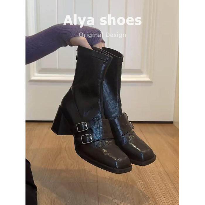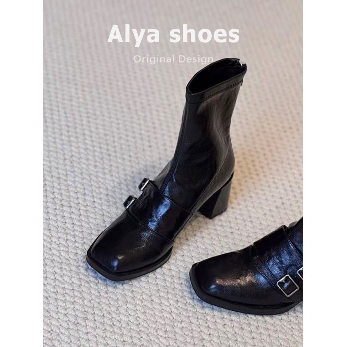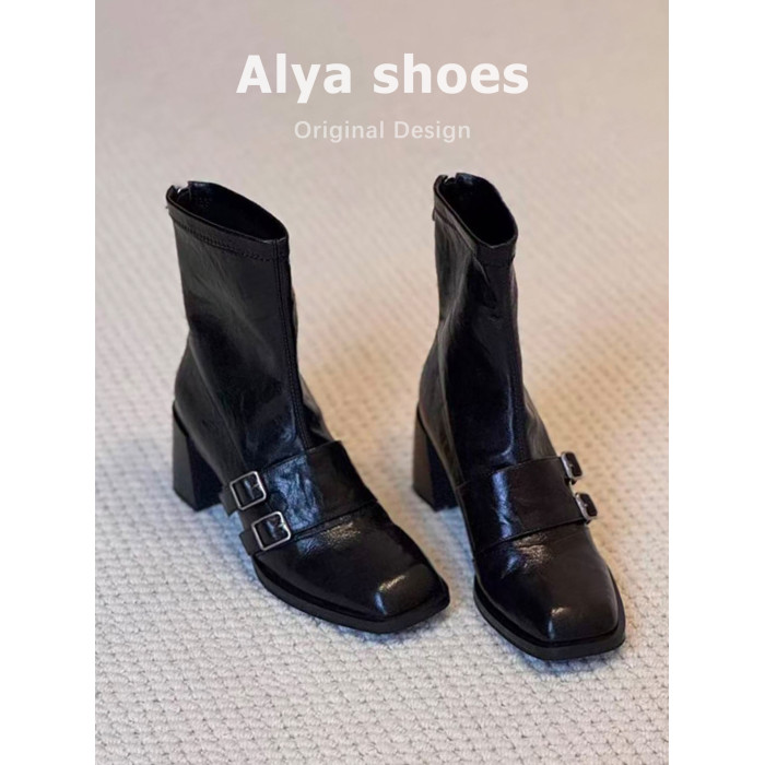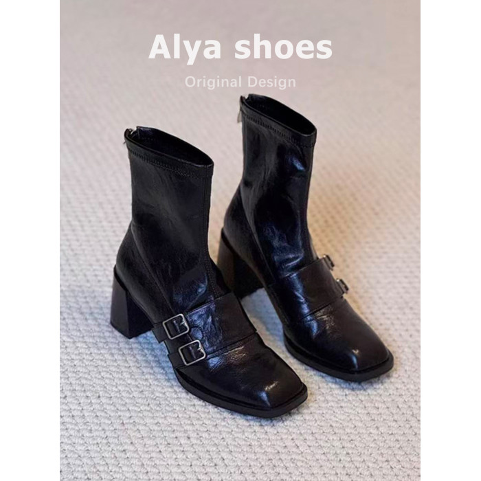 羊皮版~粗高跟短靴女秋冬新款皮帶釦氣質彈力靴方頭百搭瘦瘦靴子
