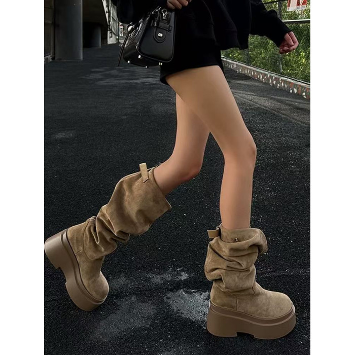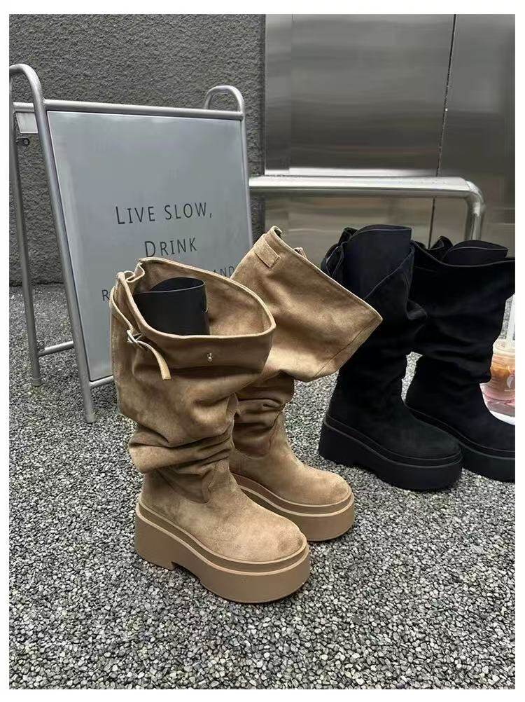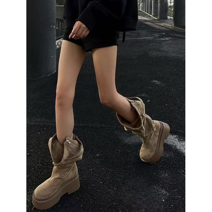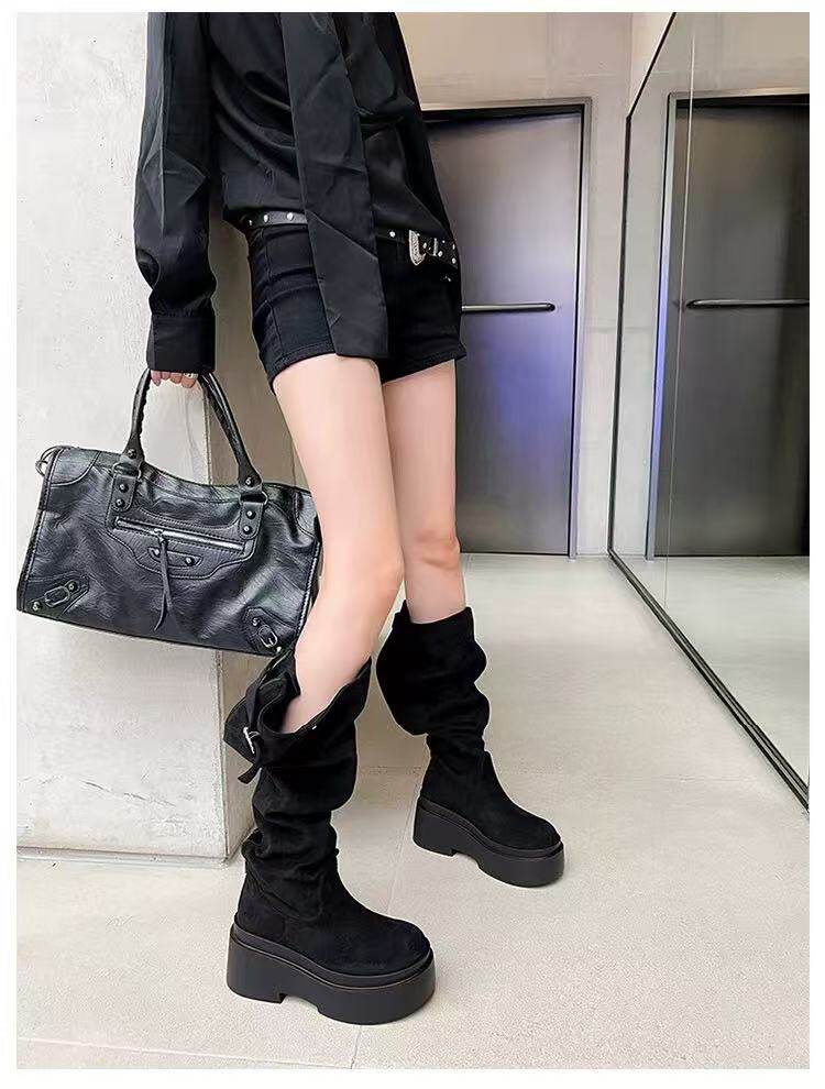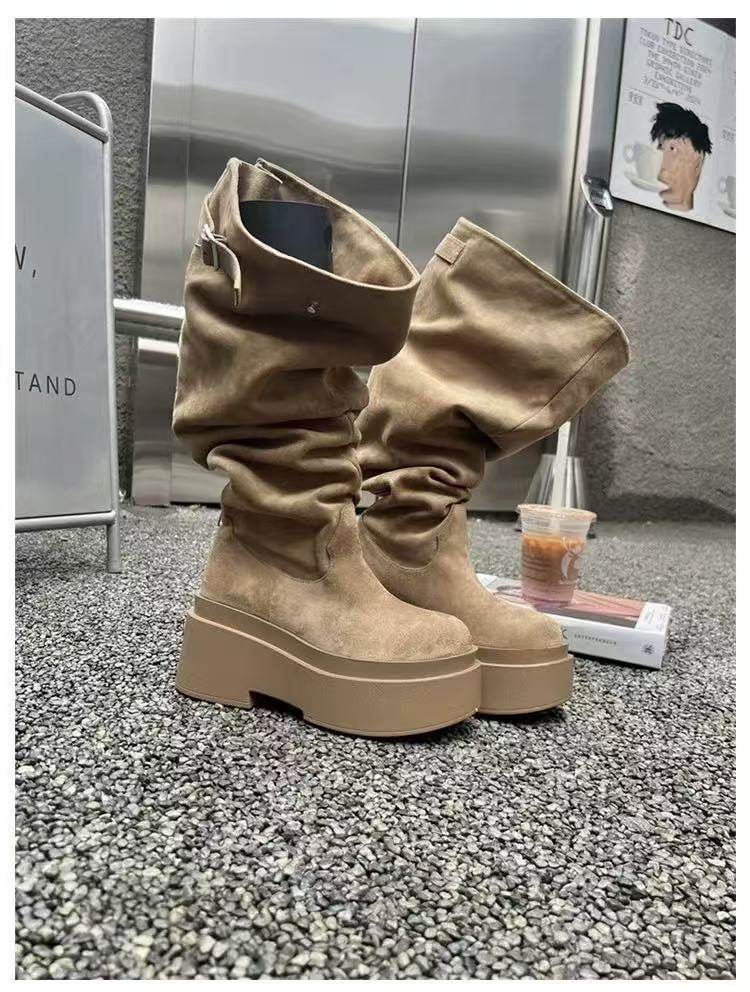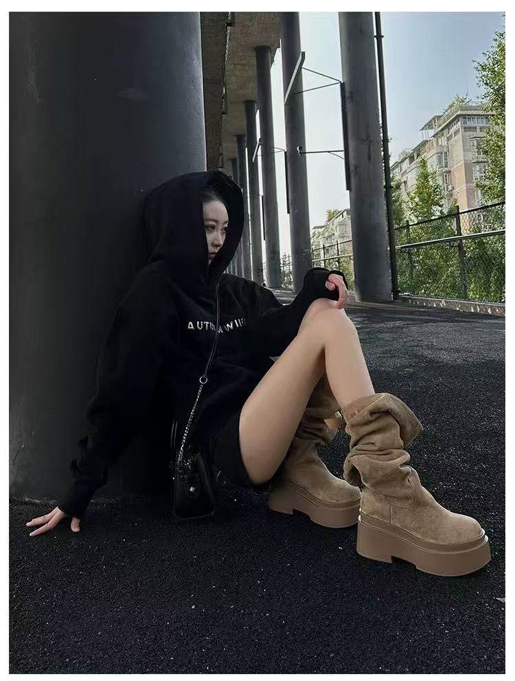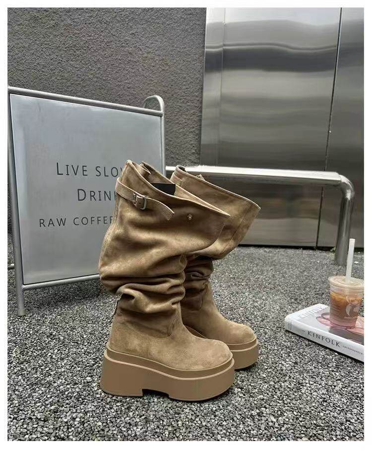長筒靴女夏季2025新款小個子厚底增高長靴大西北穿搭棕色堆堆靴子