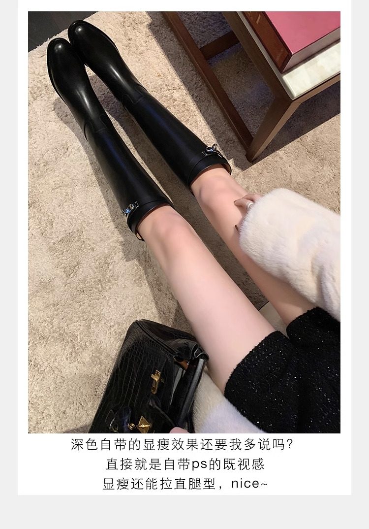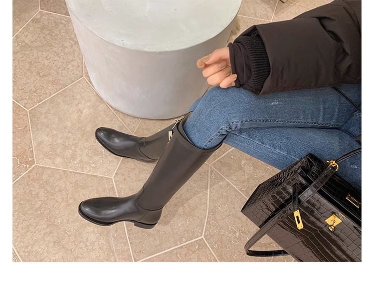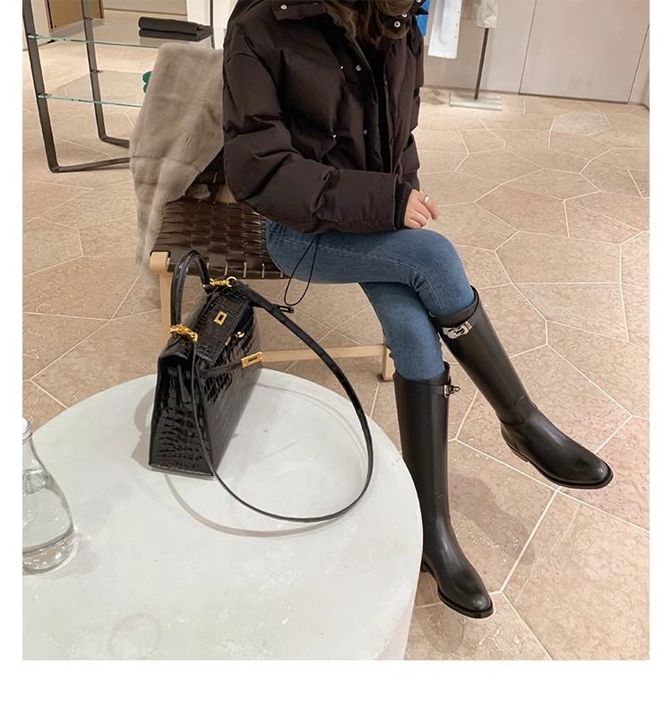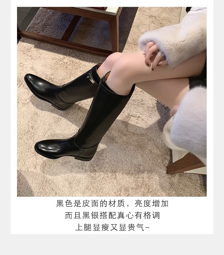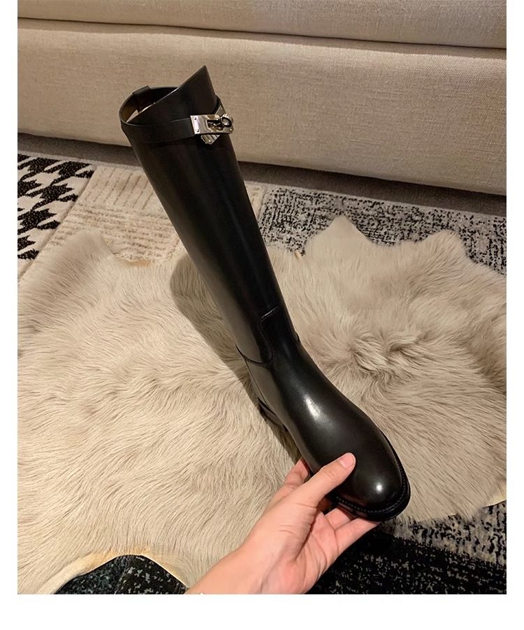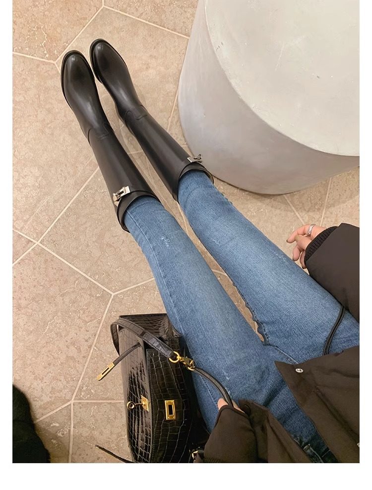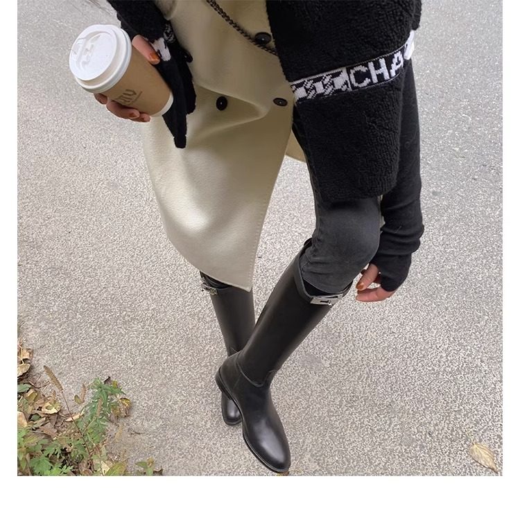 2025新款高級感皮帶釦V口騎士靴女冬不過膝長筒靴高筒靴平底長靴