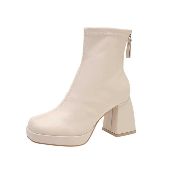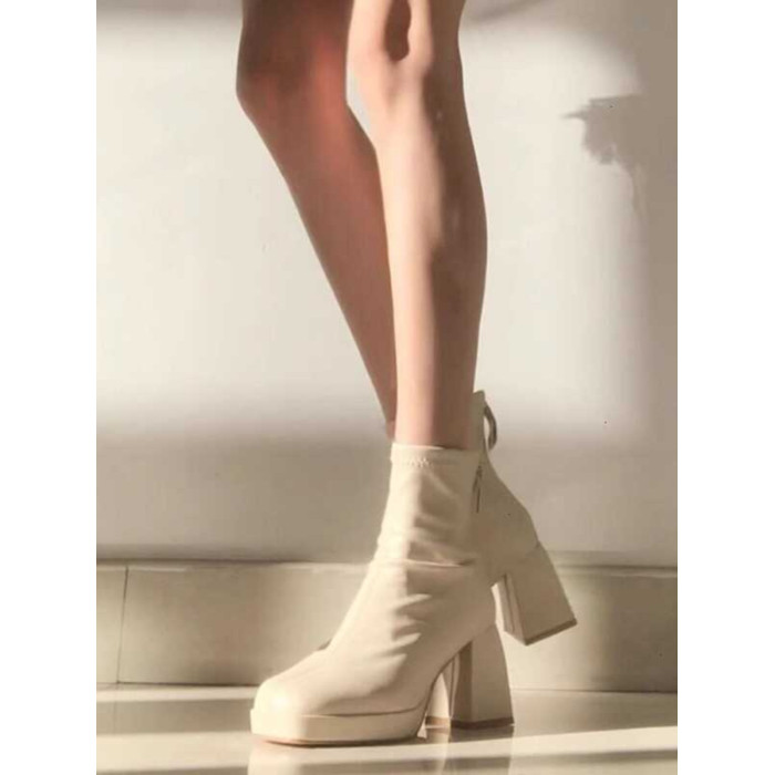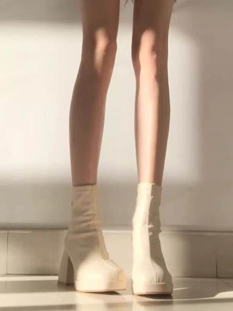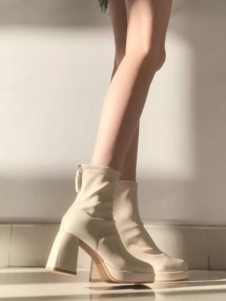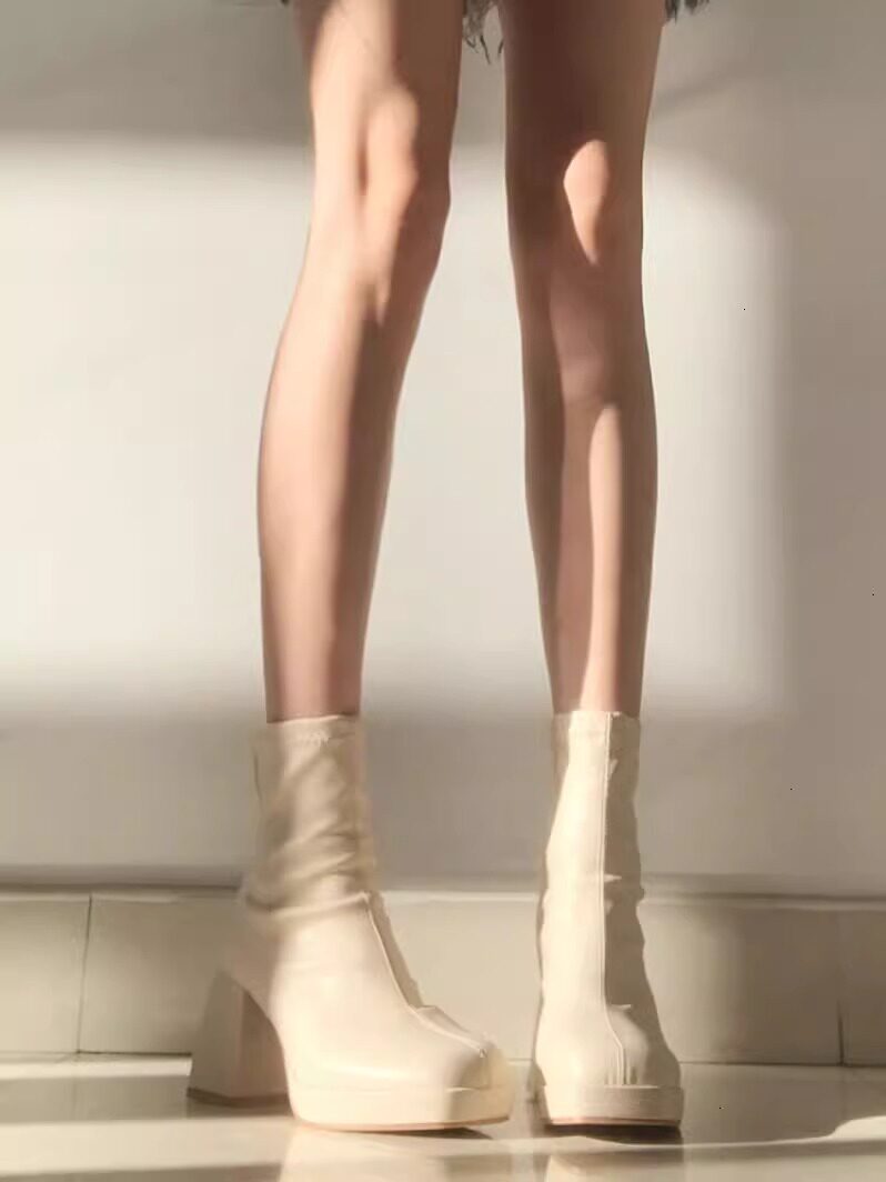 方頭白色高跟短靴女秋季厚底馬丁靴粗跟彈力靴防水台小踝靴瘦瘦靴