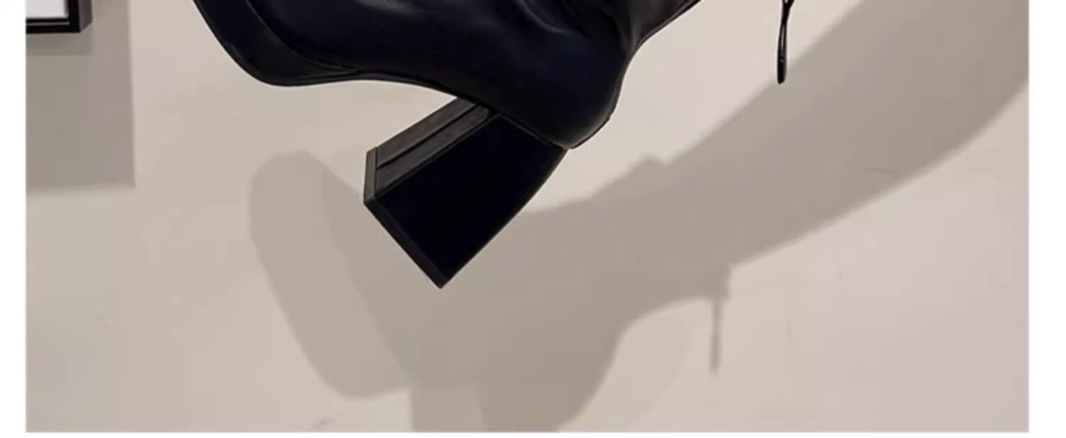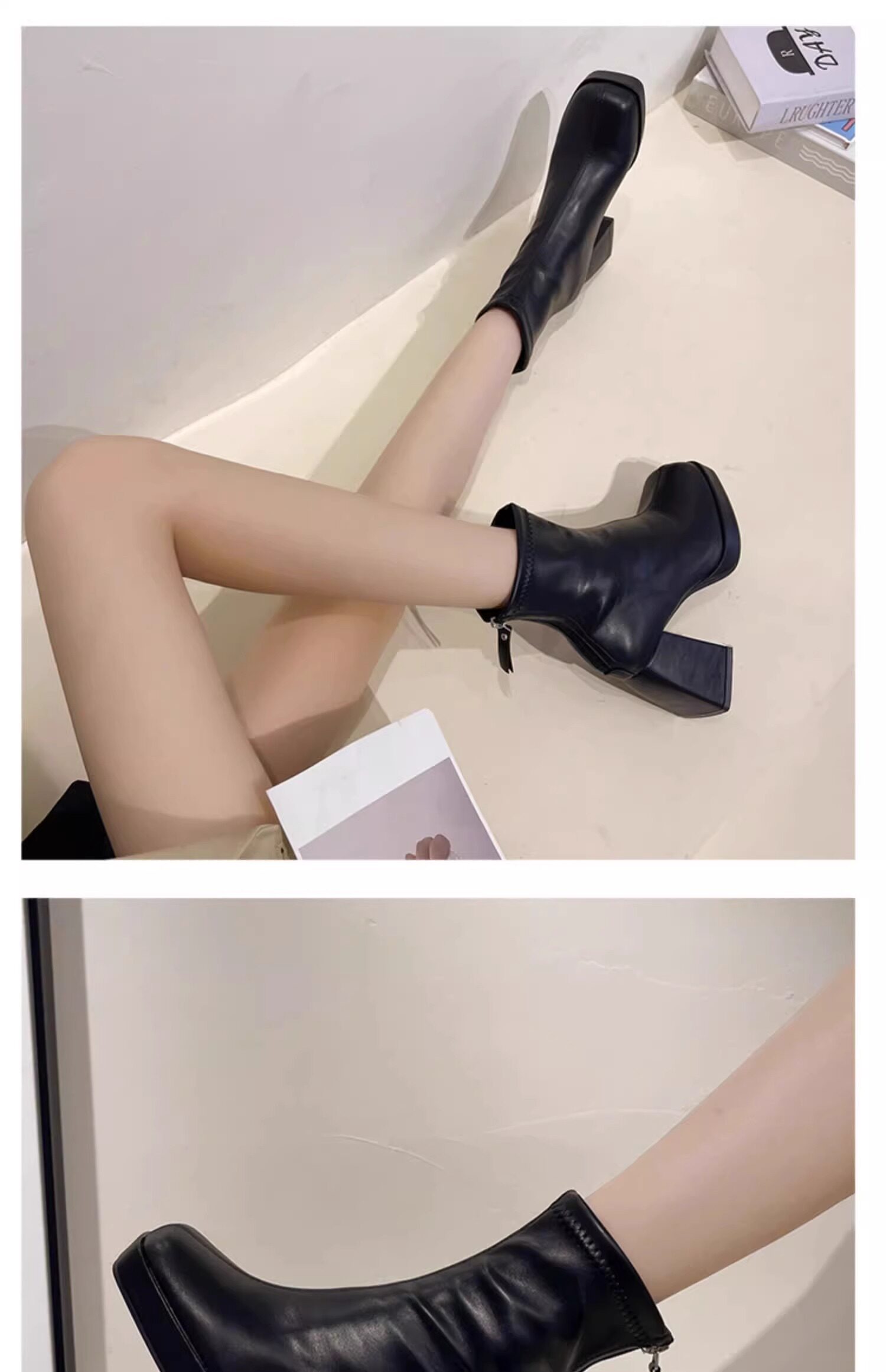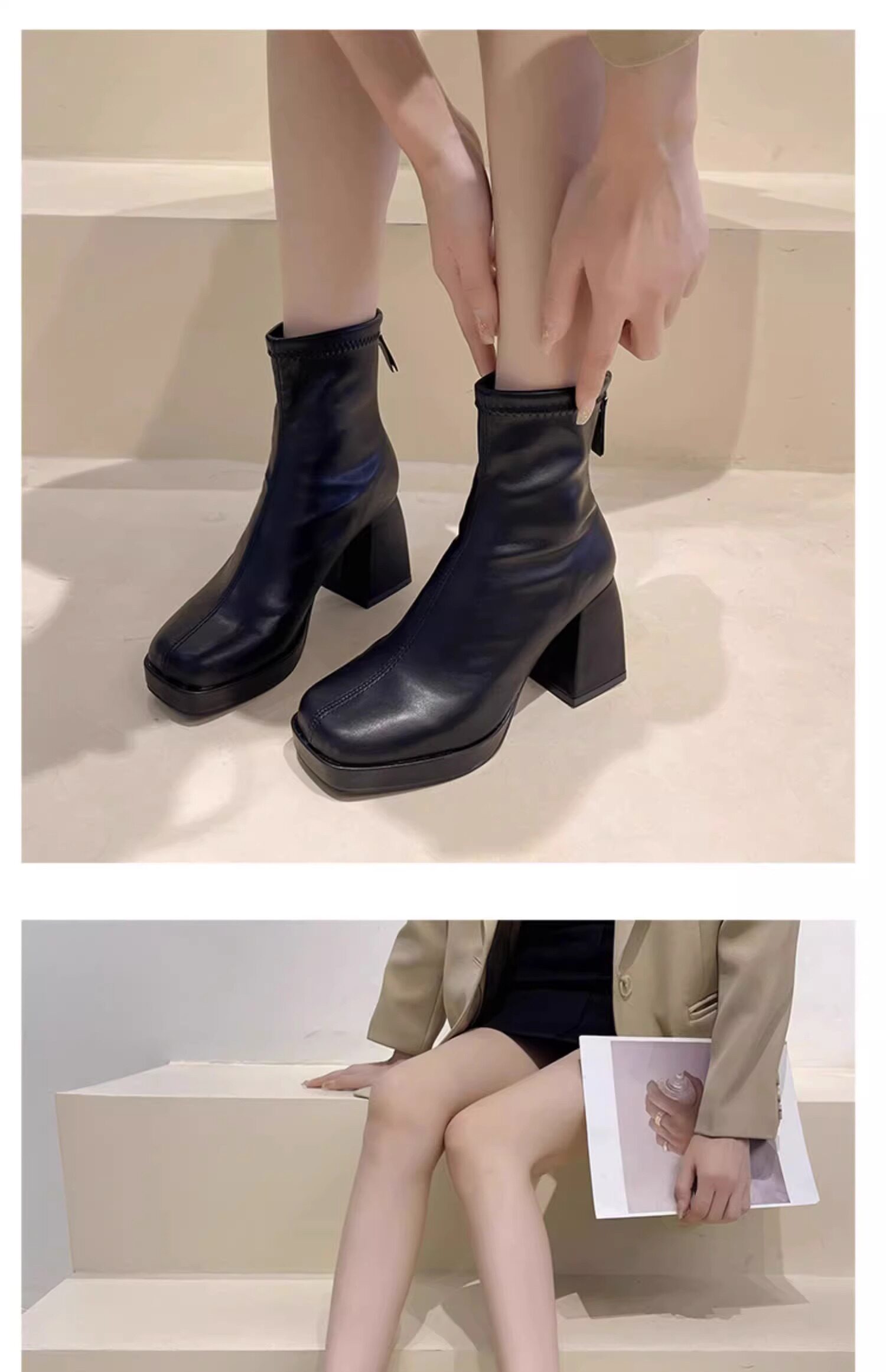 方頭白色高跟短靴女秋季厚底馬丁靴粗跟彈力靴防水台小踝靴瘦瘦靴