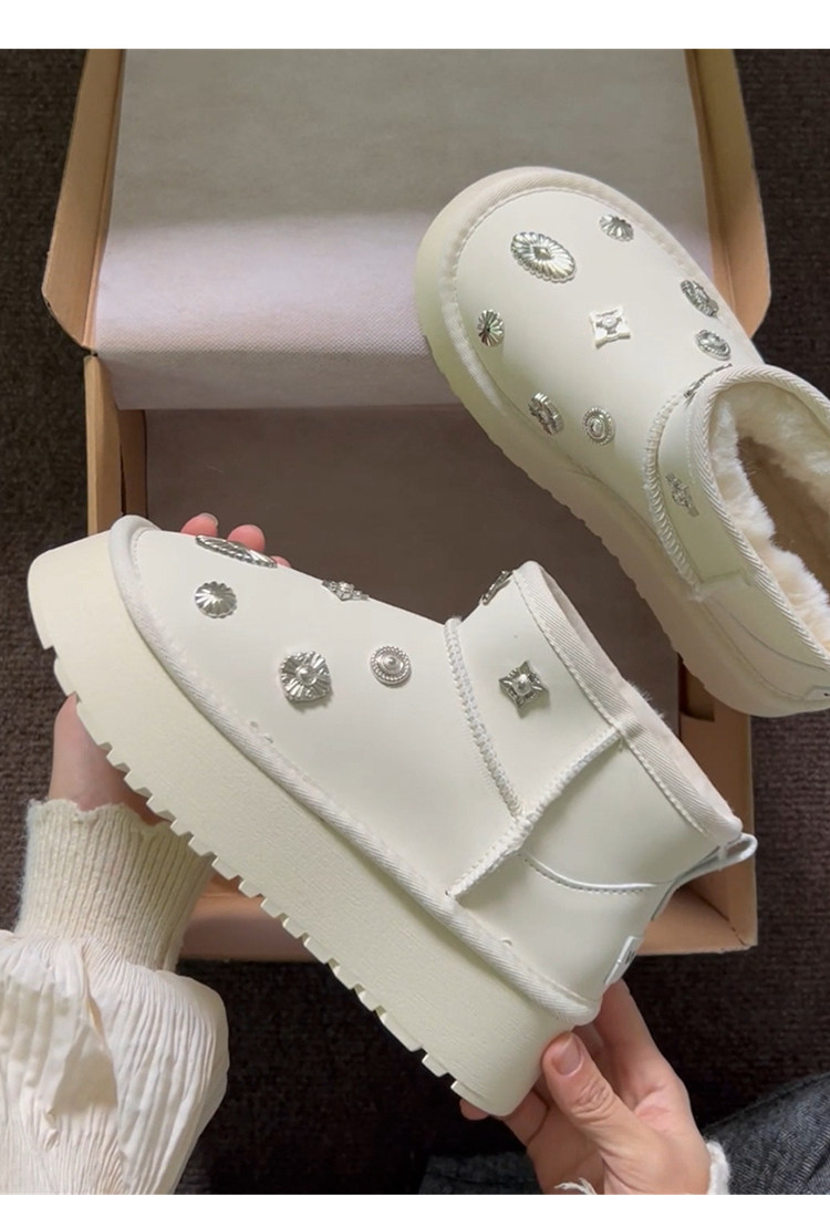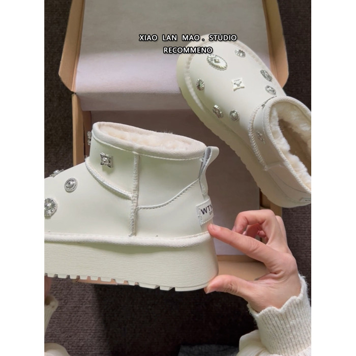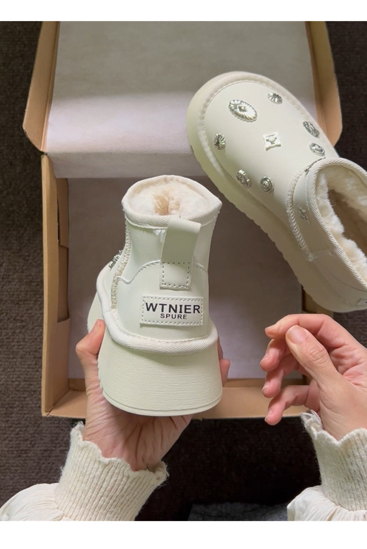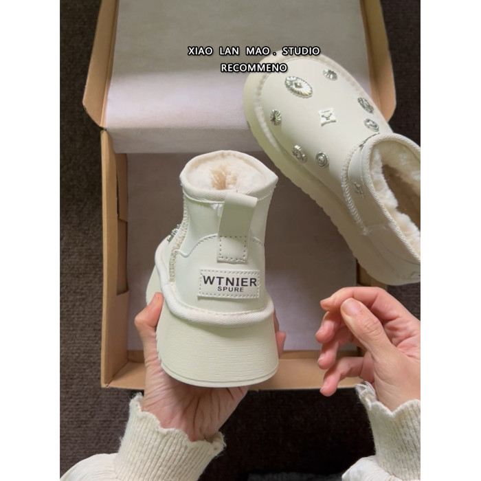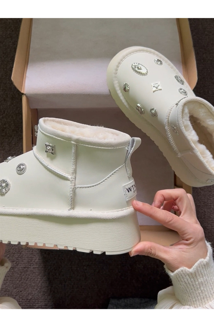 白色水鑽厚底百搭增高雪地靴女2025冬季新款加絨加厚保暖短筒棉鞋
