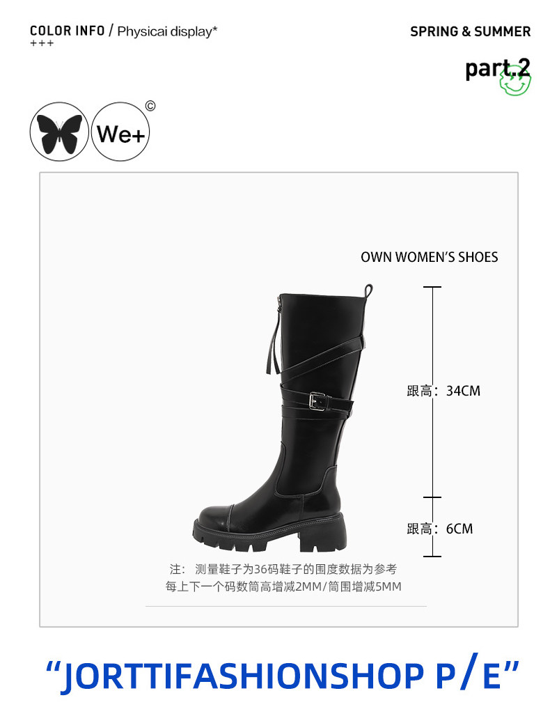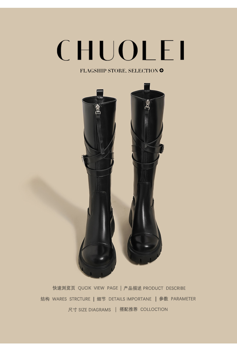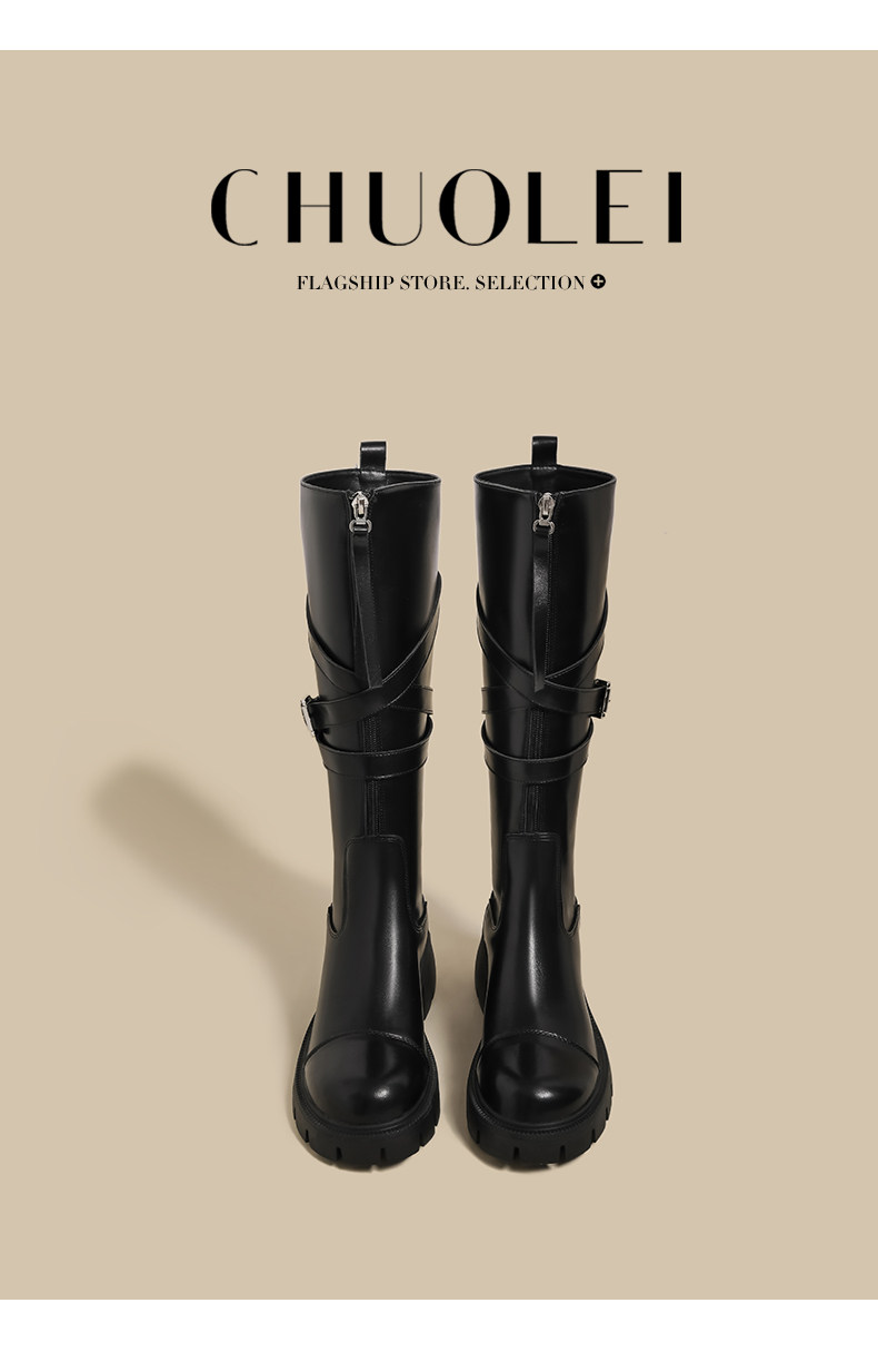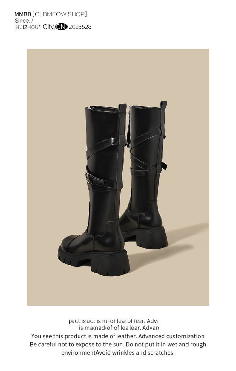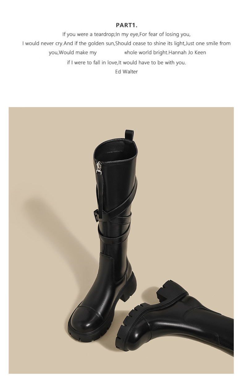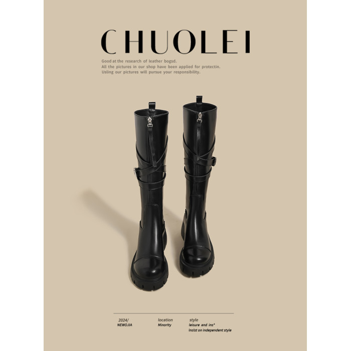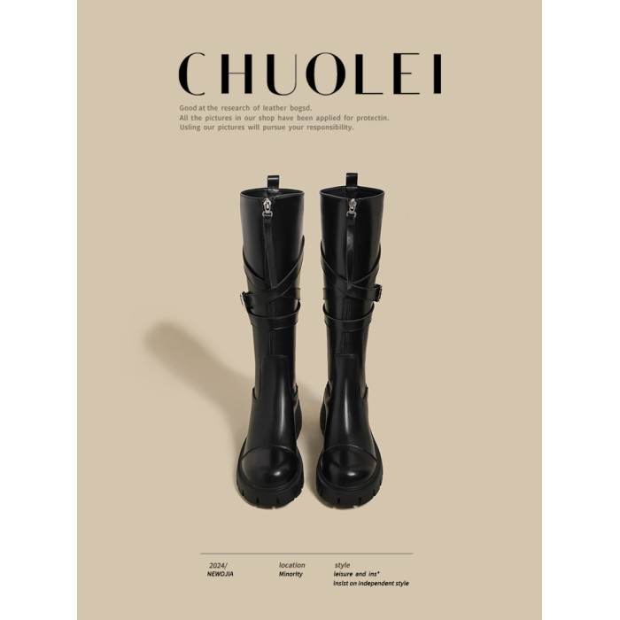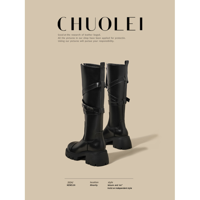黑色長筒靴女春季新款超火設計感小衆皮帶釦厚底不過膝騎士靴子