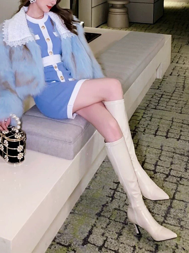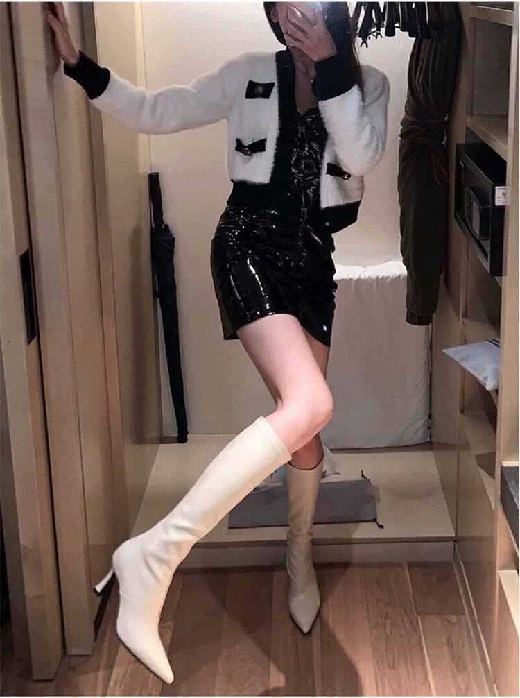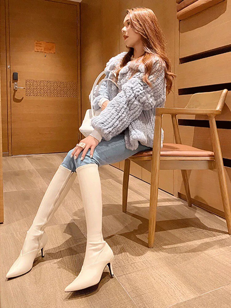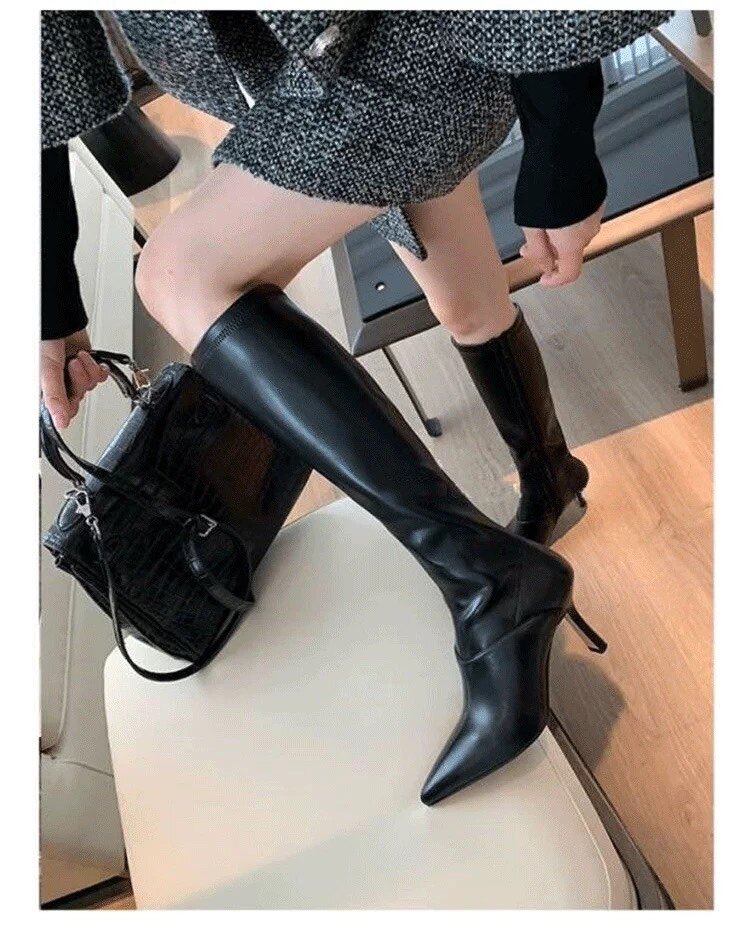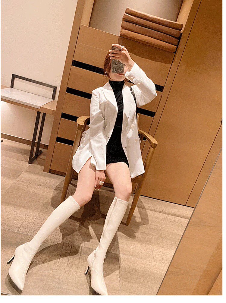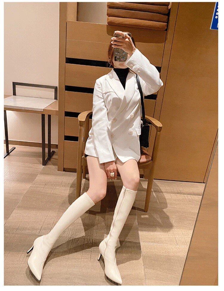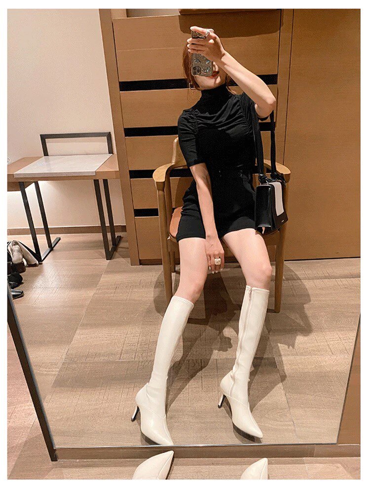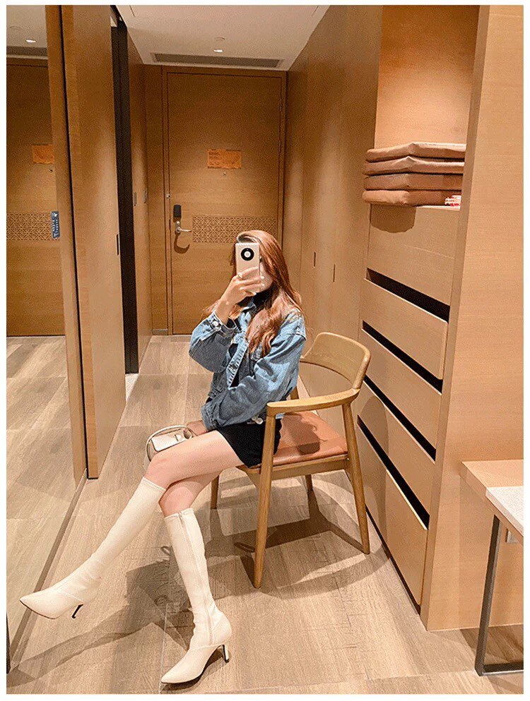 泫雅同款白色長靴女2025秋冬新款高跟瘦瘦靴百搭性感側拉鍊彈力靴