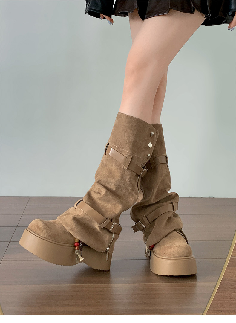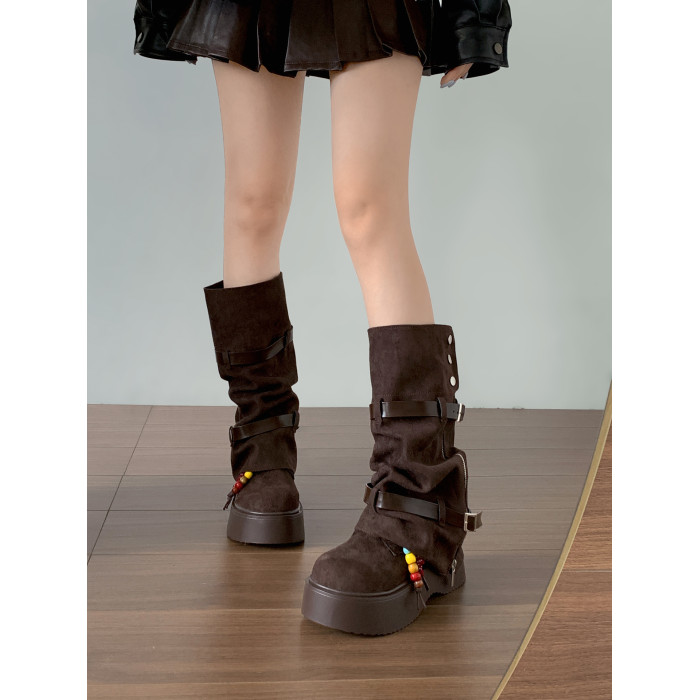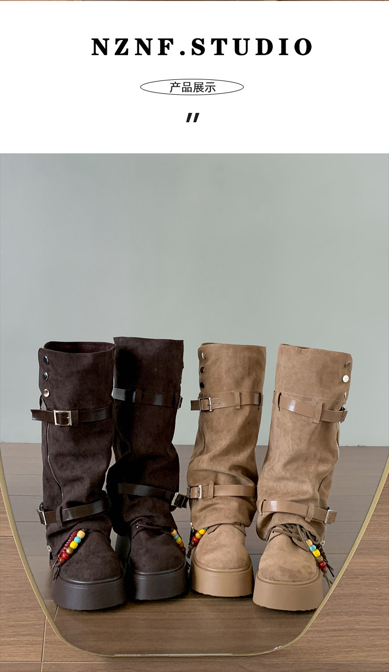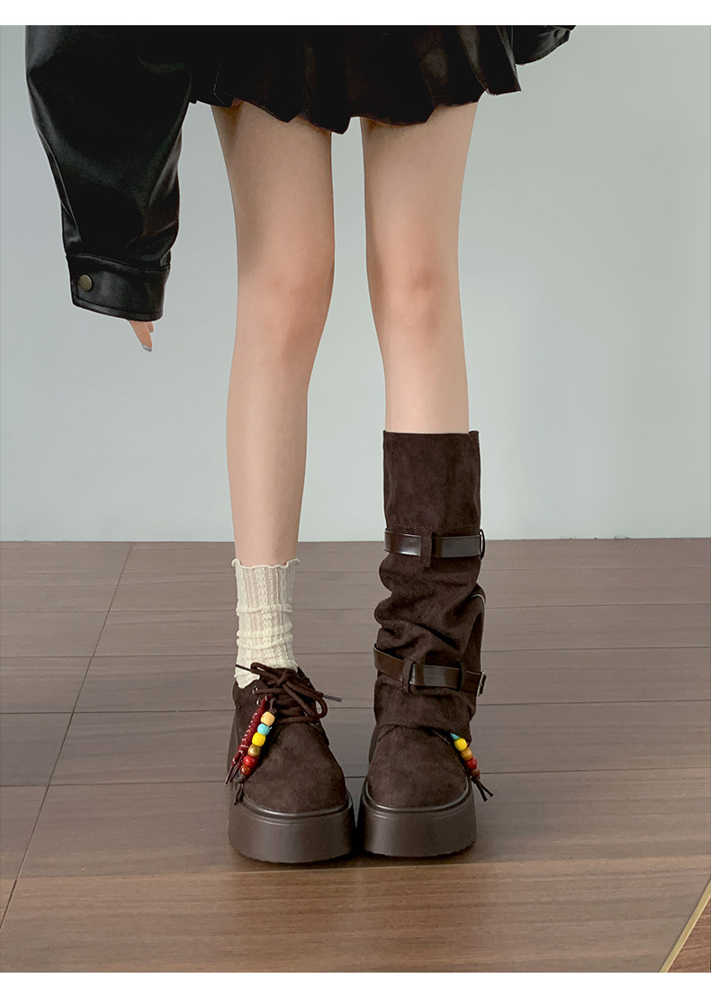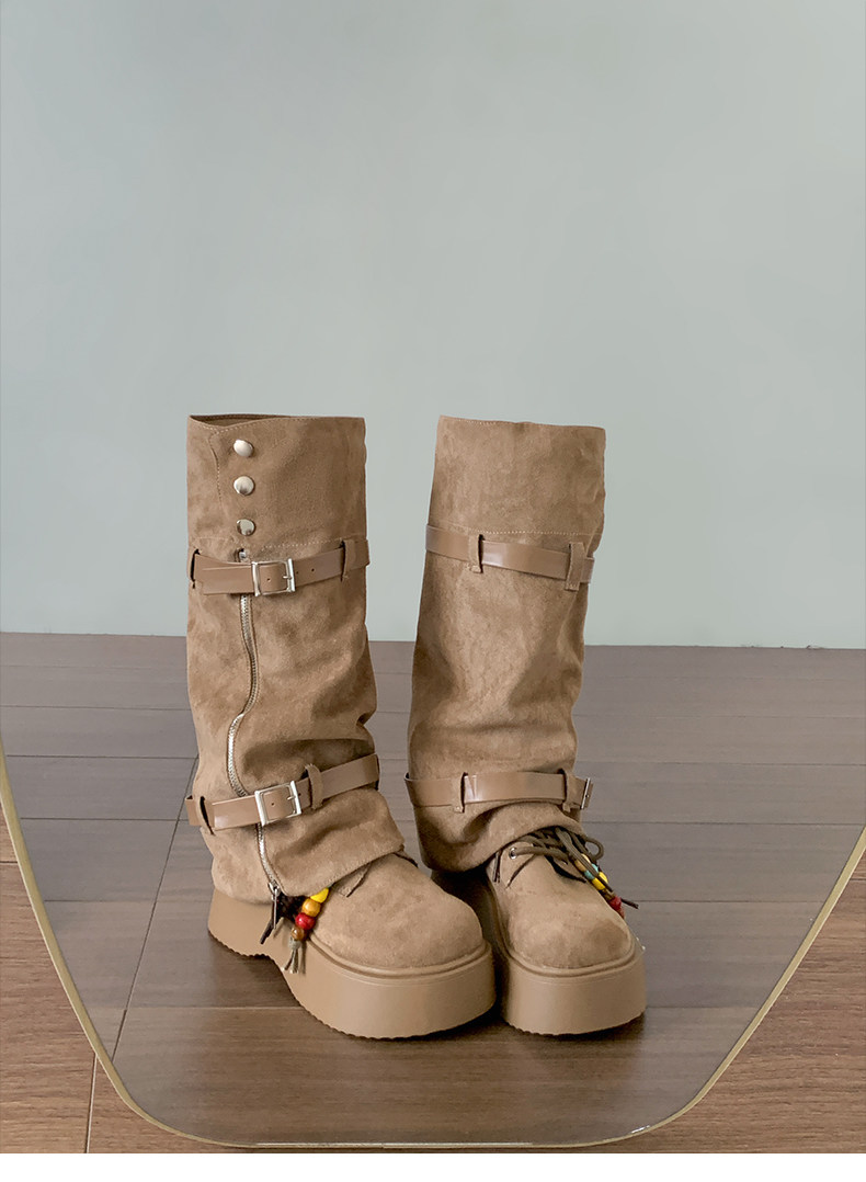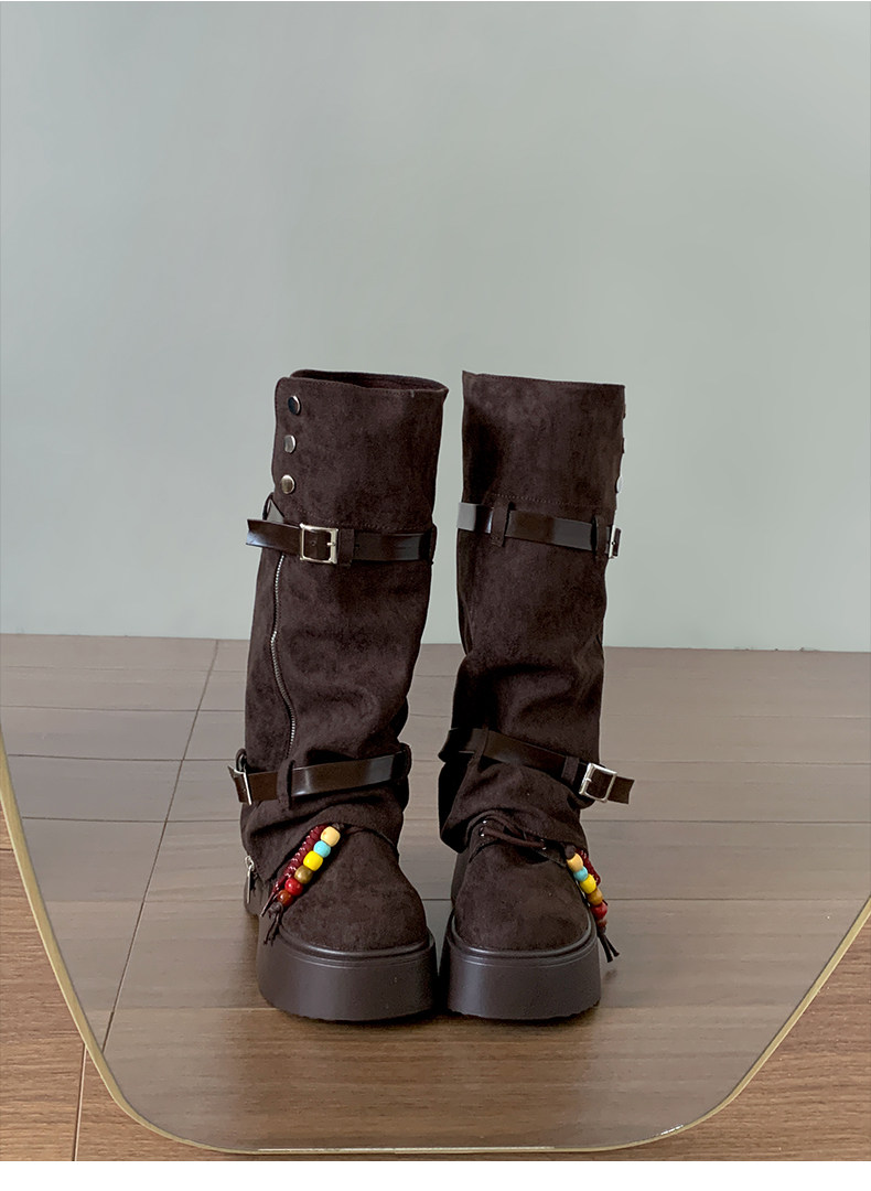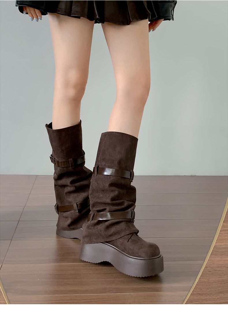 美拉德棕色復古厚底增高靴子女2025新款秋冬配裙子兩穿褲琯中筒靴