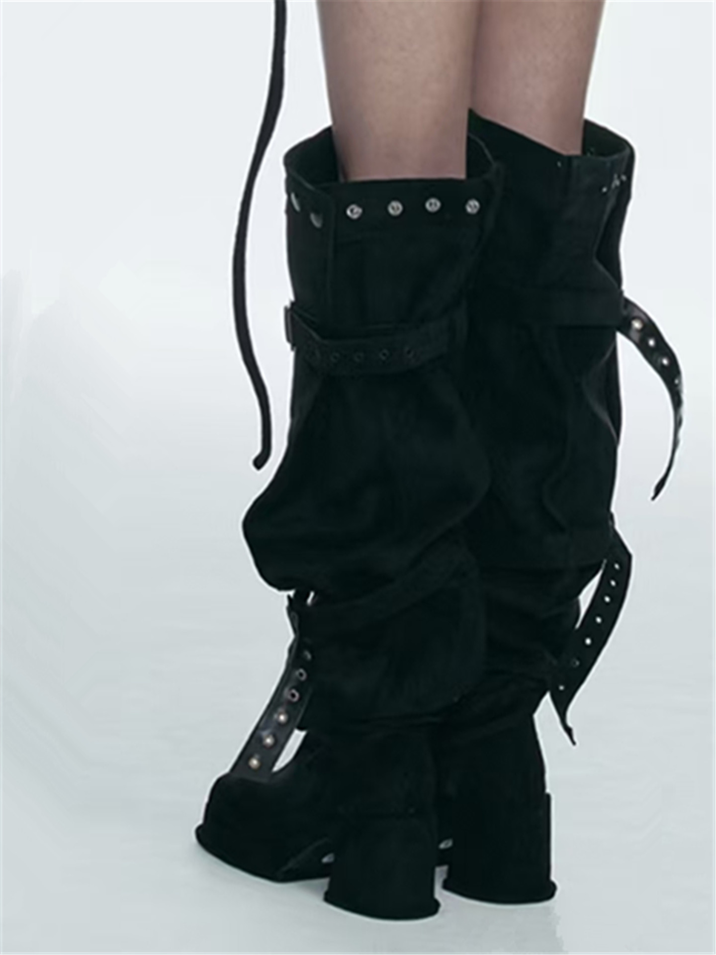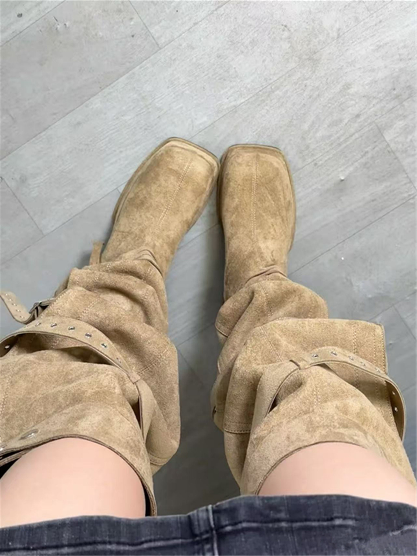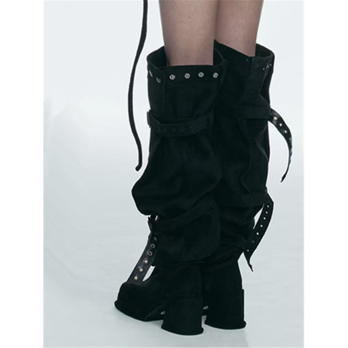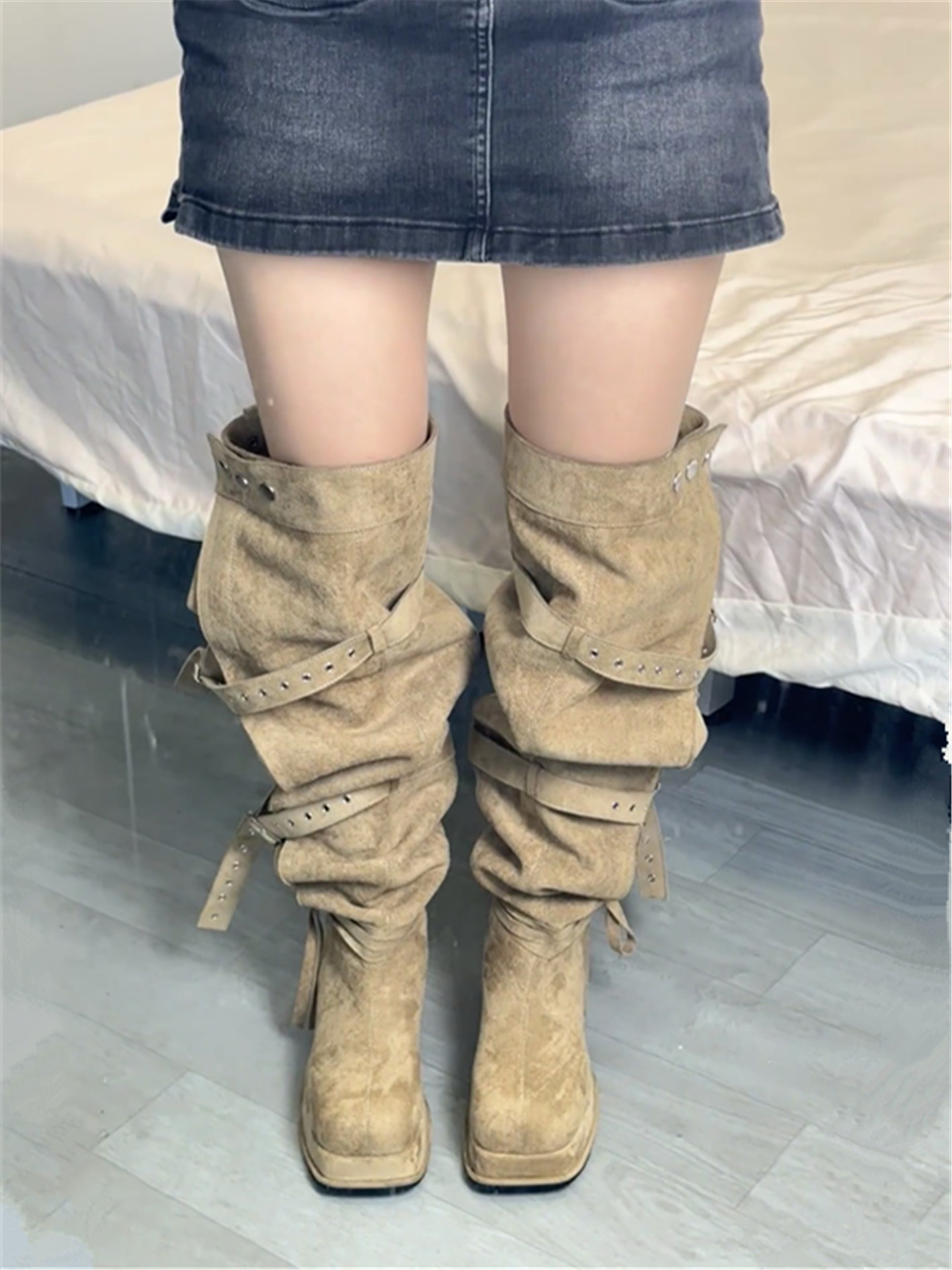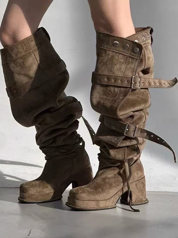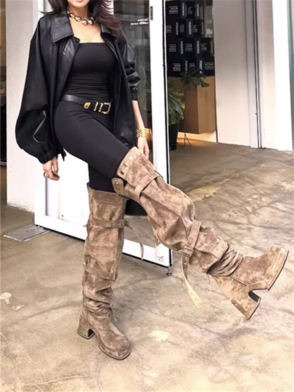 2026年新款韓版時髦大筒圍皮帶釦粗跟高跟過膝長靴可堆堆時裝靴女
