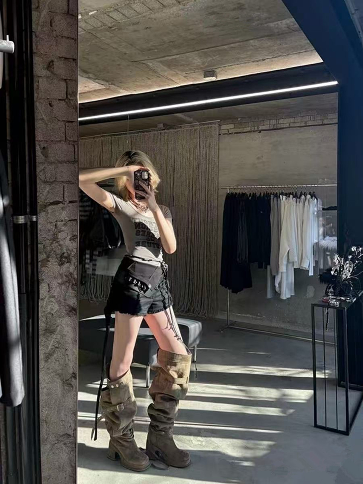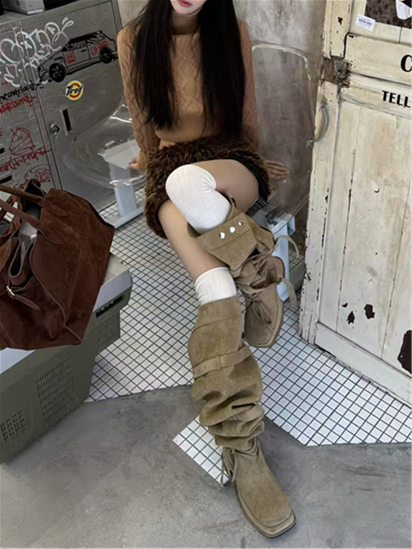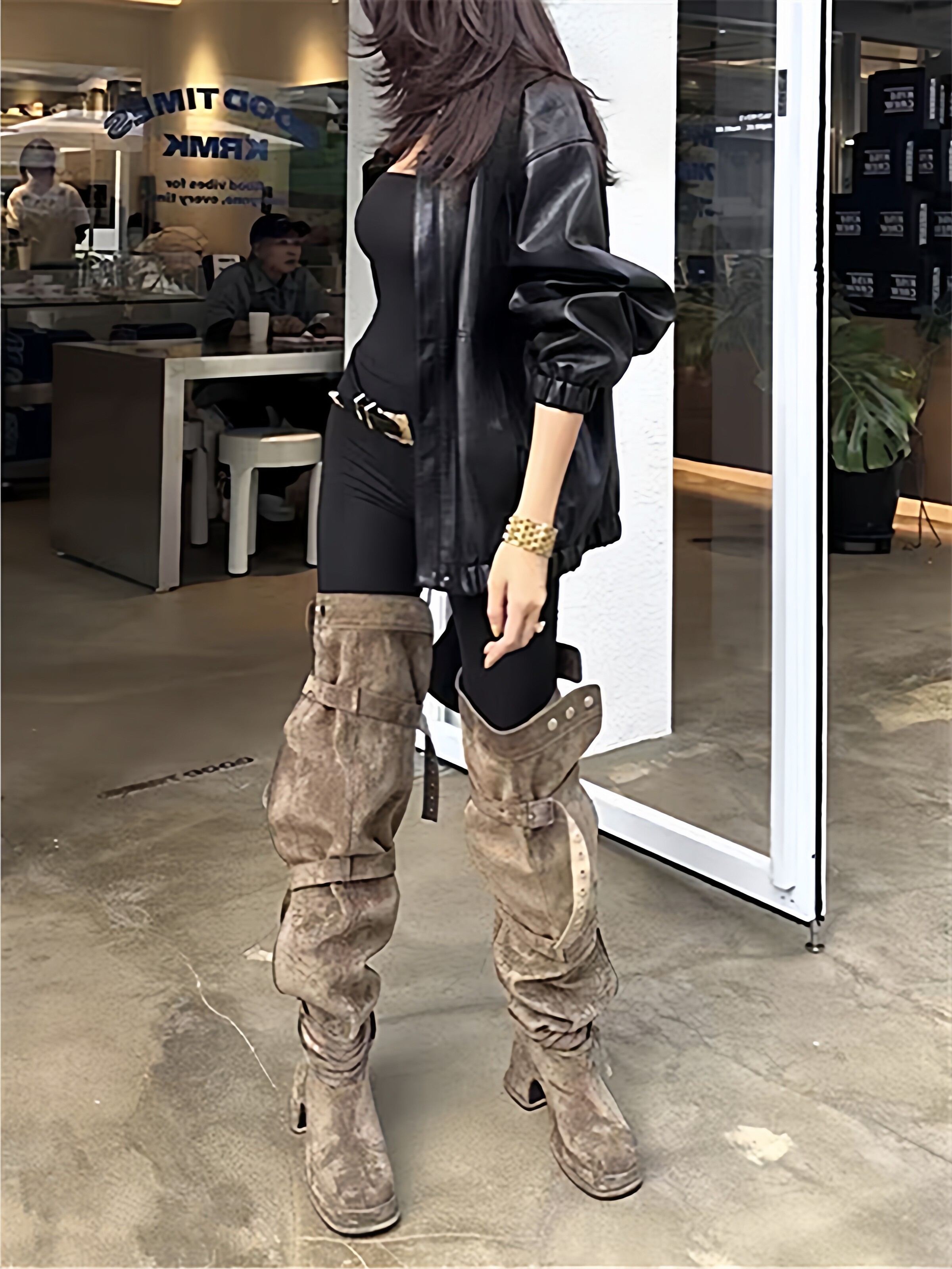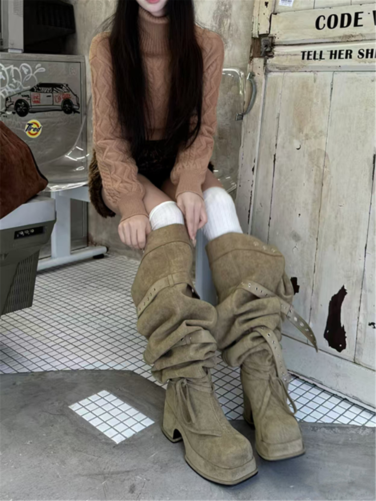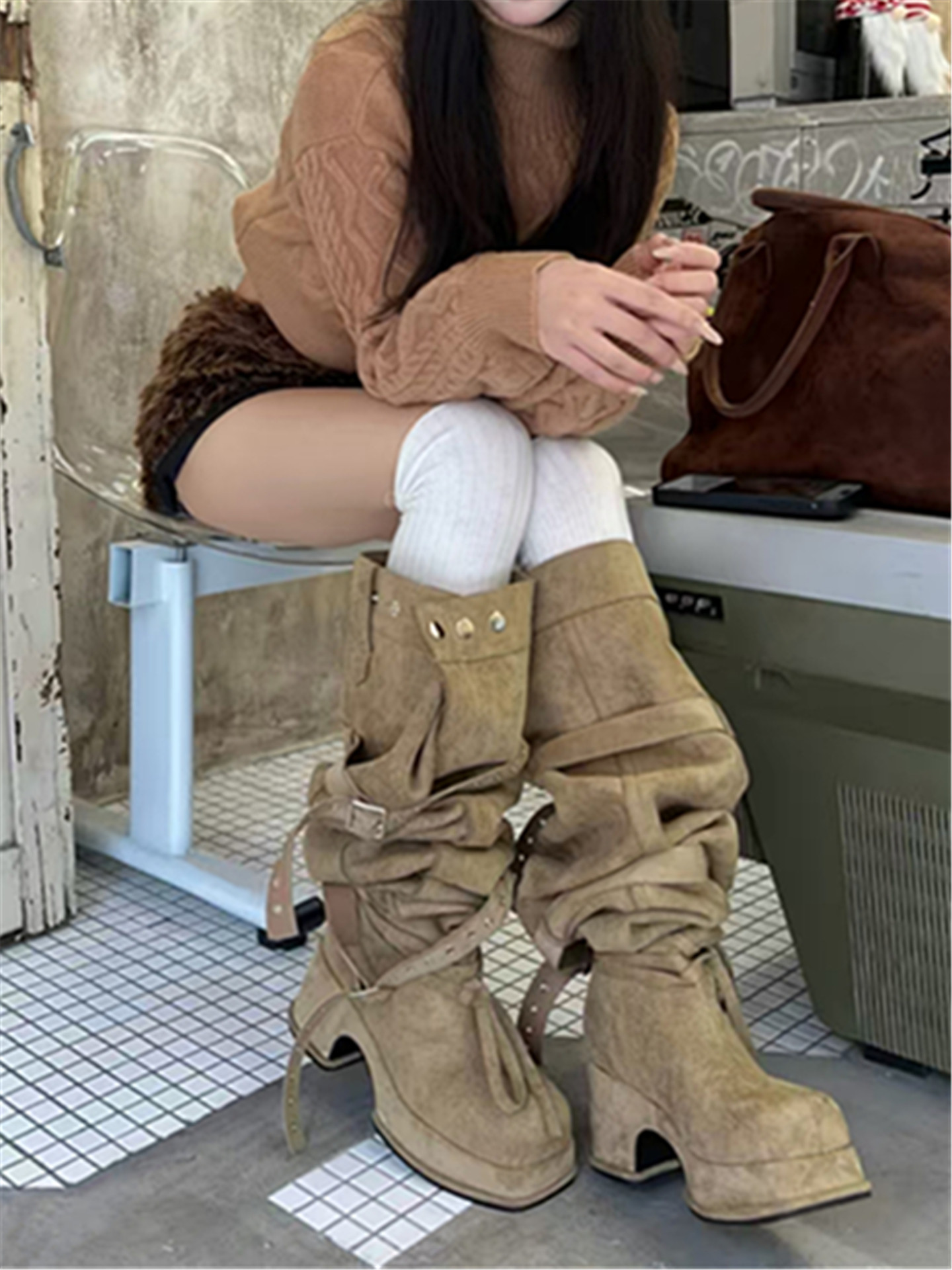 2026年新款韓版時髦大筒圍皮帶釦粗跟高跟過膝長靴可堆堆時裝靴女