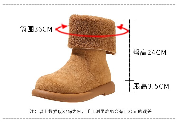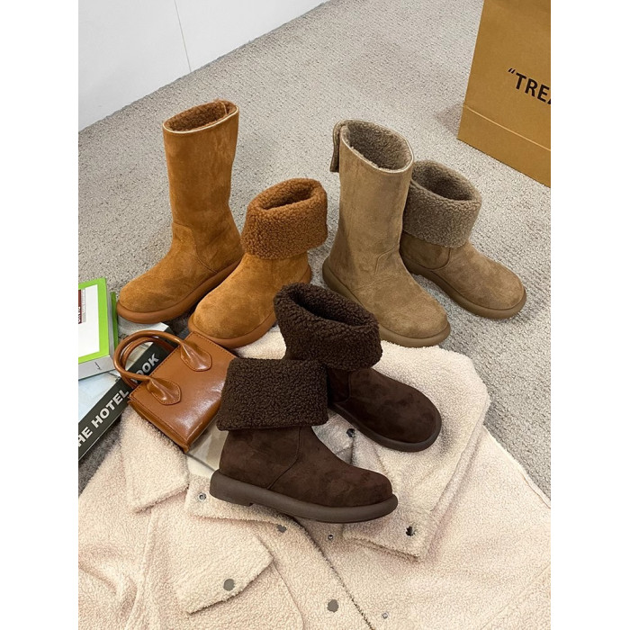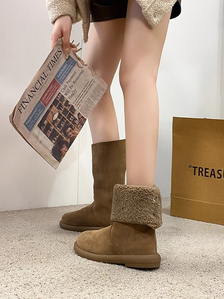 歐貨爆款純皮兩穿繙邊平跟中筒靴女冬繙毛真皮加絨雪地靴保暖棉靴