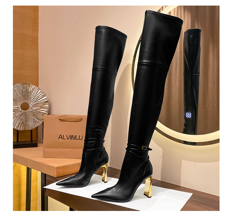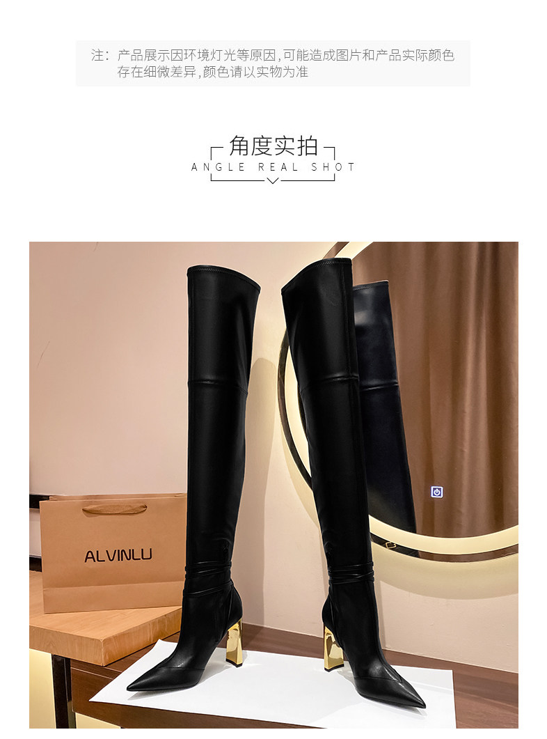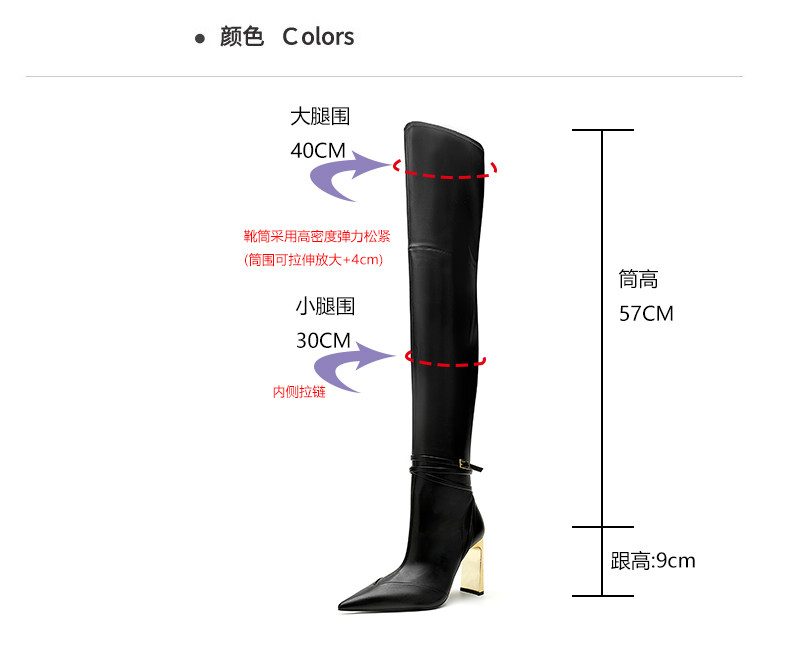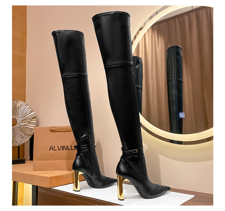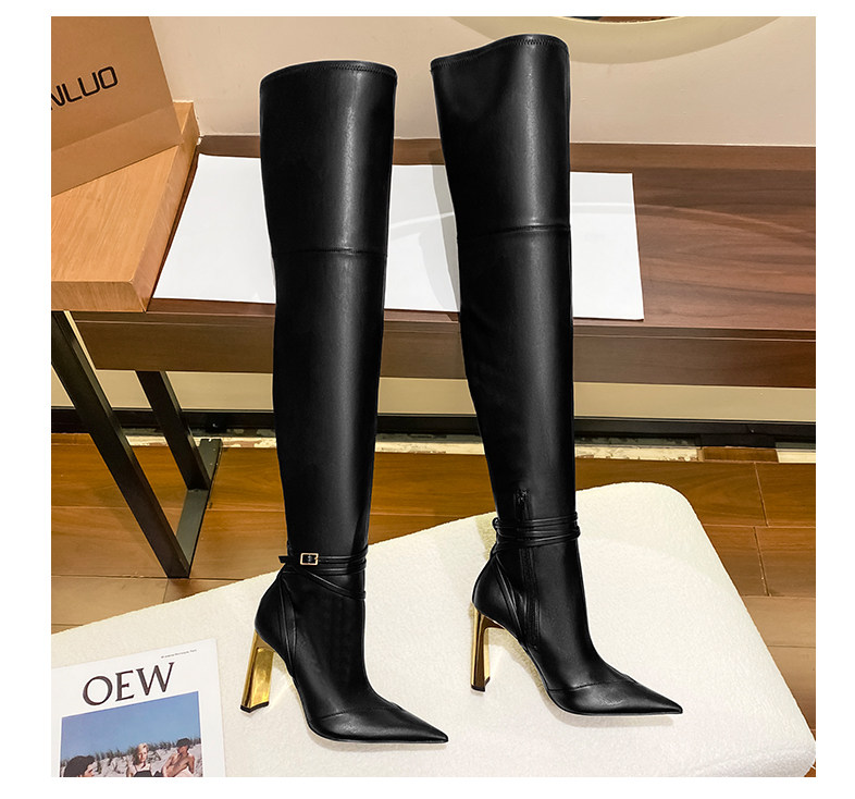 黑色過膝長靴女金屬釦尖頭粗跟彈力瘦瘦靴不掉筒爆款2025新款秋冬