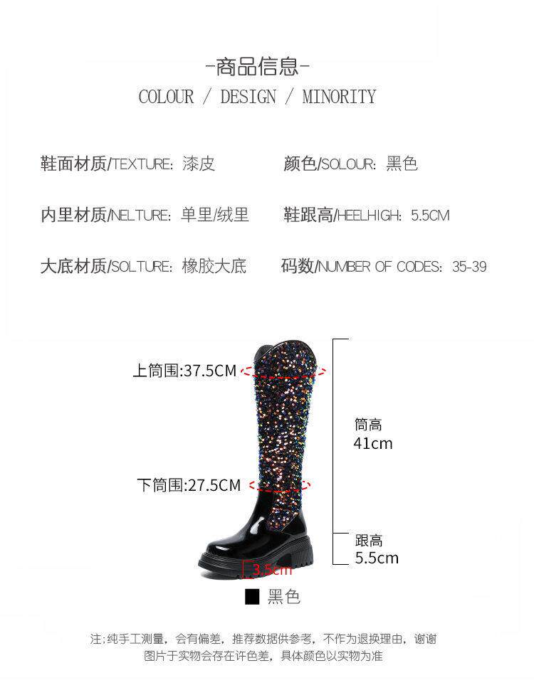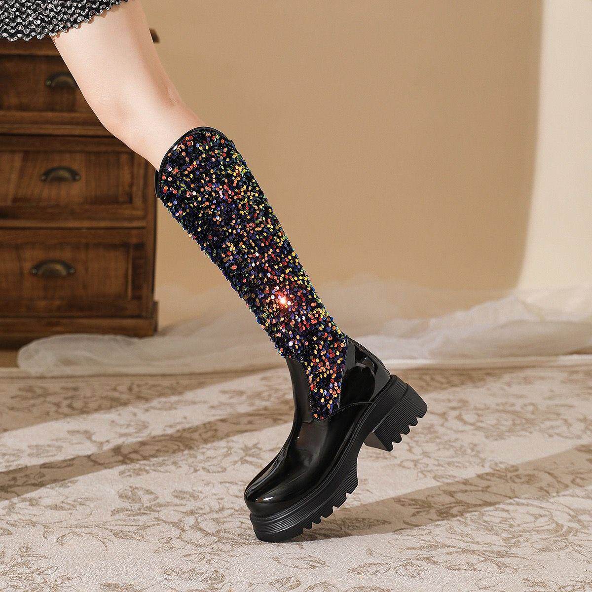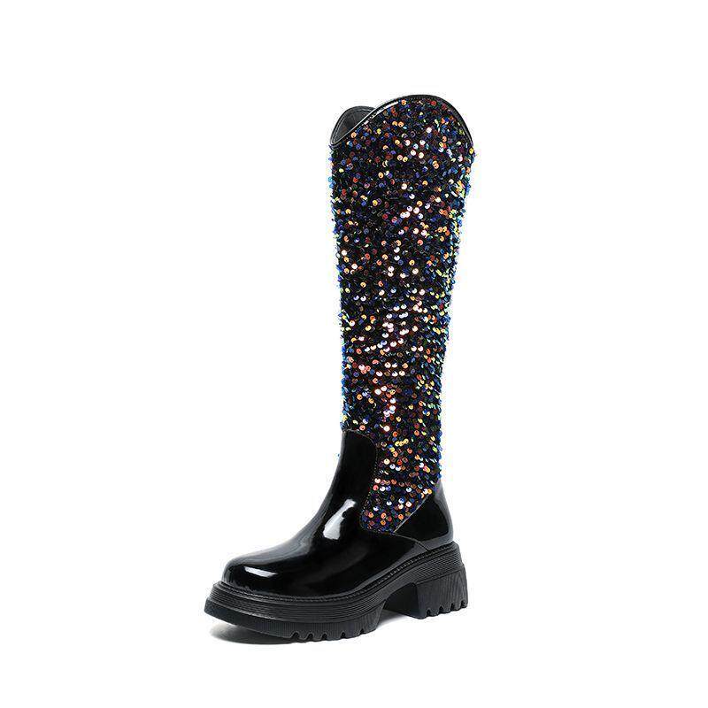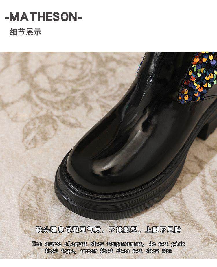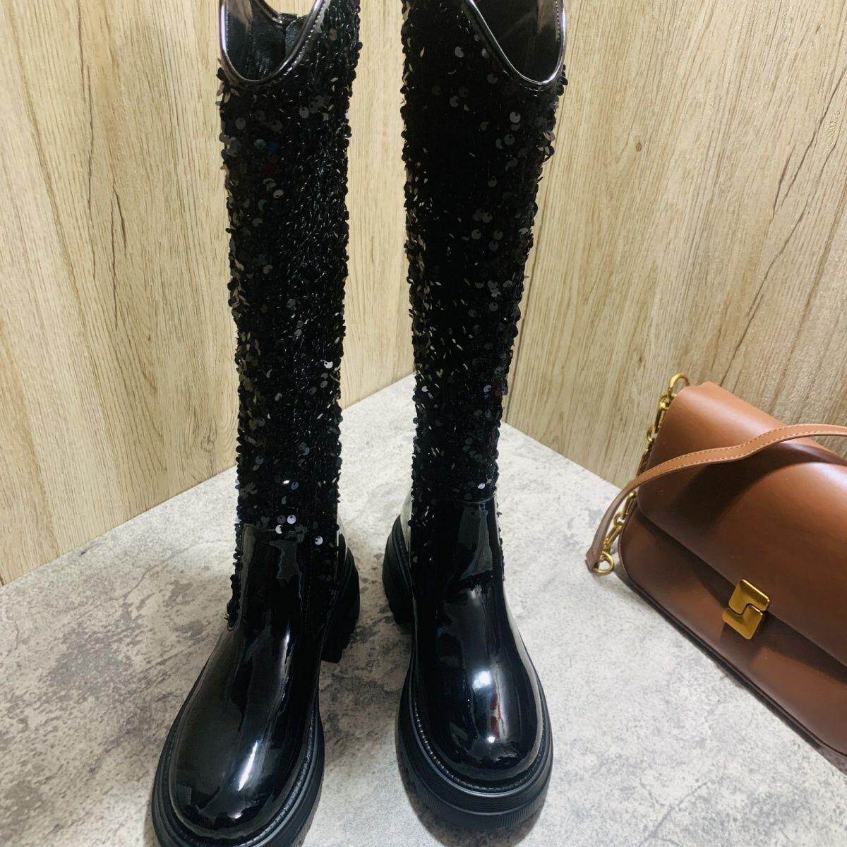 小香風歐美長筒靴網紅同款亮片馬丁靴方跟中高跟春秋走秀時尚女靴