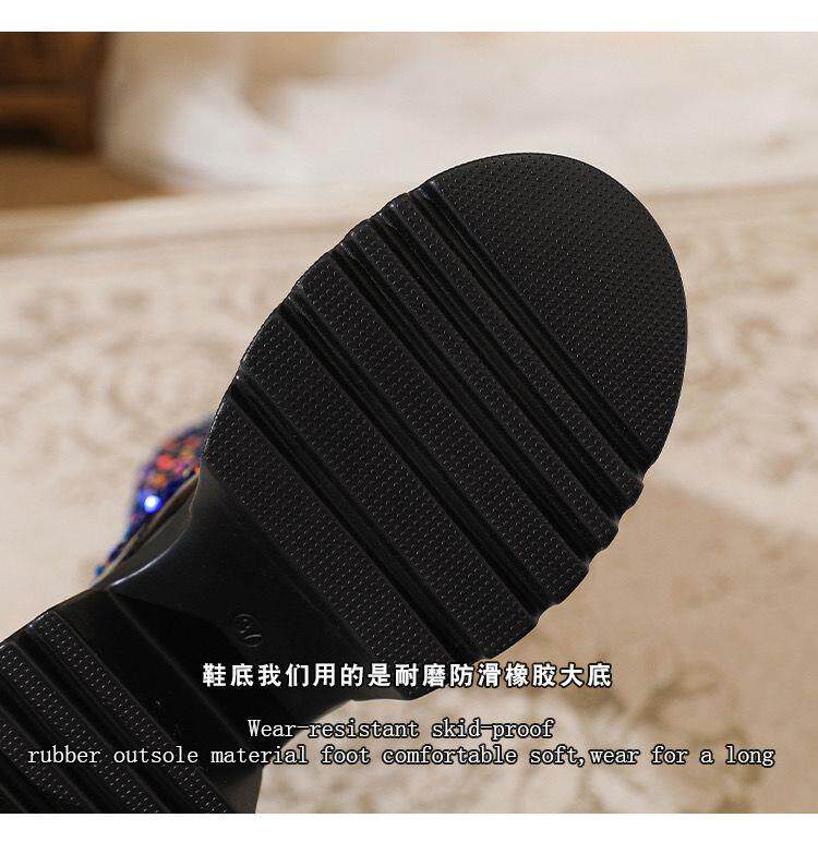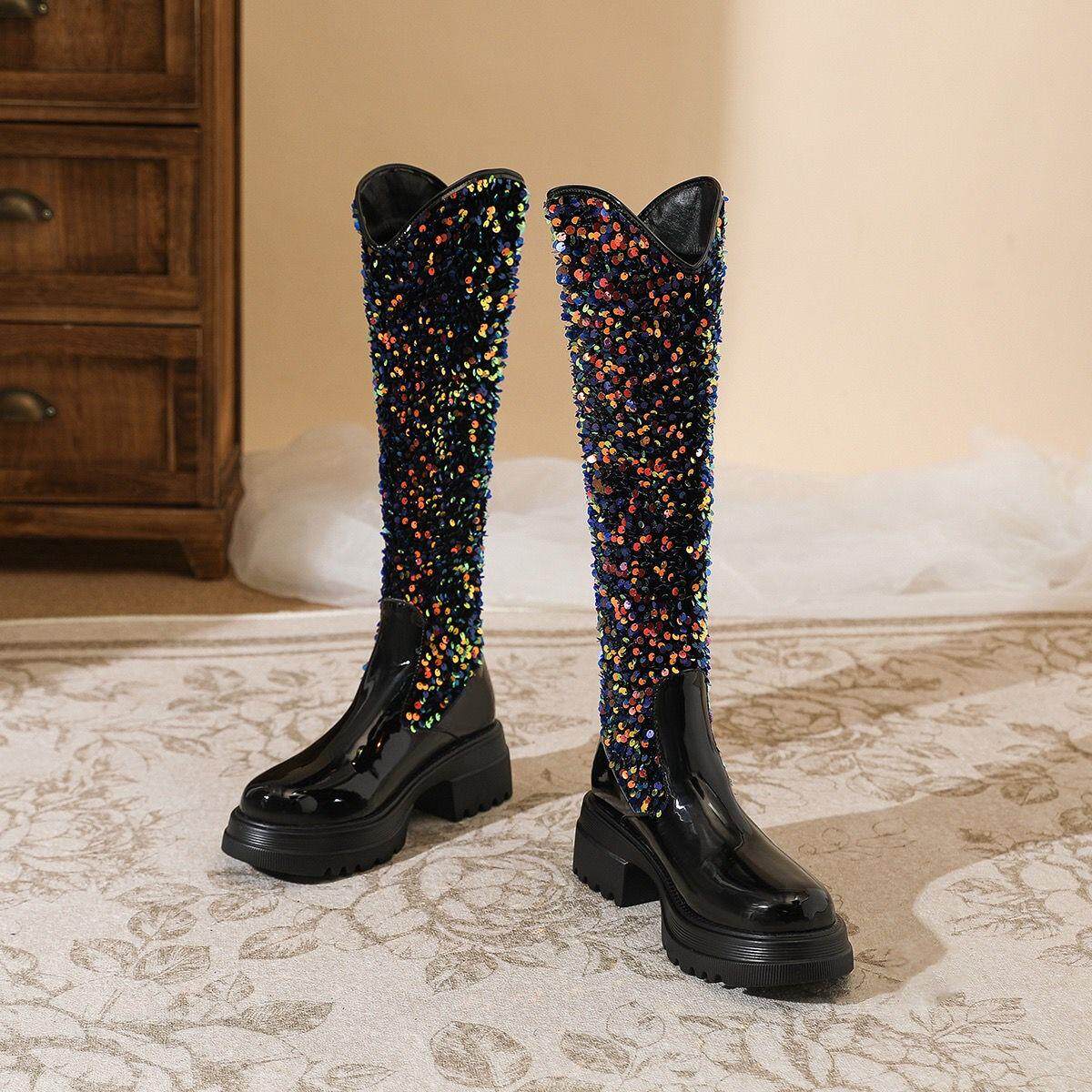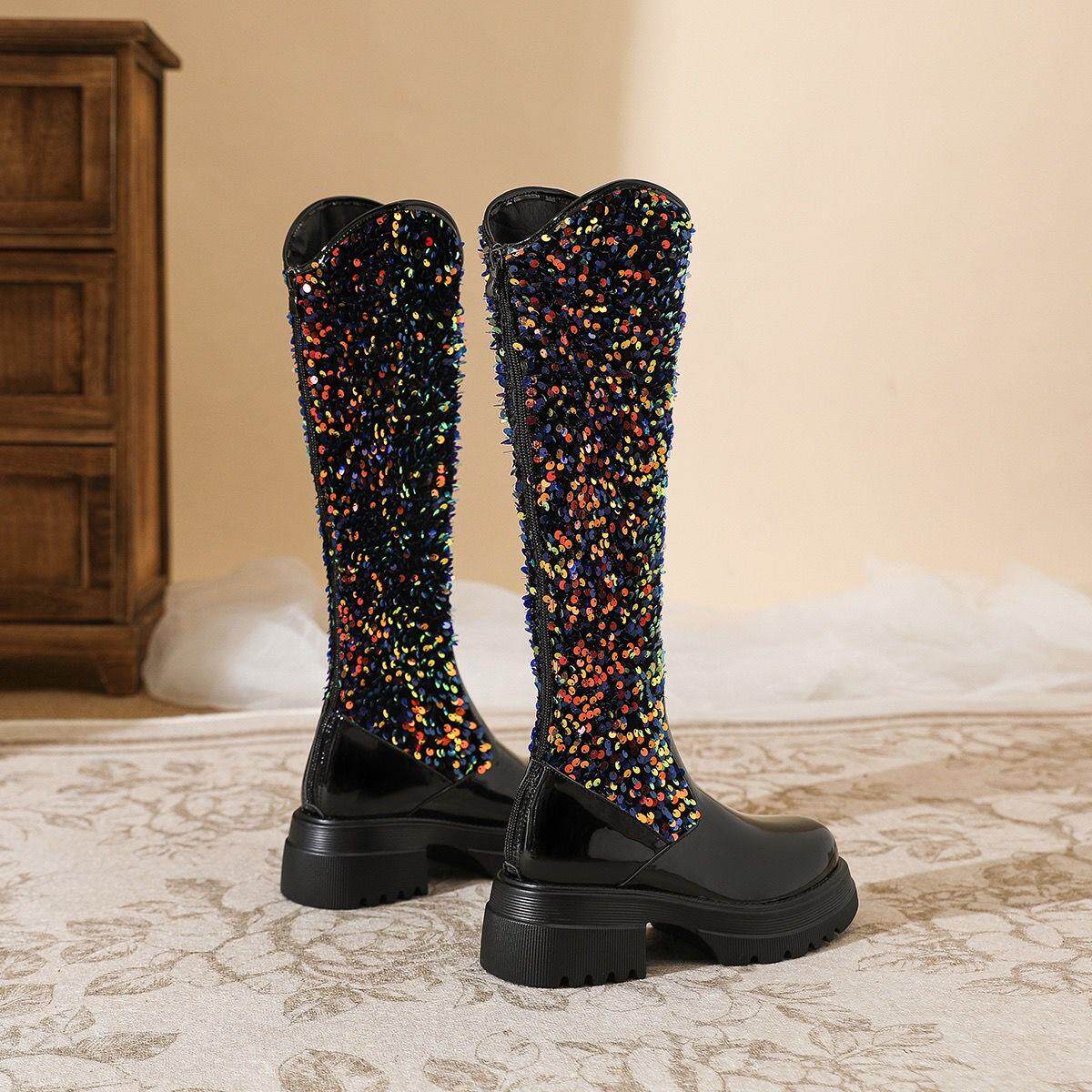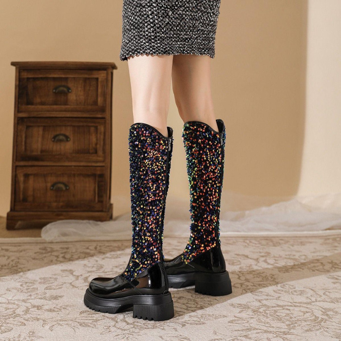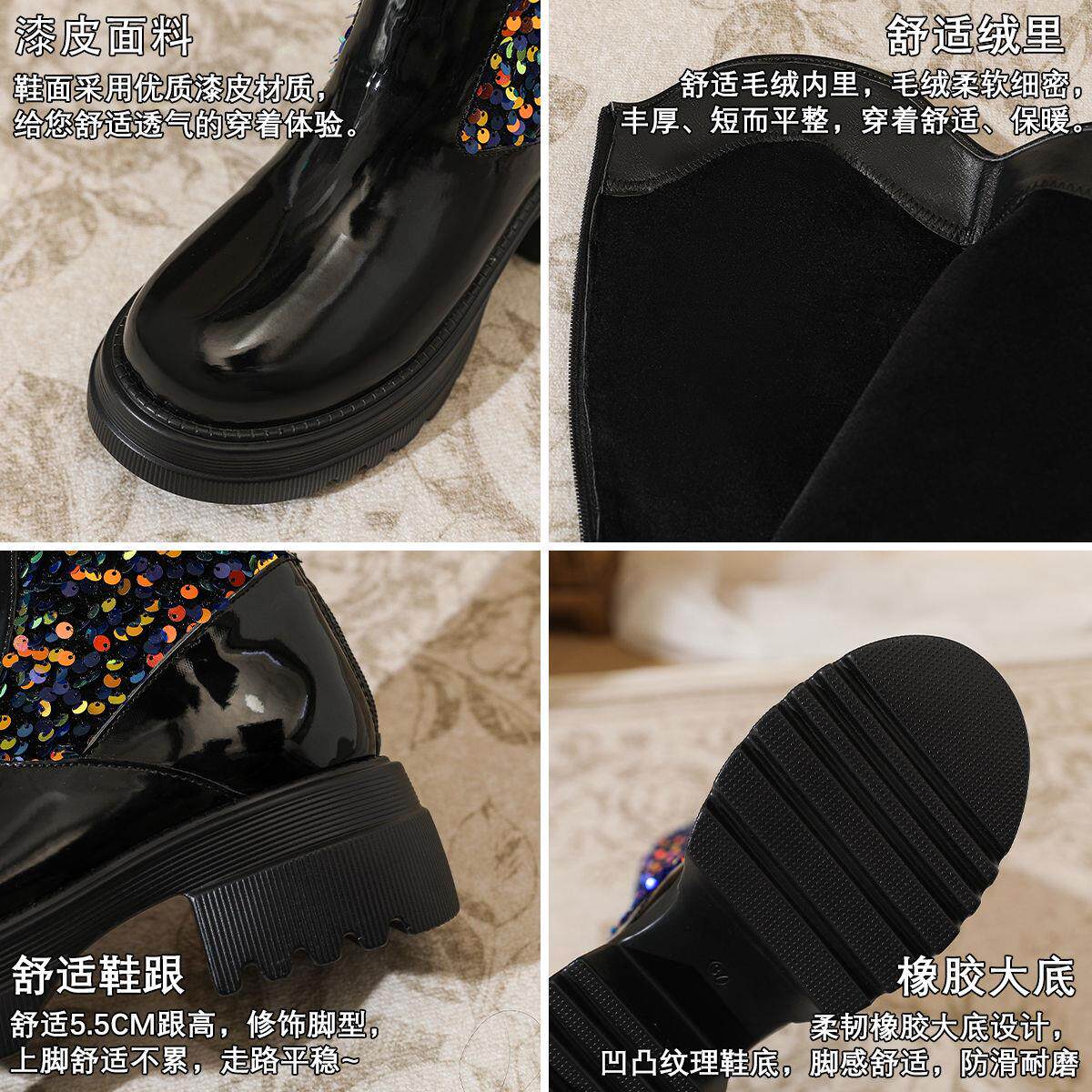 小香風歐美長筒靴網紅同款亮片馬丁靴方跟中高跟春秋走秀時尚女靴