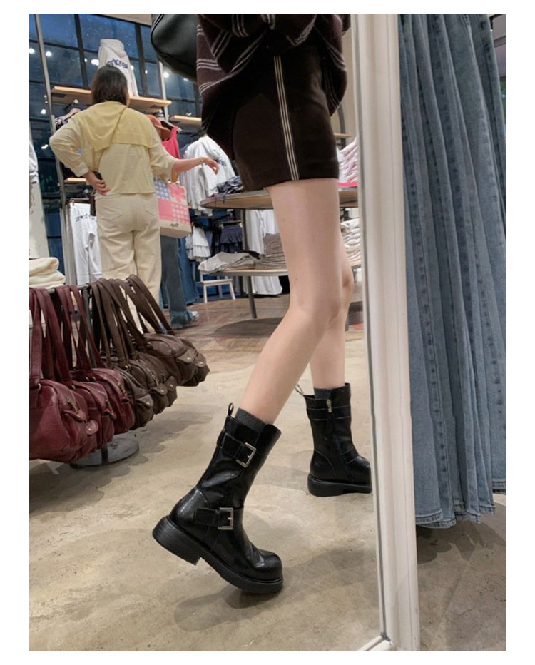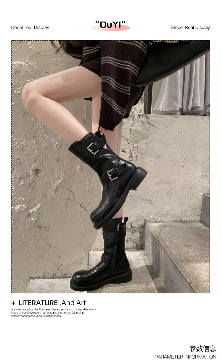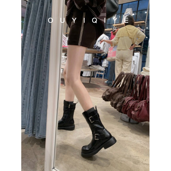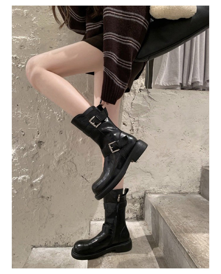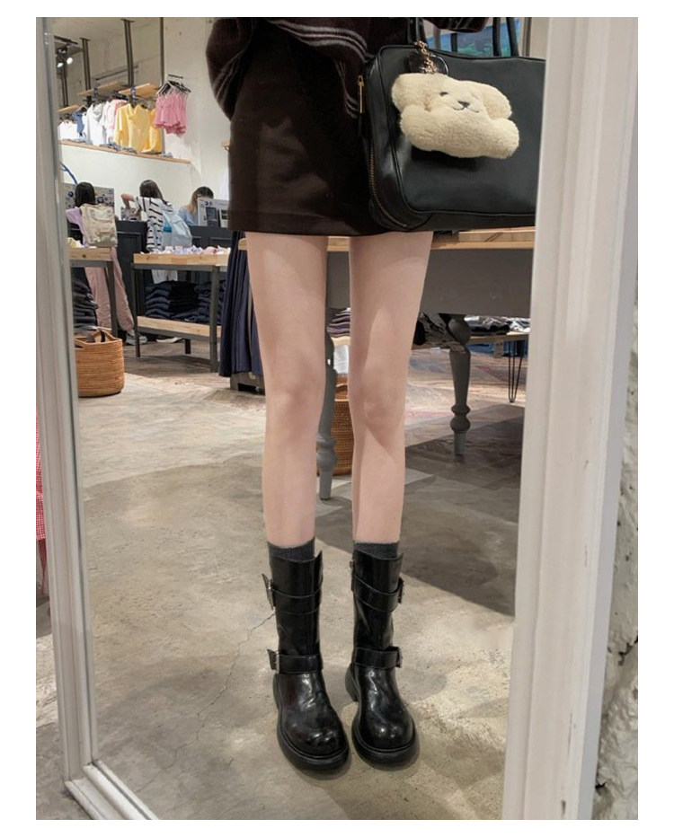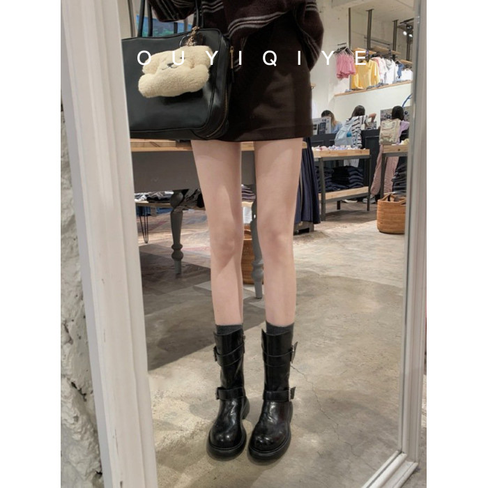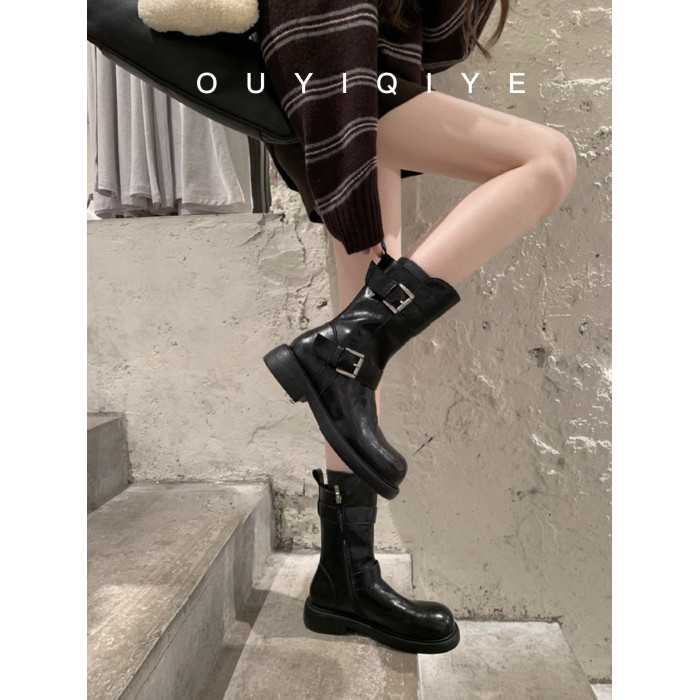 牛皮版~復古真皮中筒短靴女皮帶釦帥氣機車靴冬天新款粗跟馬丁靴