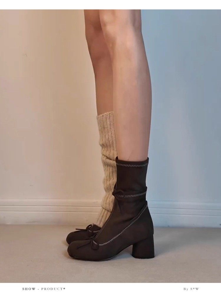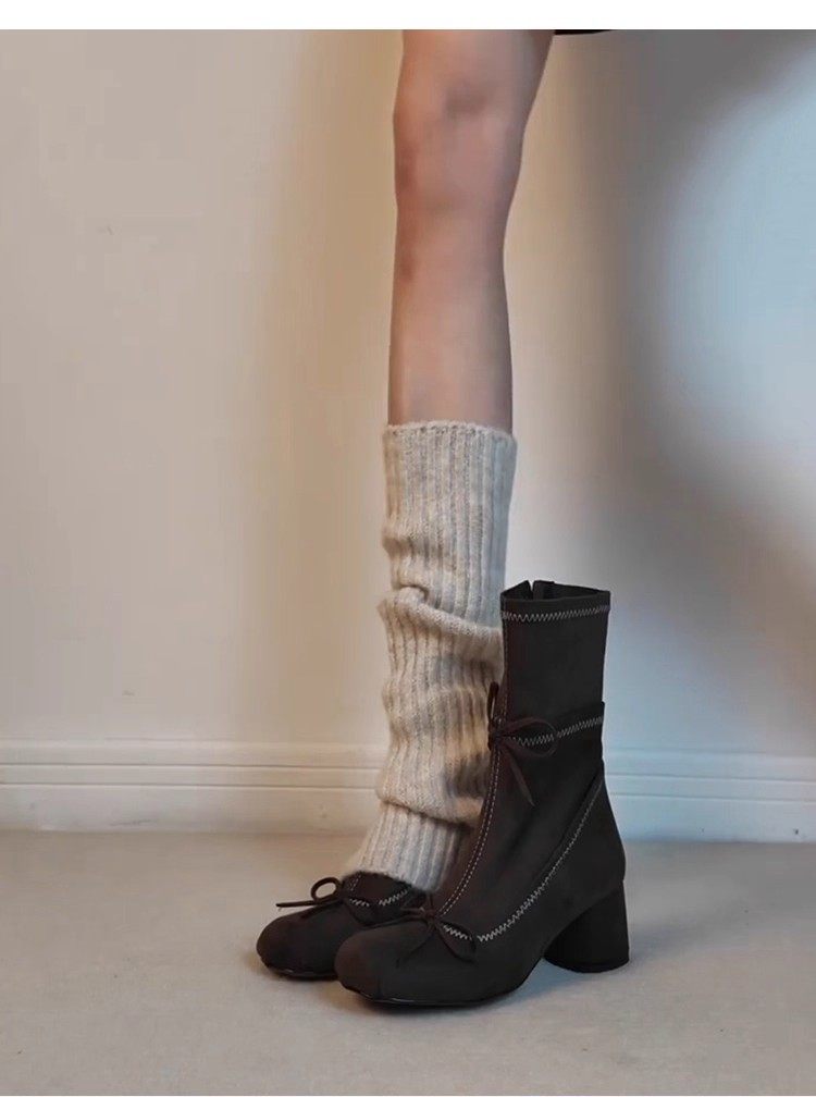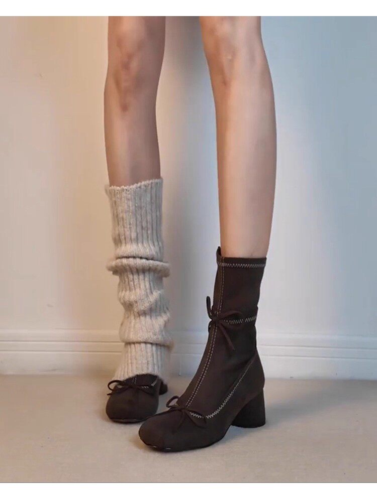 牛皮版~復古蝴蝶結芭蕾風彈力瘦瘦靴女圓頭絨面粗跟側拉鍊小短靴